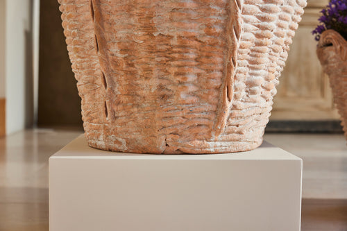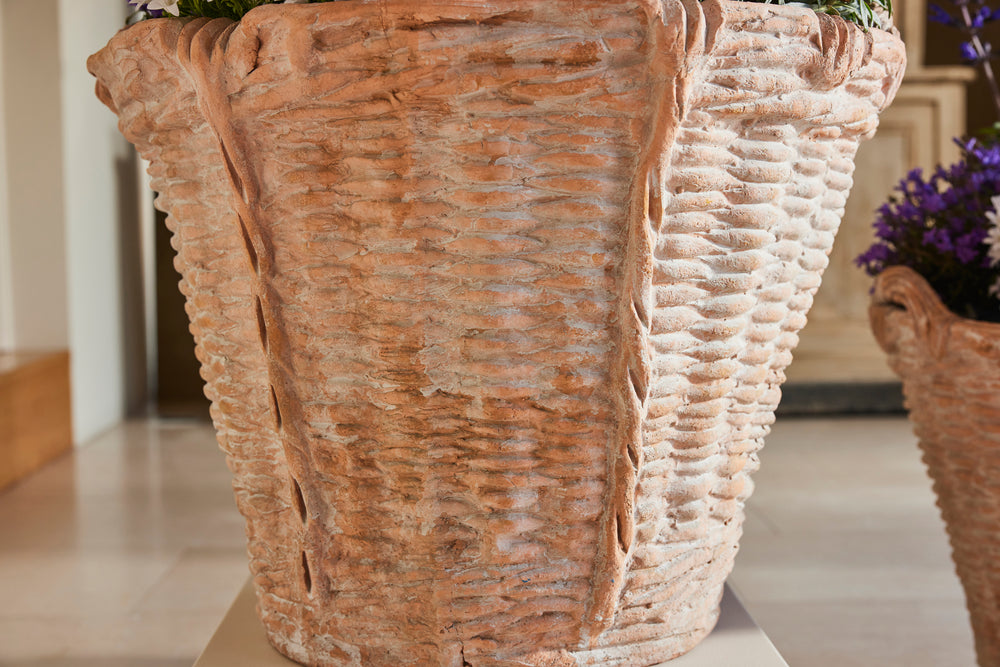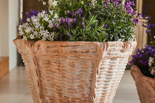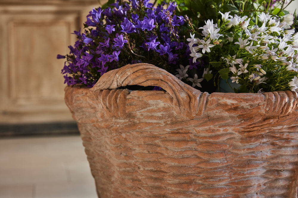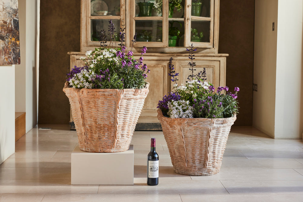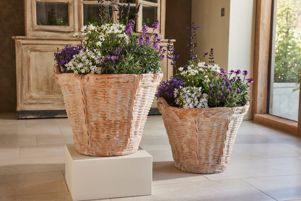 We couldn’t resist the charm of these beautifully crafted terracotta planters, inspired by the warmth and texture of woven wicker. With subtle traces of original paint still visible, they’re in excellent condition and full of character.