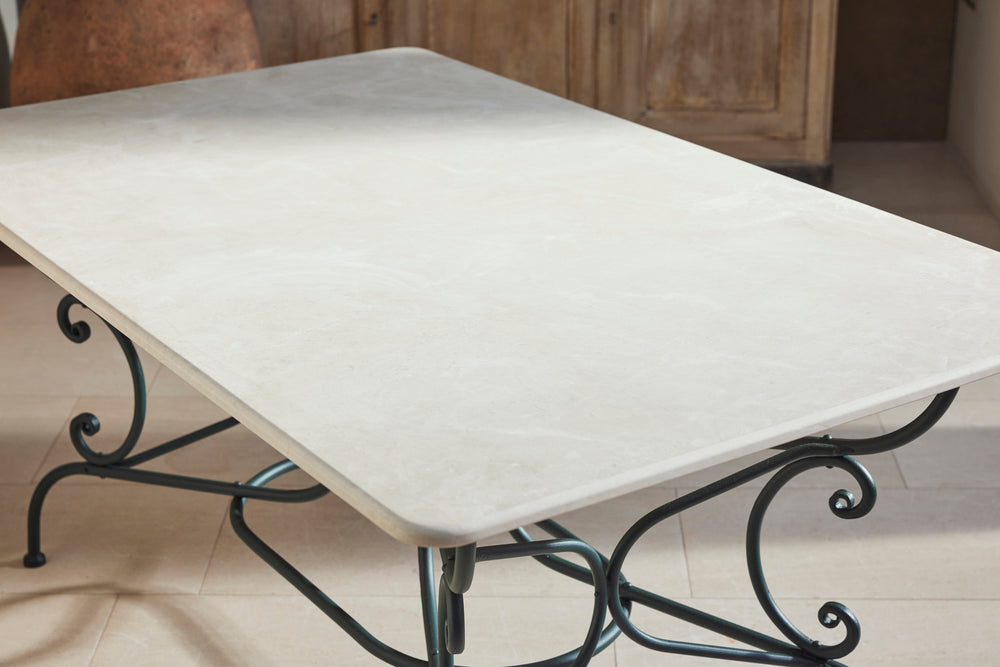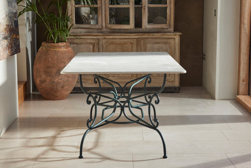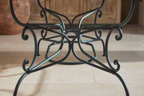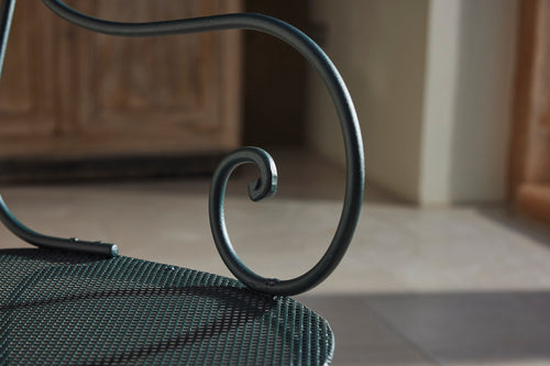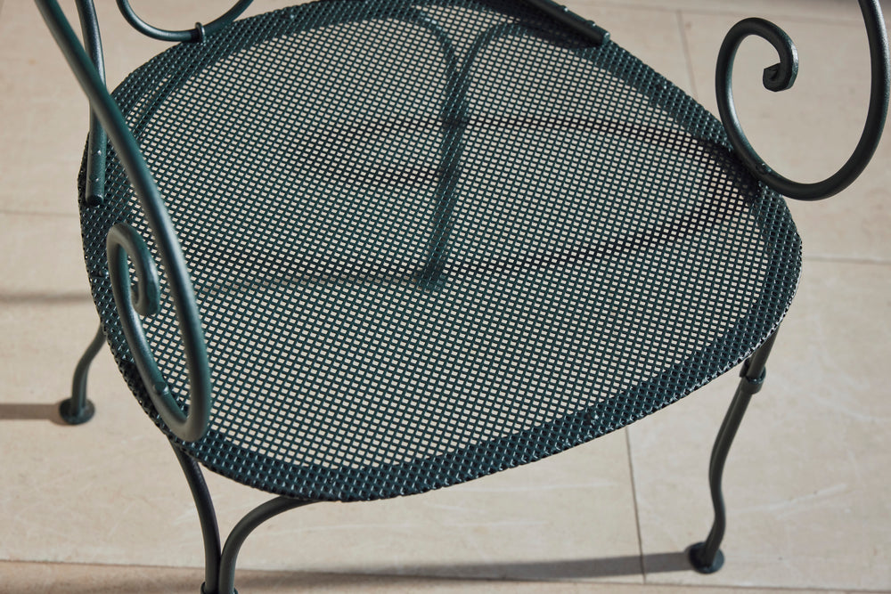 This classic Parisian wrought iron garden table dates back to the late 19th century. It has been carefully restored to its original beauty, complete with a new marble top, and is now in excellent condition. The table has with two armchairs and four matching garden chairs, featuring distinctive scrolled wrought iron backs and mesh seats. The set is generously sized and provides comfortable dining for six people, making it a perfect addition to any outdoor space.
