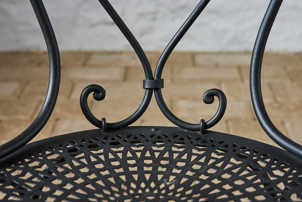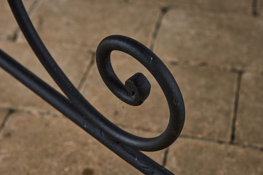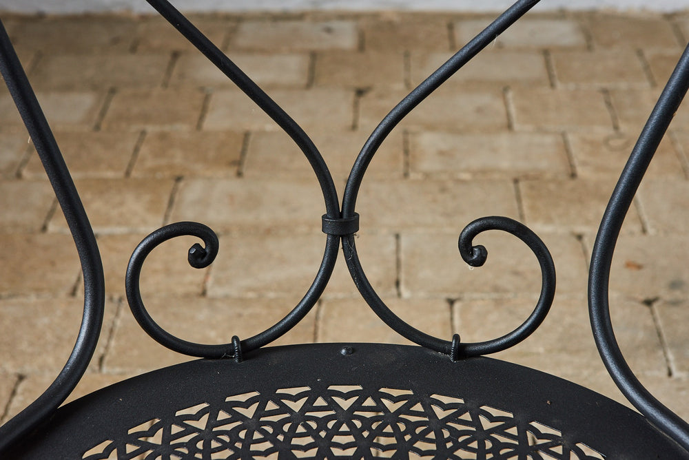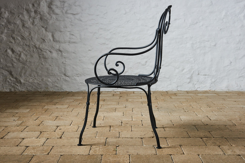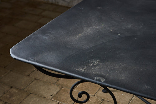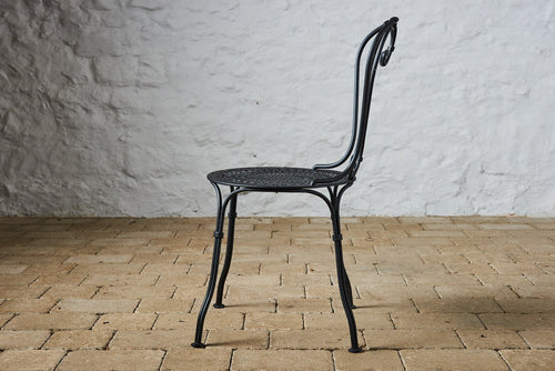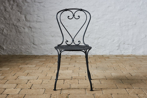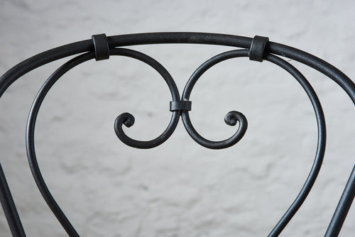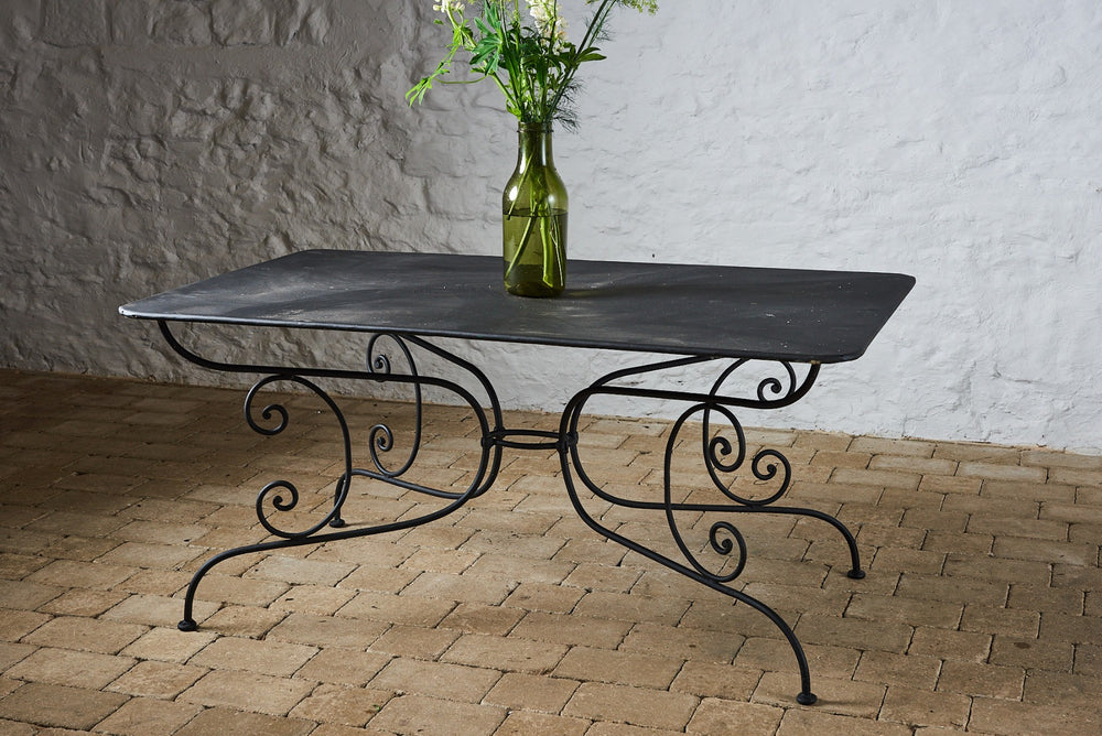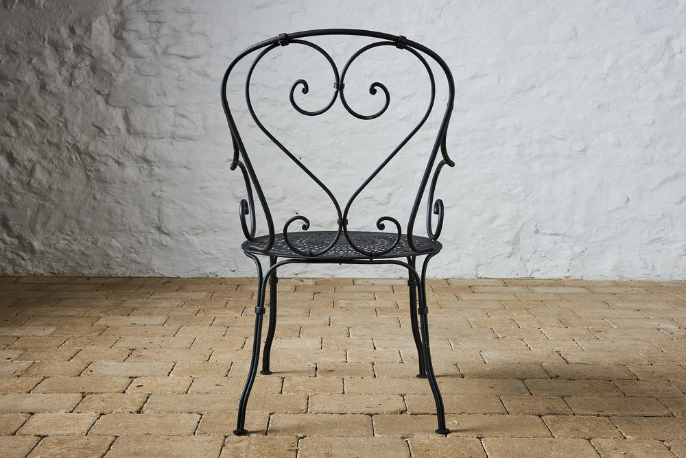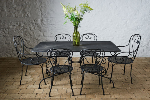 A Parisian table and chairs in a dead flat black finish. Consisting of a rectangular table which is big enough to easily sit six the set comes with two carvers and four chairs. The chairs are all hand forged with an attractive heart-shaped frame and a stamped metal seat. The table again hand made has a wrought iron frame and a sheet metal top. In good condition with only minor signs of wear and tear, completely consistent with age and use this set would look good in both a contemporary or traditional setting.