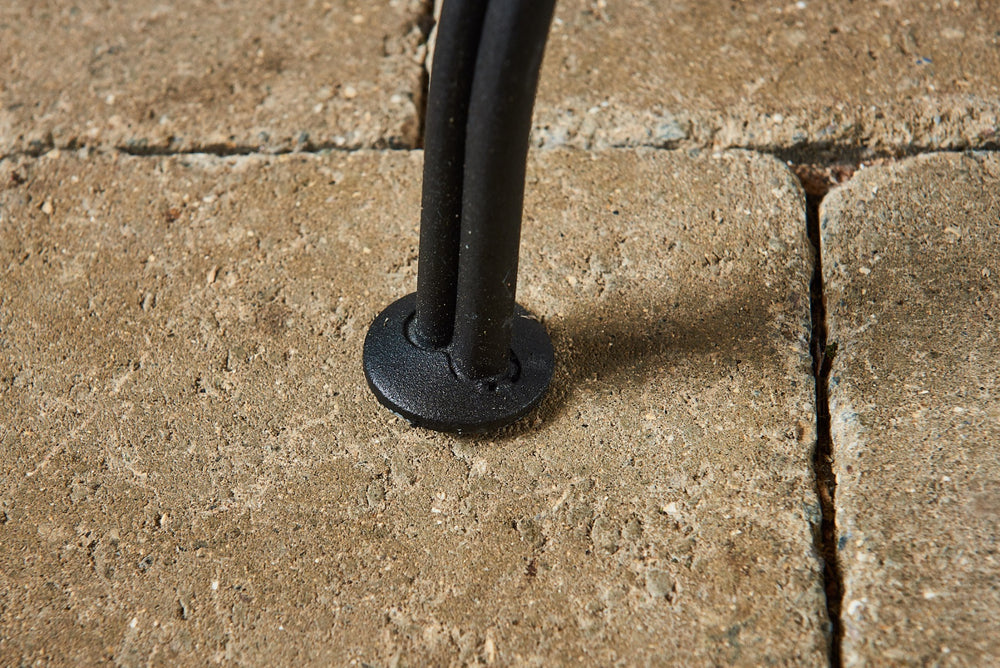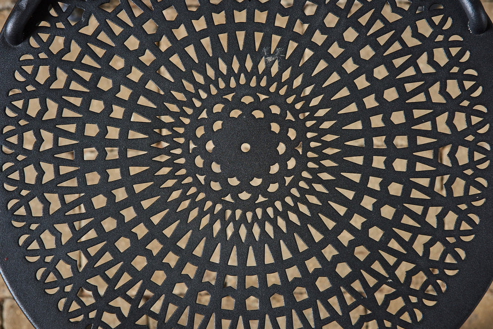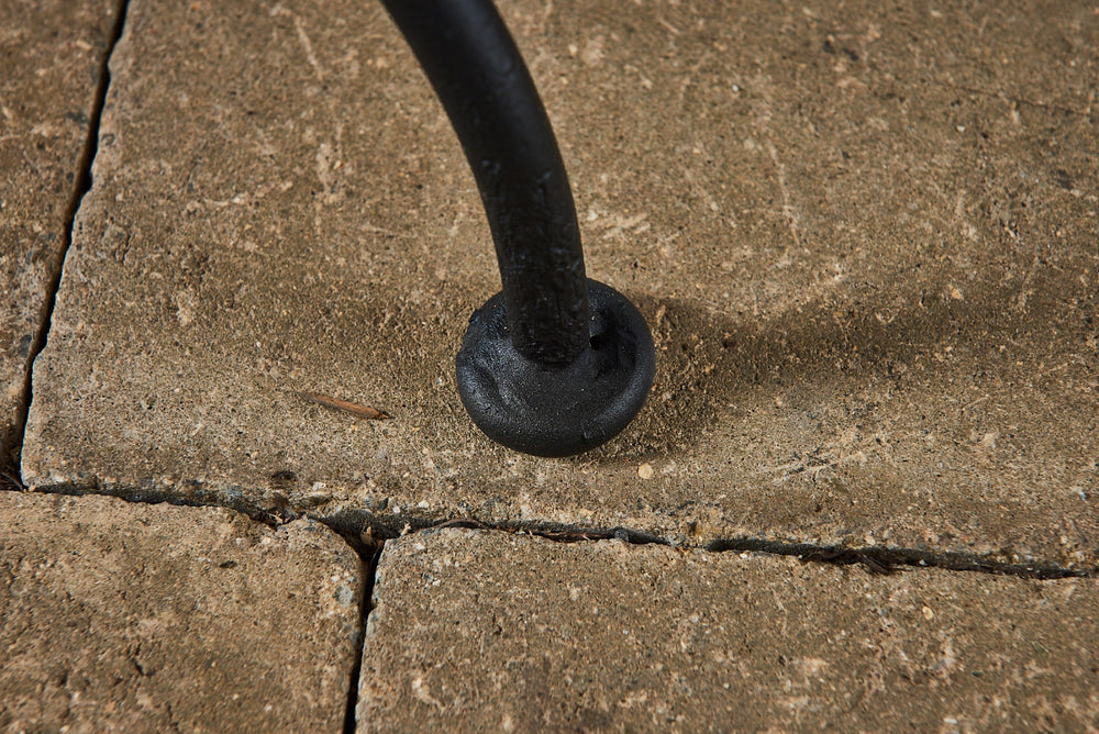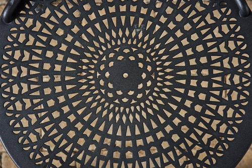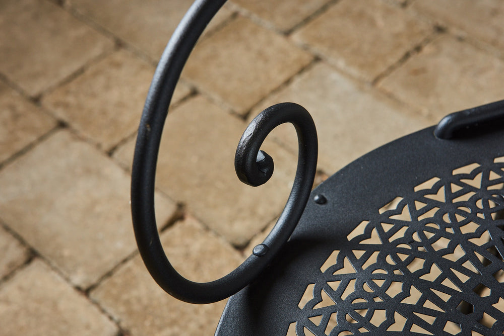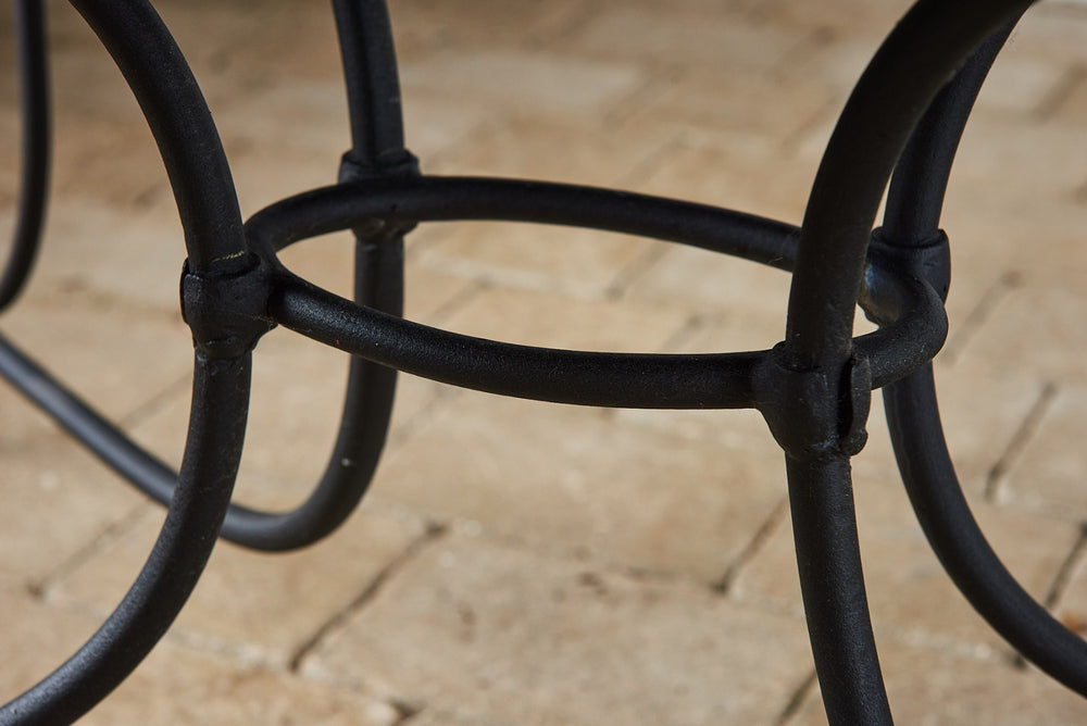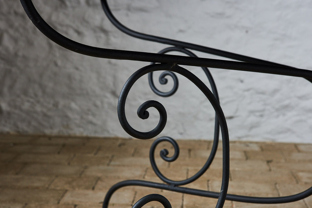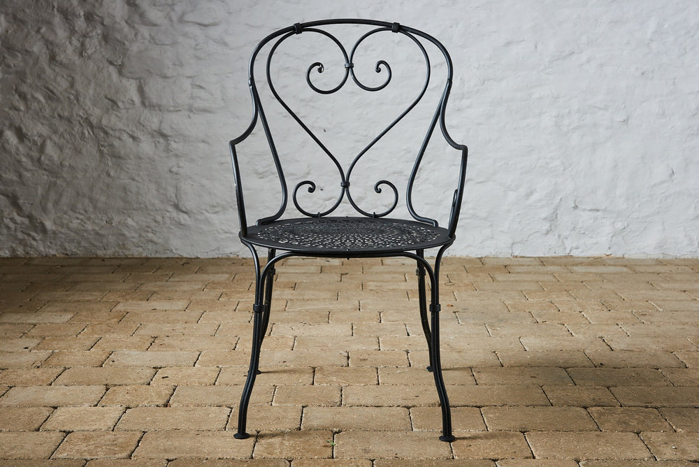A Parisian table and chairs in a dead flat black finish. Consisting of a rectangular table which is big enough to easily sit six the set comes with two carvers and four chairs. The chairs are all hand forged with an attractive heart-shaped frame and a stamped metal seat. The table again hand made has a wrought iron frame and a sheet metal top. In good condition with only minor signs of wear and tear, completely consistent with age and use this set would look good in both a contemporary or traditional setting.