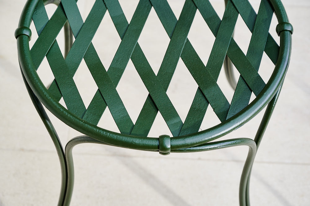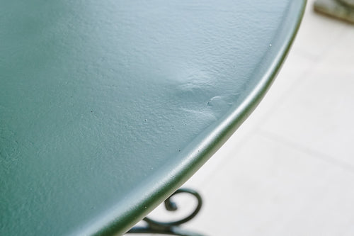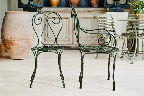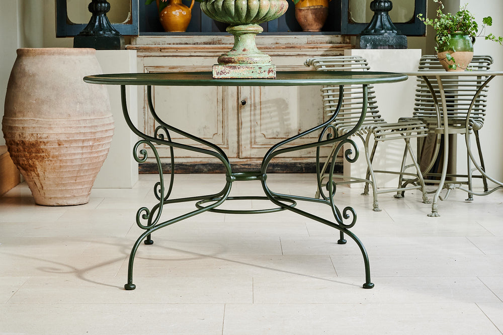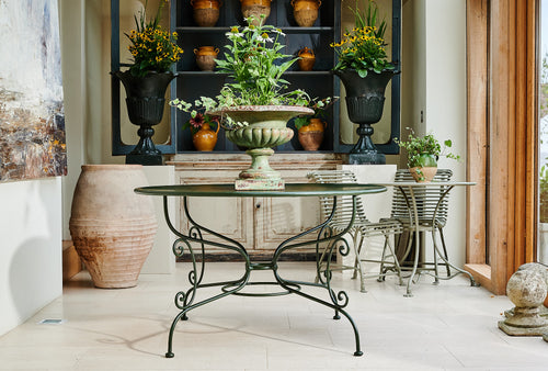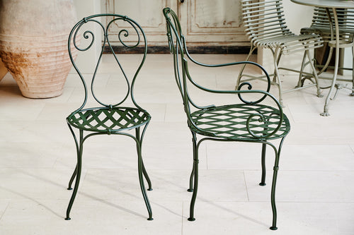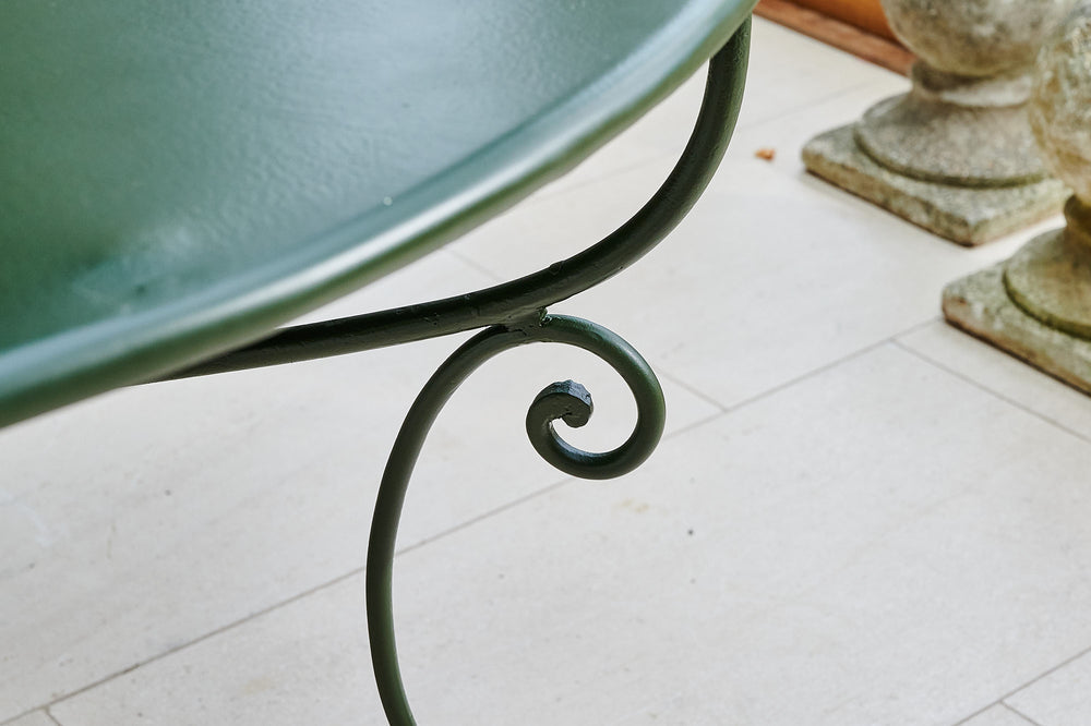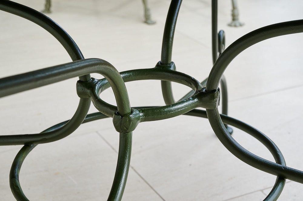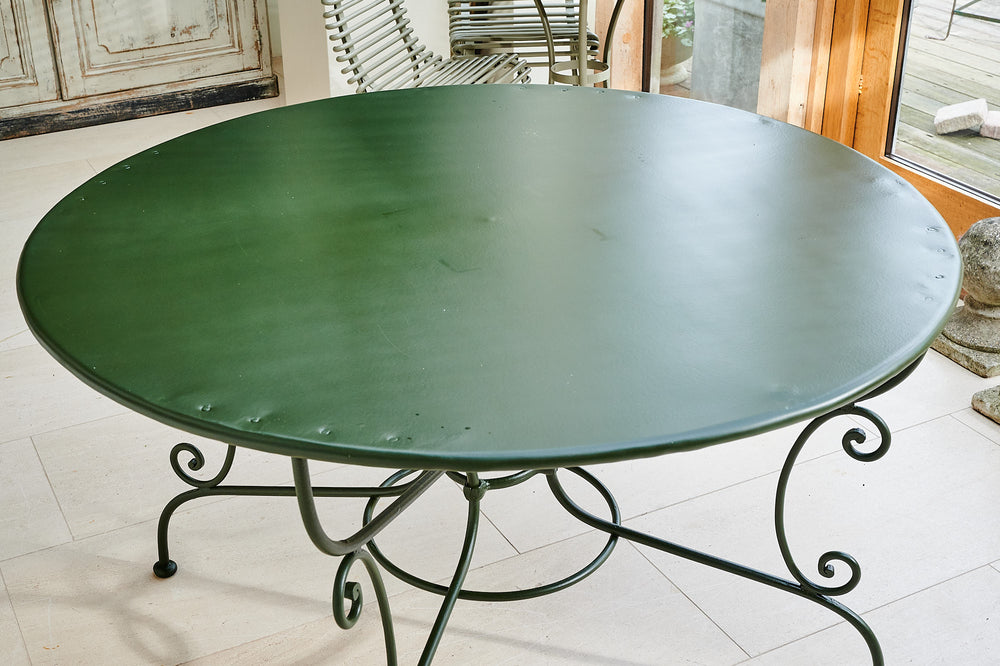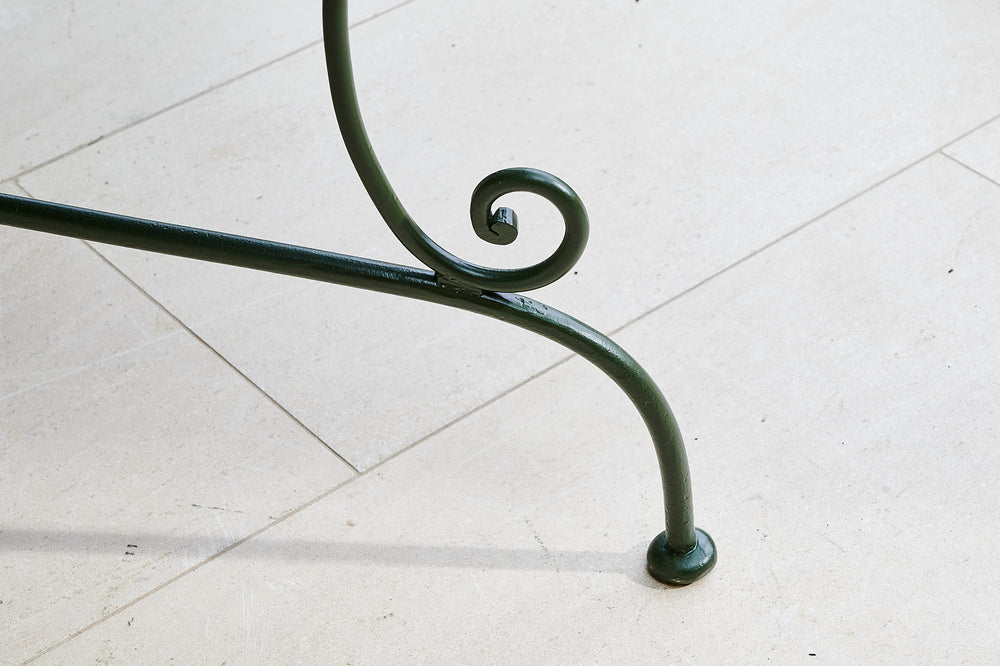 A French wrought iron garden set from the late 19th century. We have restored both the table and chairs to their former glory using traces of the original paint found on the table as inspiration for the colour of the new paint. The set is therefore in excellent condition and should be in action for at least another century. It is worth considering that as a restored item the carbon footprint of this set is almost zero.