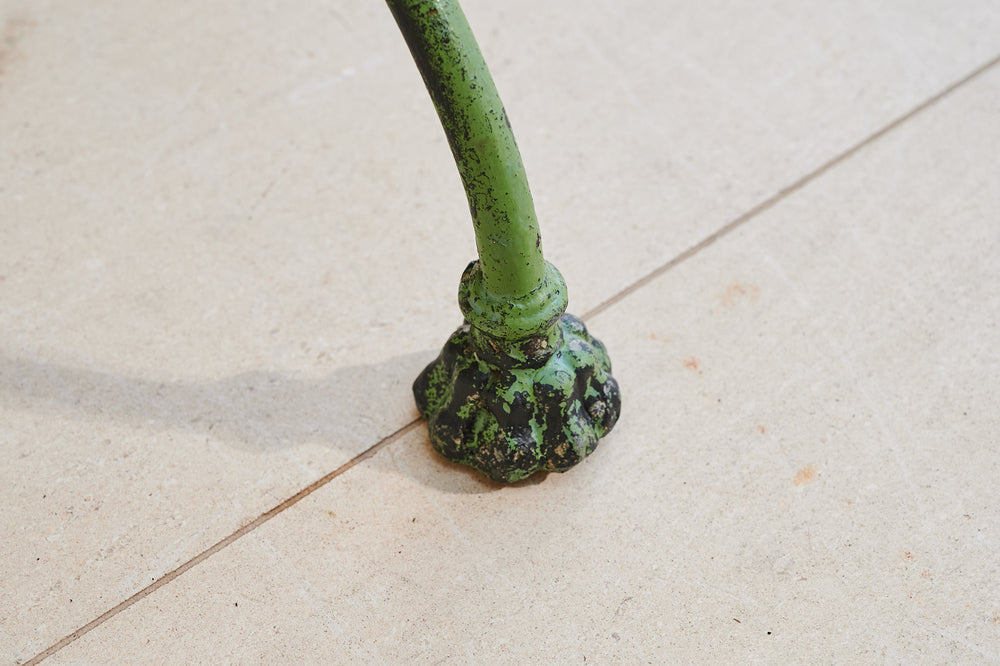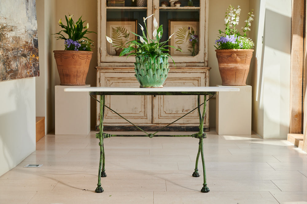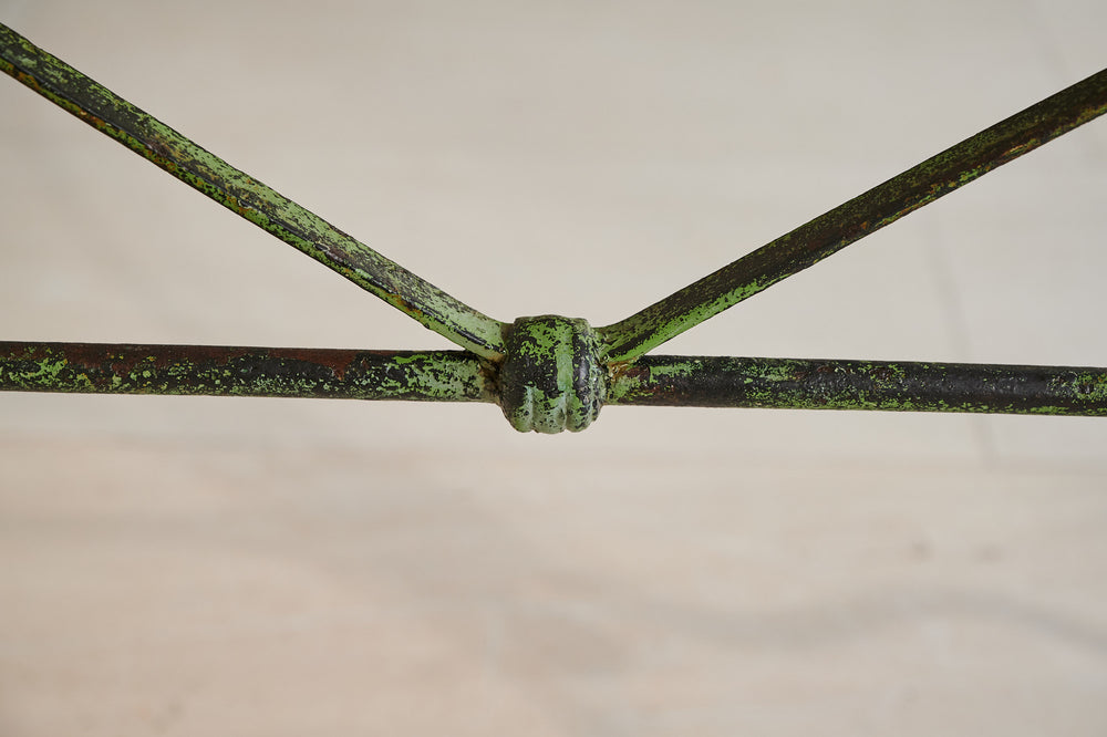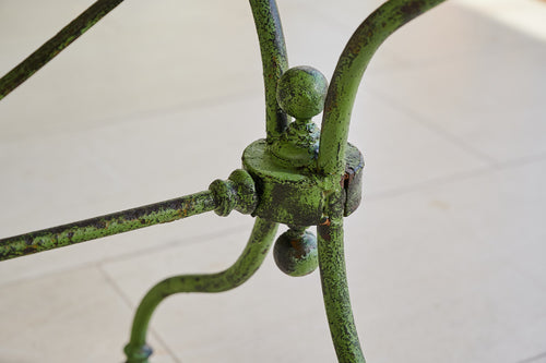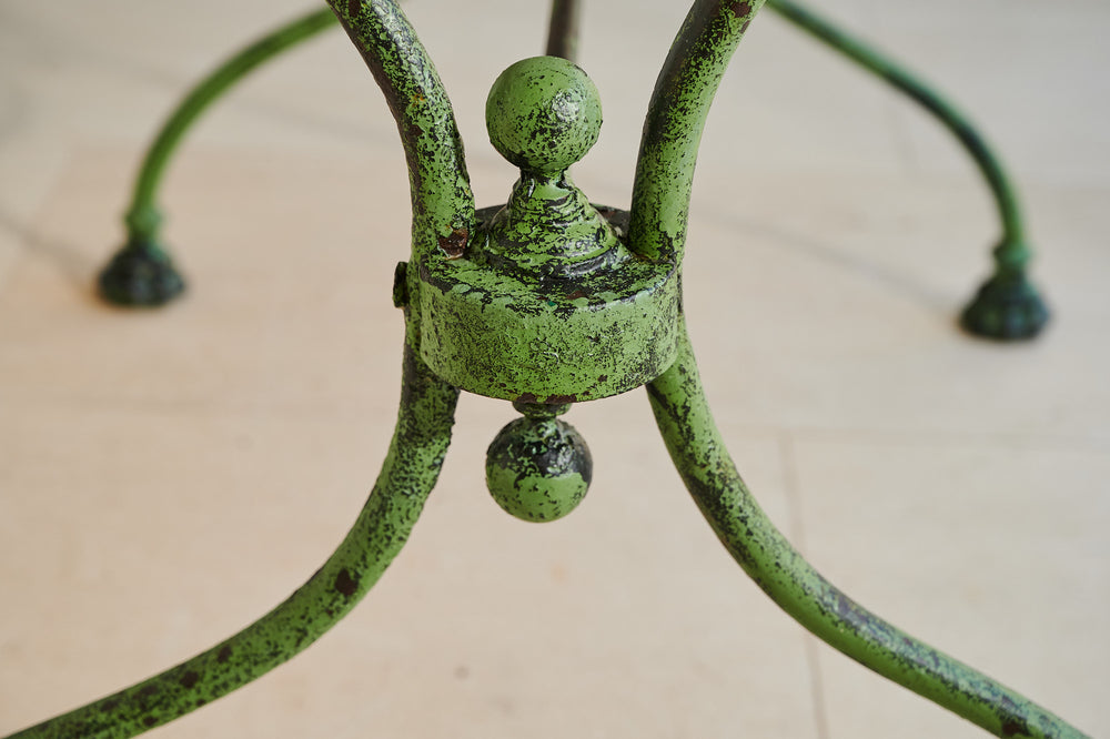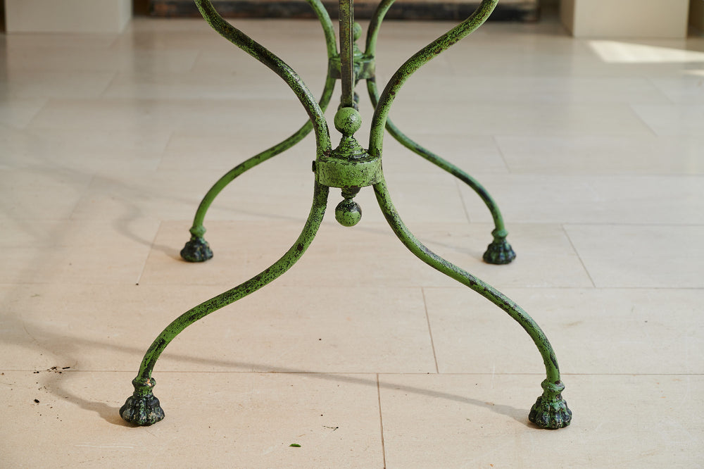 This rare table includes large lion's paw feet and decorative brass finials at either end of the wrought iron frame. With the green paint and marble, both being original this very attractive 19th-century table has many practical and decorative uses both in and out of the home.