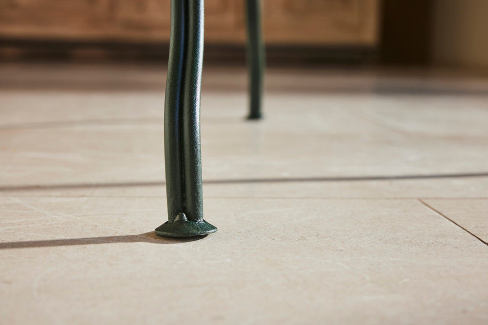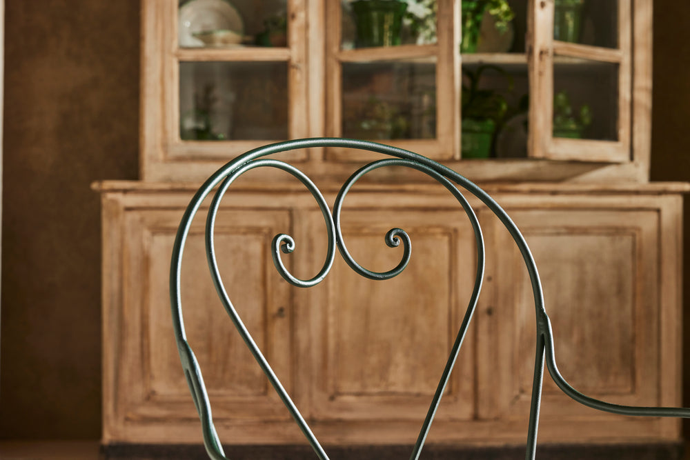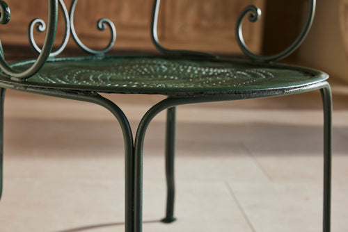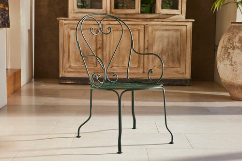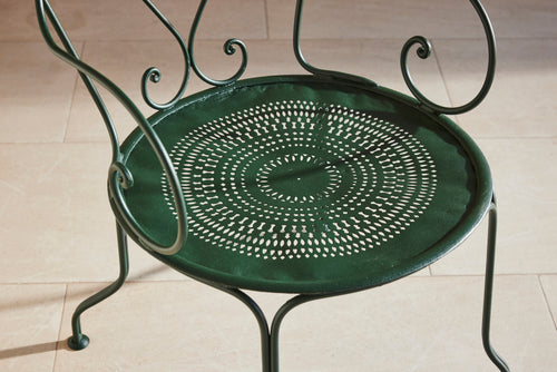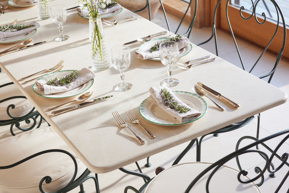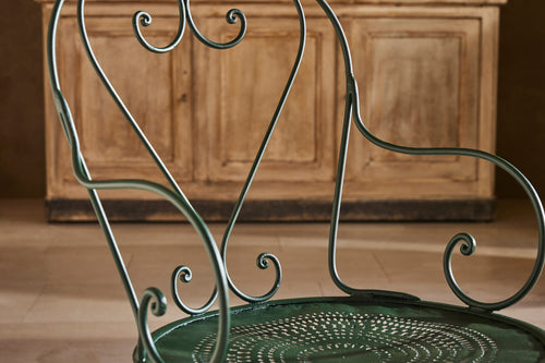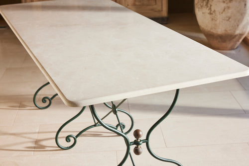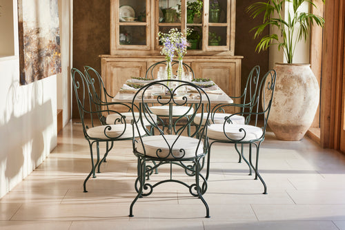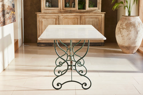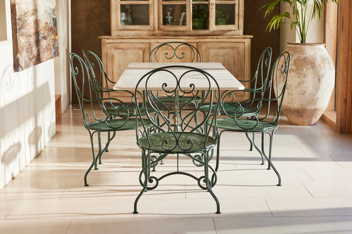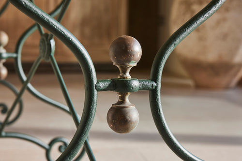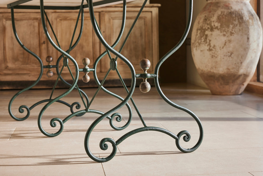 We found this exceptional garden table and armchairs in Provence . The table features a wrought iron frame with three brass finials and a new marble top. It is accompanied by six matching armchairs, all of which have been fully restored and are in very good condition. The complete set has been powder coating provides excellent protection against weathering. The chairs also come with handmade seat cushions. A unique and original dining set ideal for entertaining family and friends