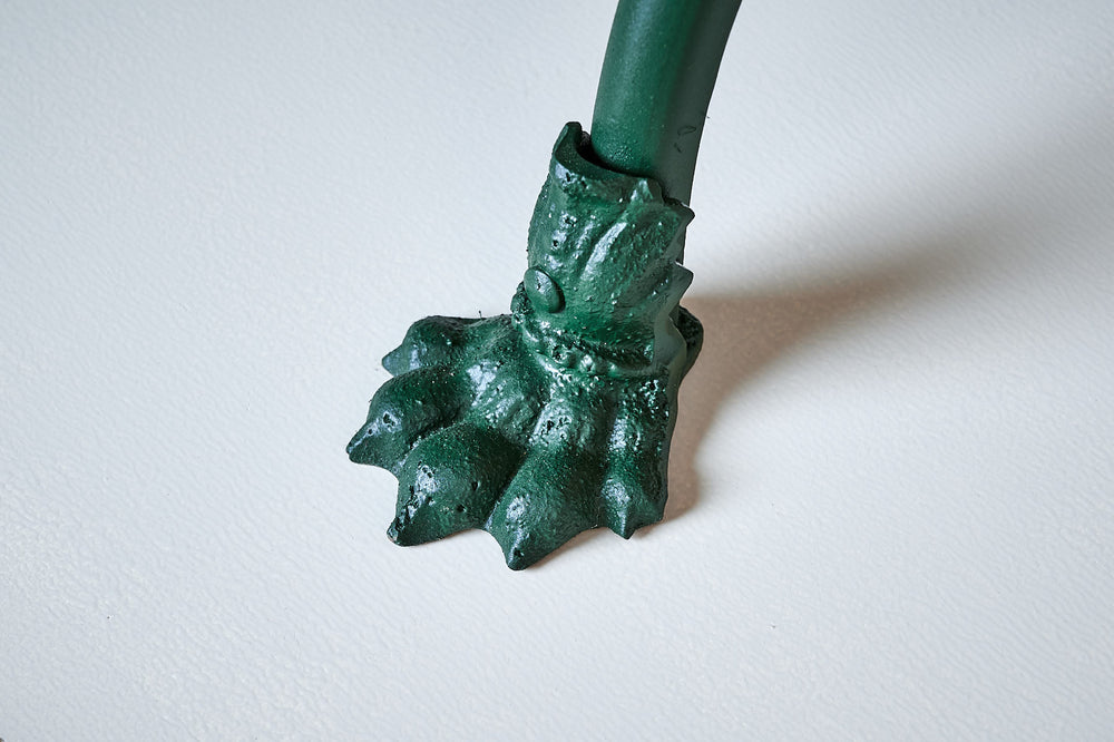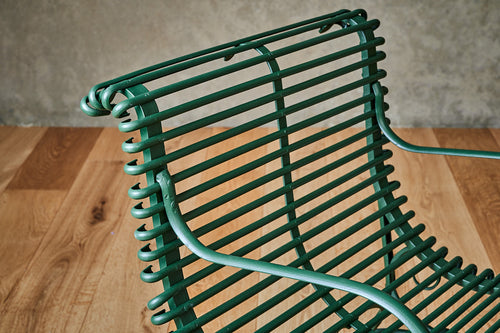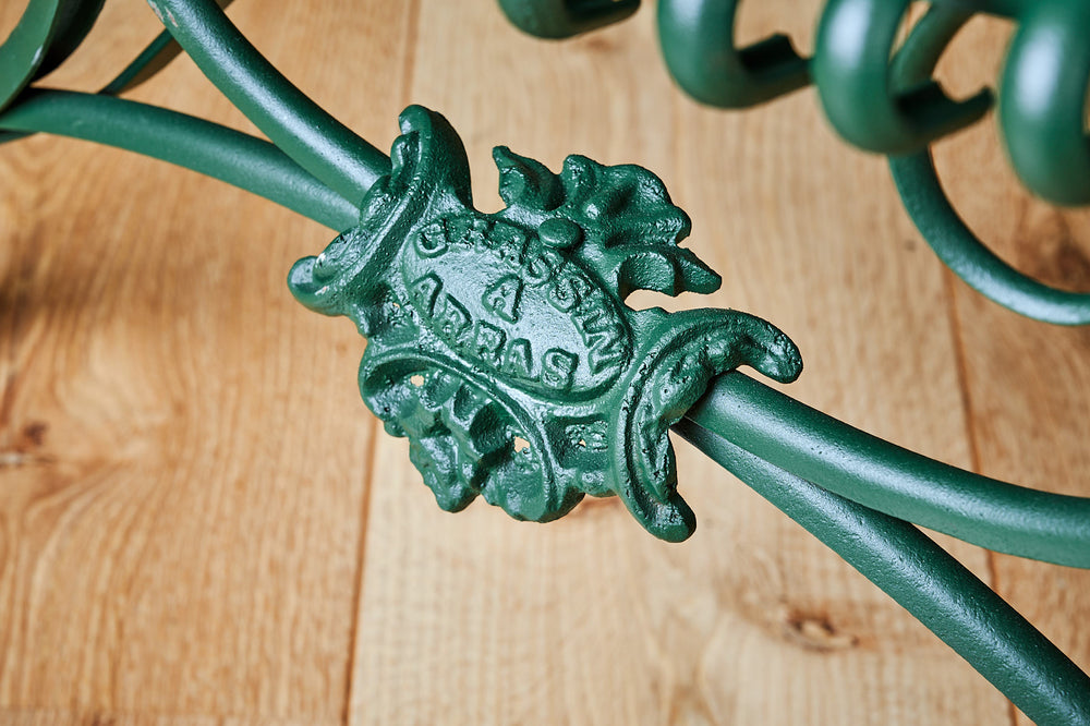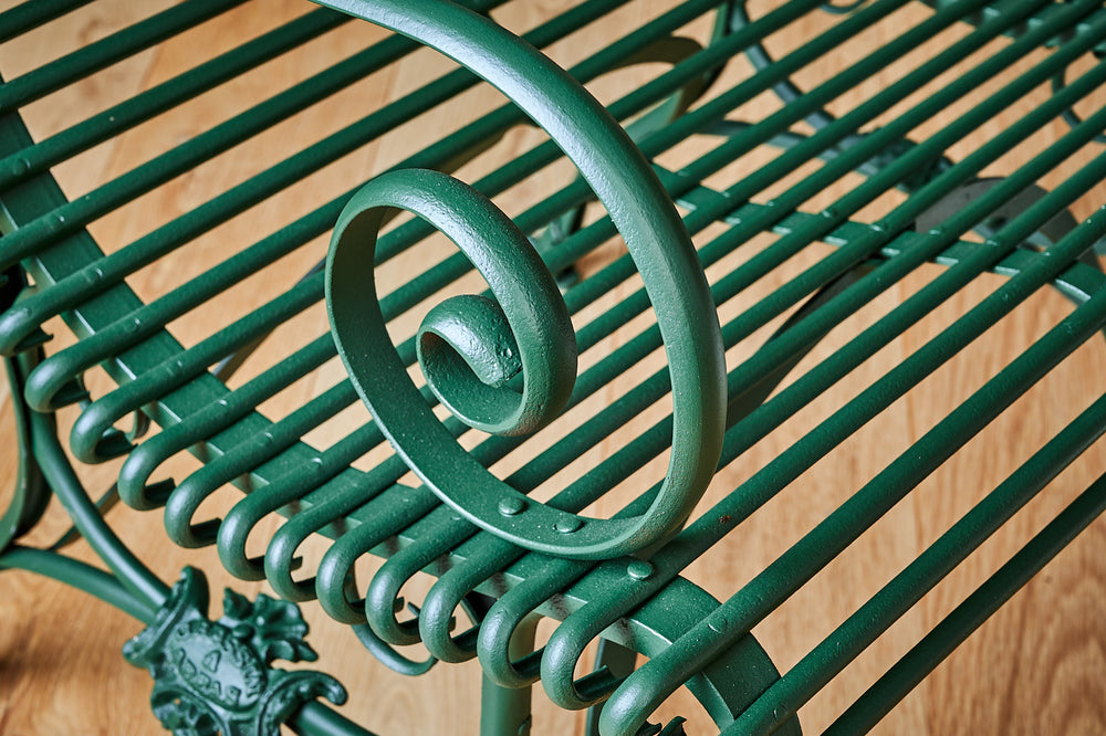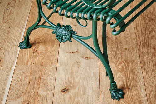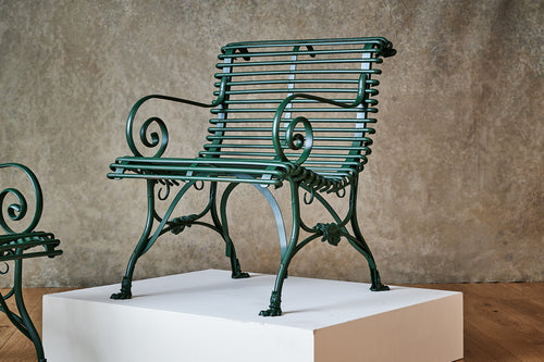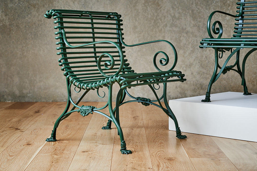 This rare pair of armchairs was manufactured by the Grassin Baledans foundry in the French town of Arras. These chairs are increasingly difficult to find and this pair has been carefully restored and painted in the original factory green to give them a completely new lease of life. They have the lions claw feet associated with Arras furniture of the mid- late 19th century and a makers plaque attached to the frame.
