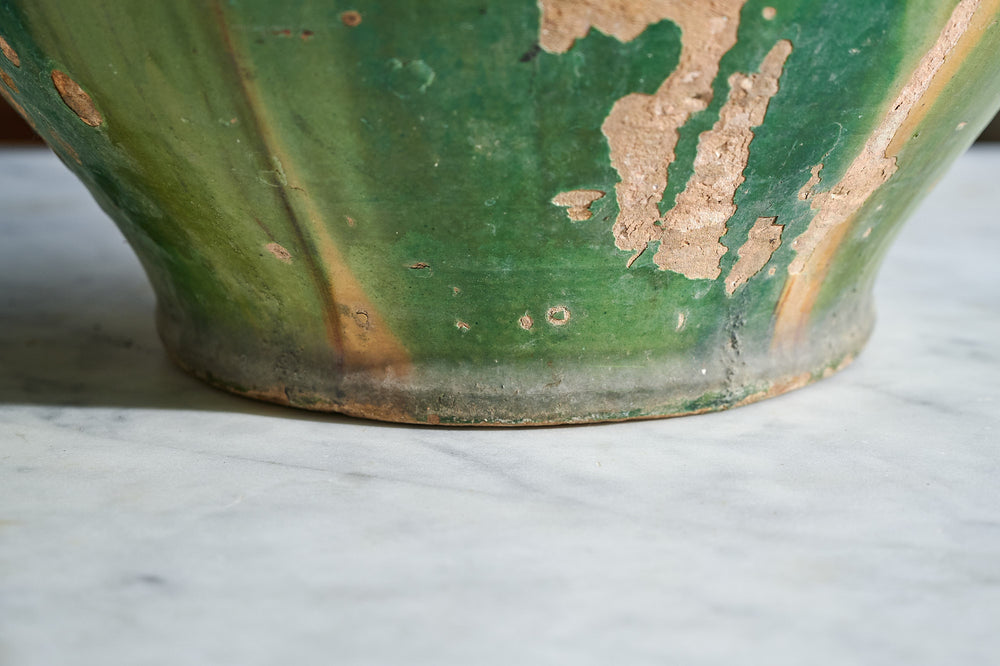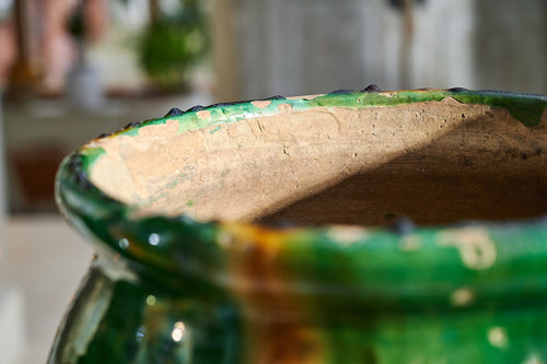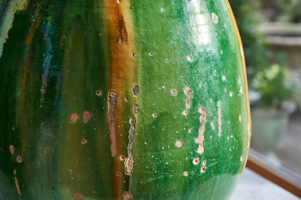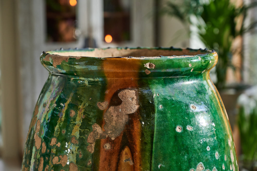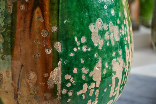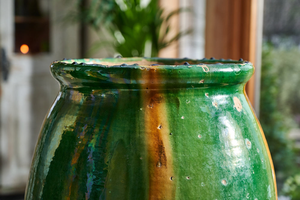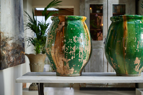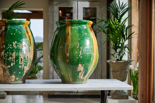 Apart from the unusual shape what we really love about these jarres is the vibrant green glaze with swathes of yellow running down the side. They would look great as decorative pieces in their own right or as planters in or outside the home.