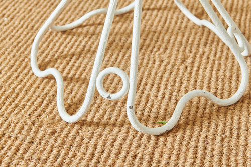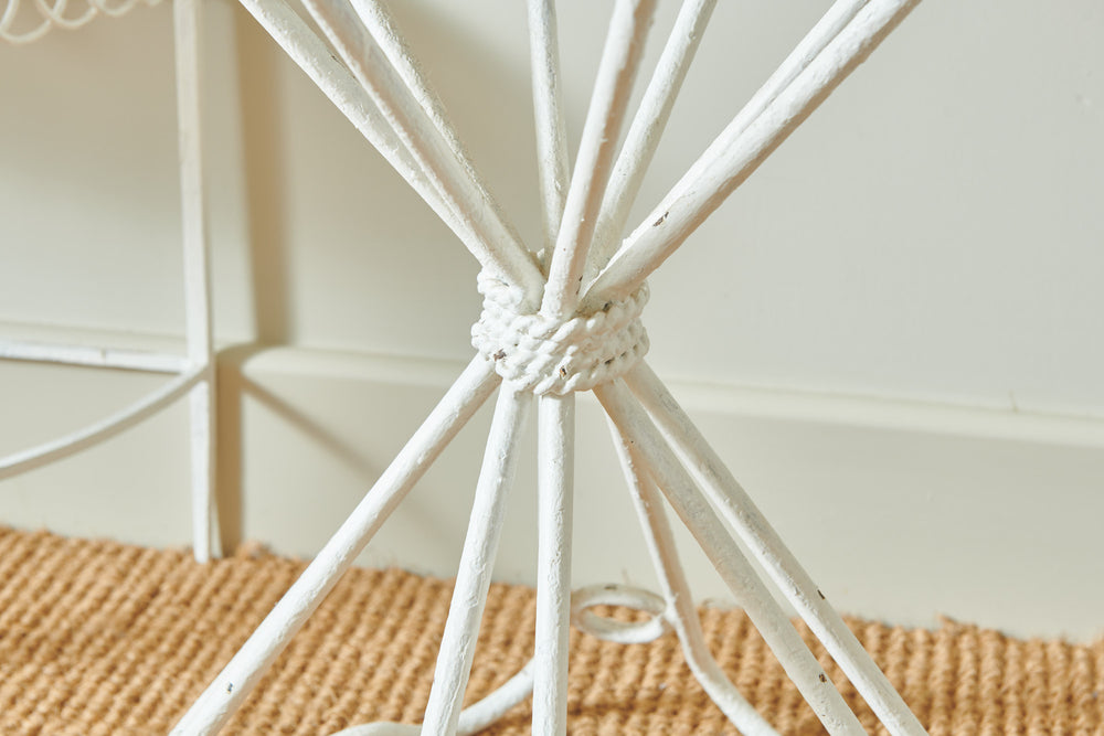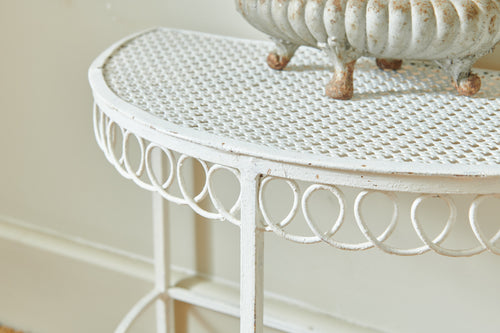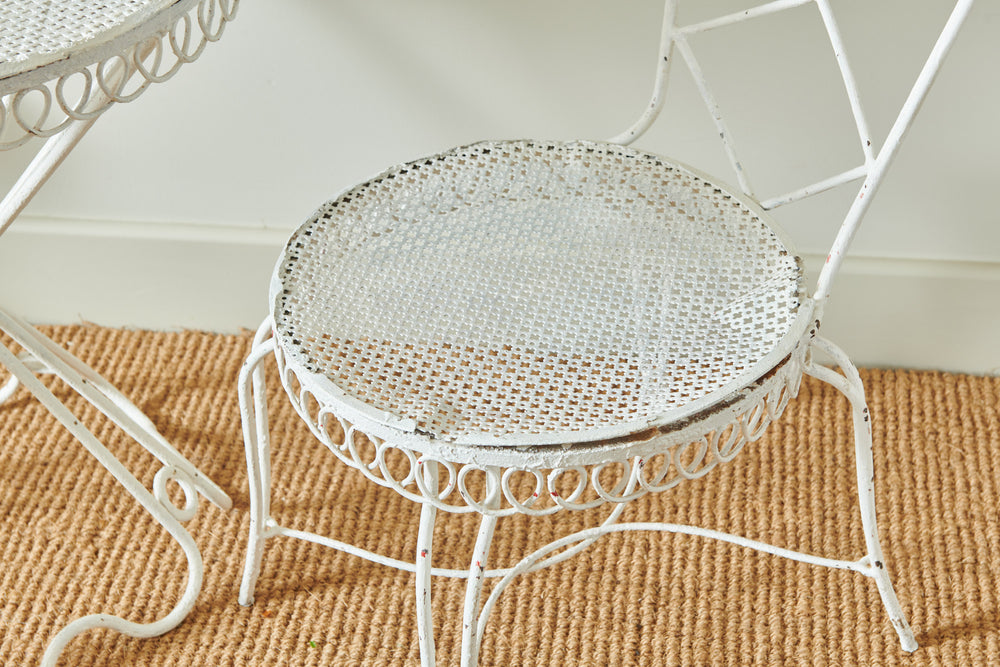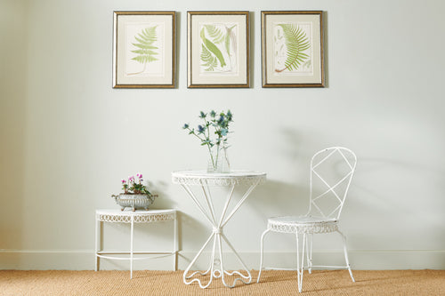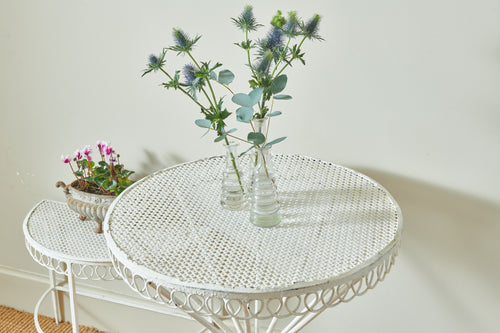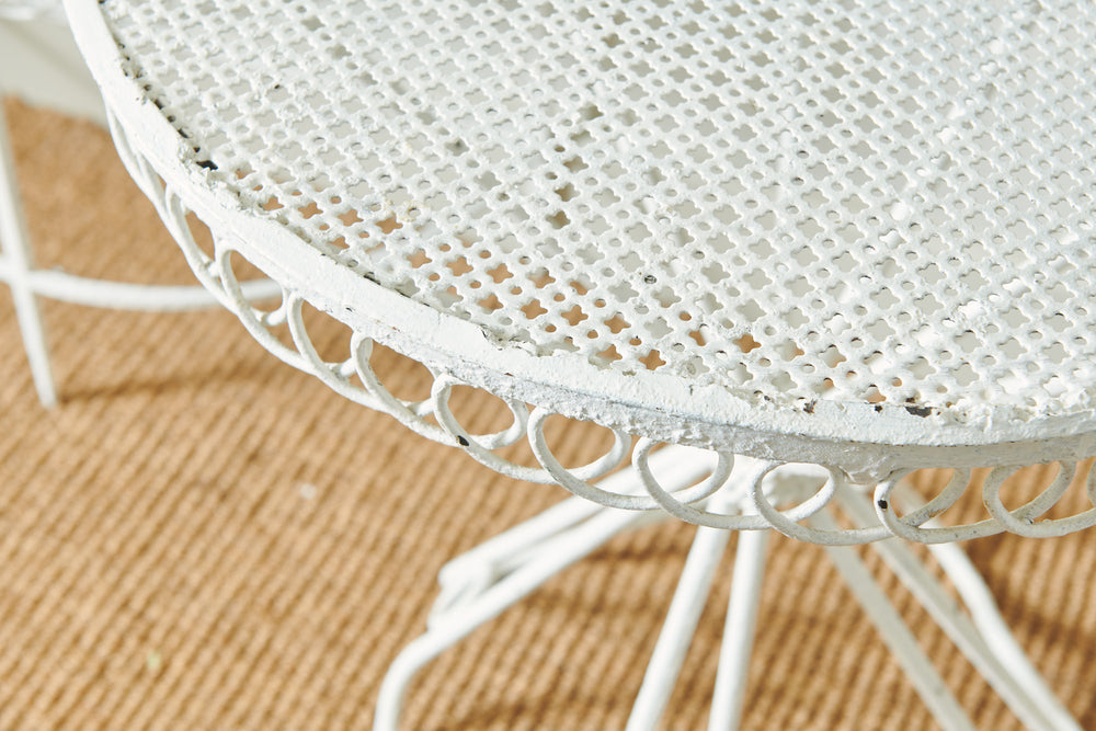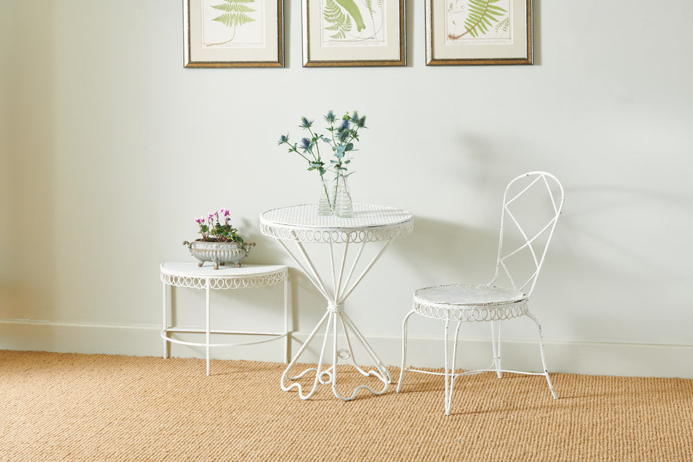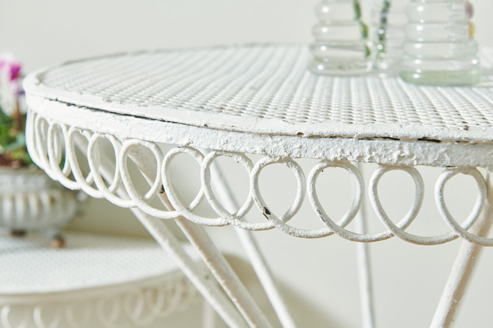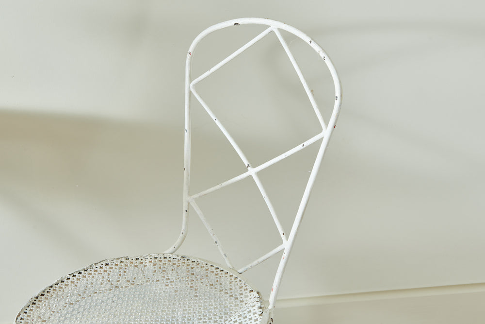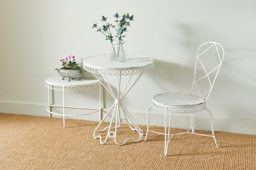 A really attractive garden set by Hungarian Mathieu Mategot (1910-2001) from his Paris Studio consisting of two tables and a chair. Mategot was famous for his pioneering use of steel tube perforated sheet metal in furniture design which is now widely collected. This matching set is in good condition and could be used in the home, on the balcony or the terrace.