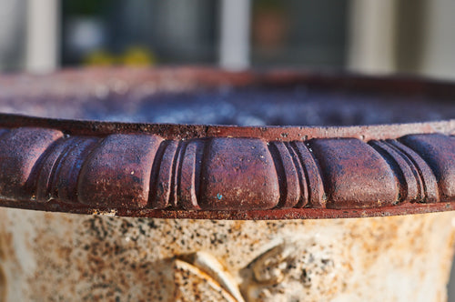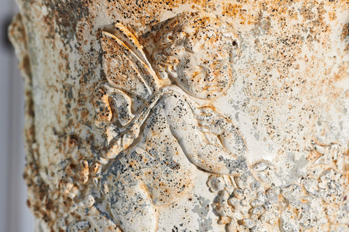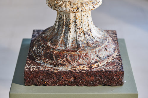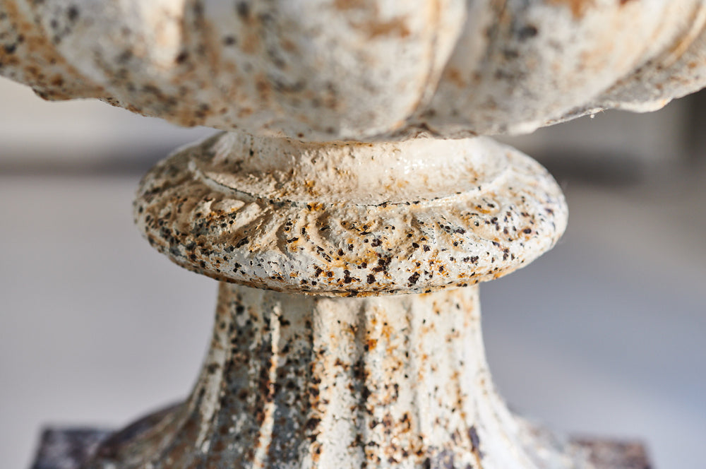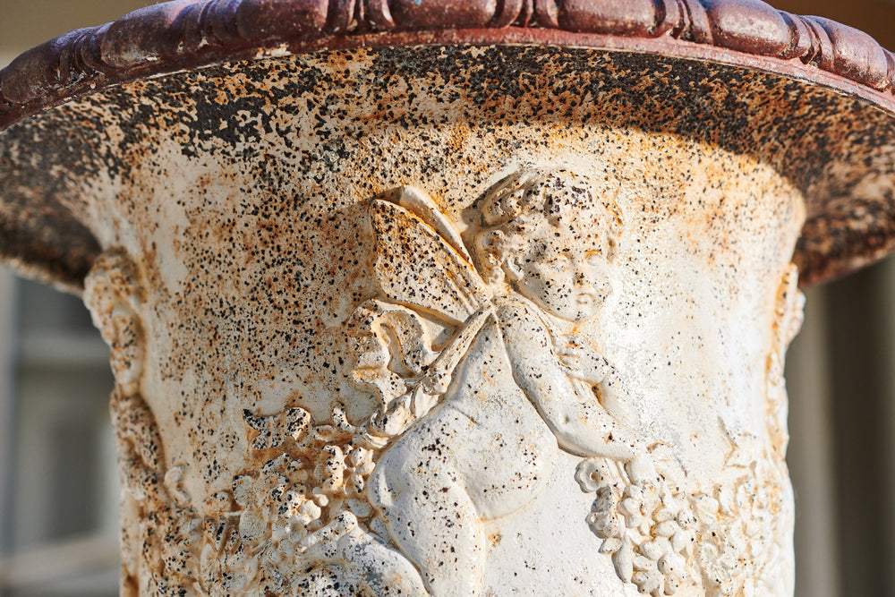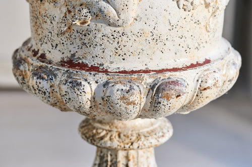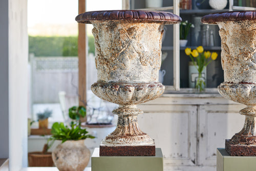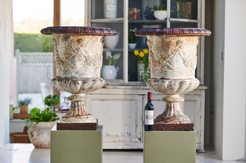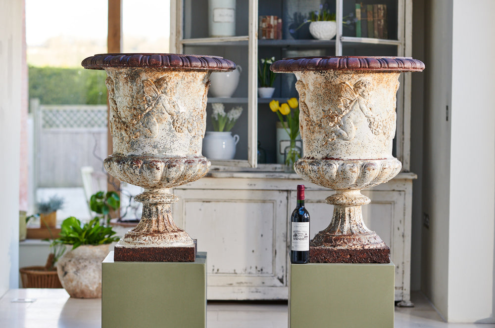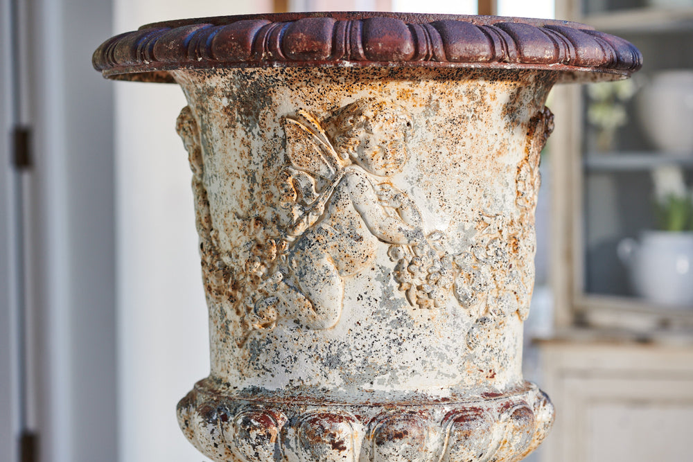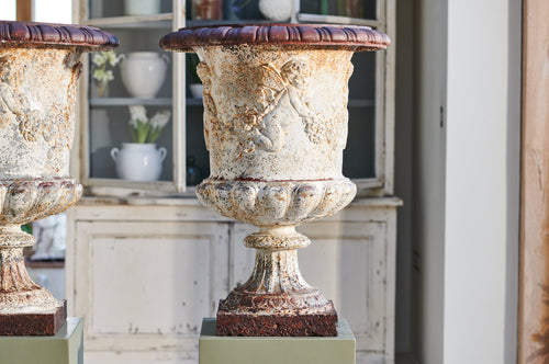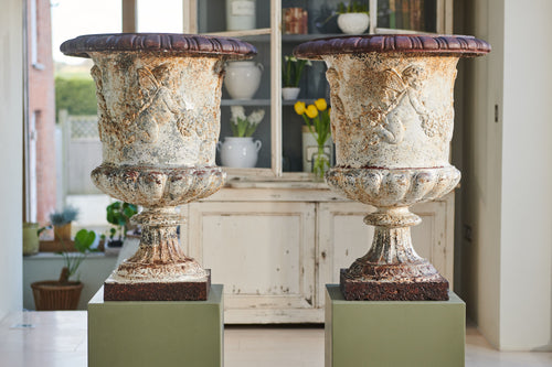 A pair of rare Val d’Osne cast iron urns standing at over 80cm high. The Val d’Osne foundry was established by J.P.Andre in 1835 and based in the Haute-Marne. The company took over rival firms such as Barbezat and Ducel becoming the largest and most prolific foundry of decorative and sculptural cast iron in France during the 19th century. These urns appear in the Val d’Osne foundry catalogue as originally being a Barbezat model. The quality of the casting depicts 5 winged cherubs on each urn linked with a garland of flowers. A fine pair of substantial urns in original untouched condition.
