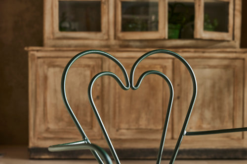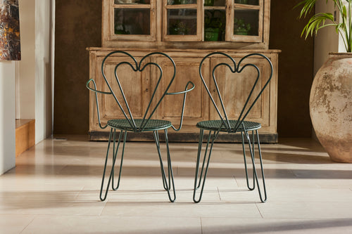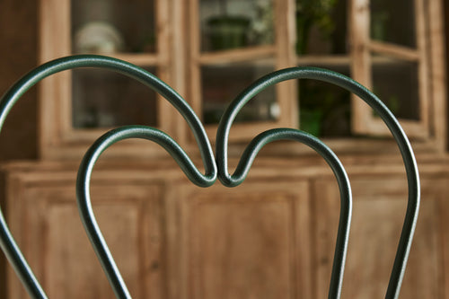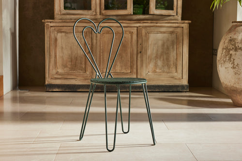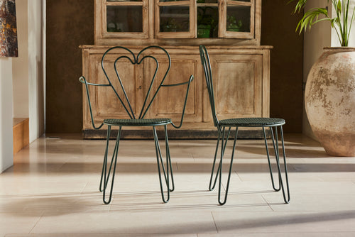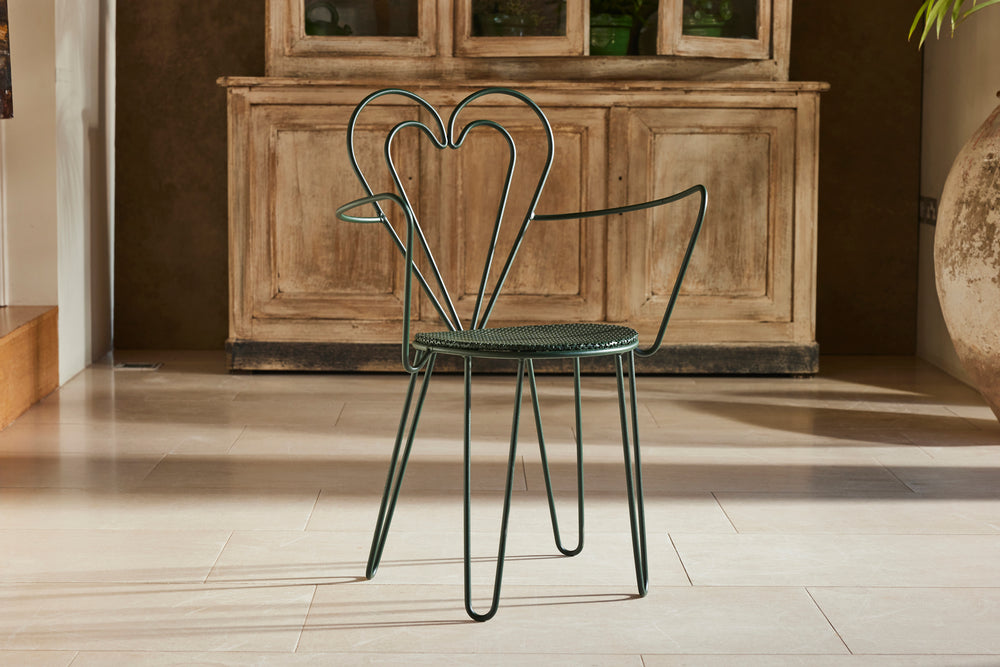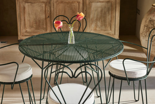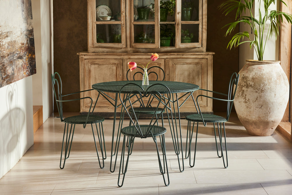 Among his iconic and sought after designs is this rare dining set featuring 4 heart-shaped chairs and a round table all with elegant tubular steel frames and the perforated metal seats and table top.