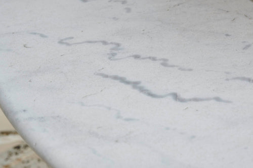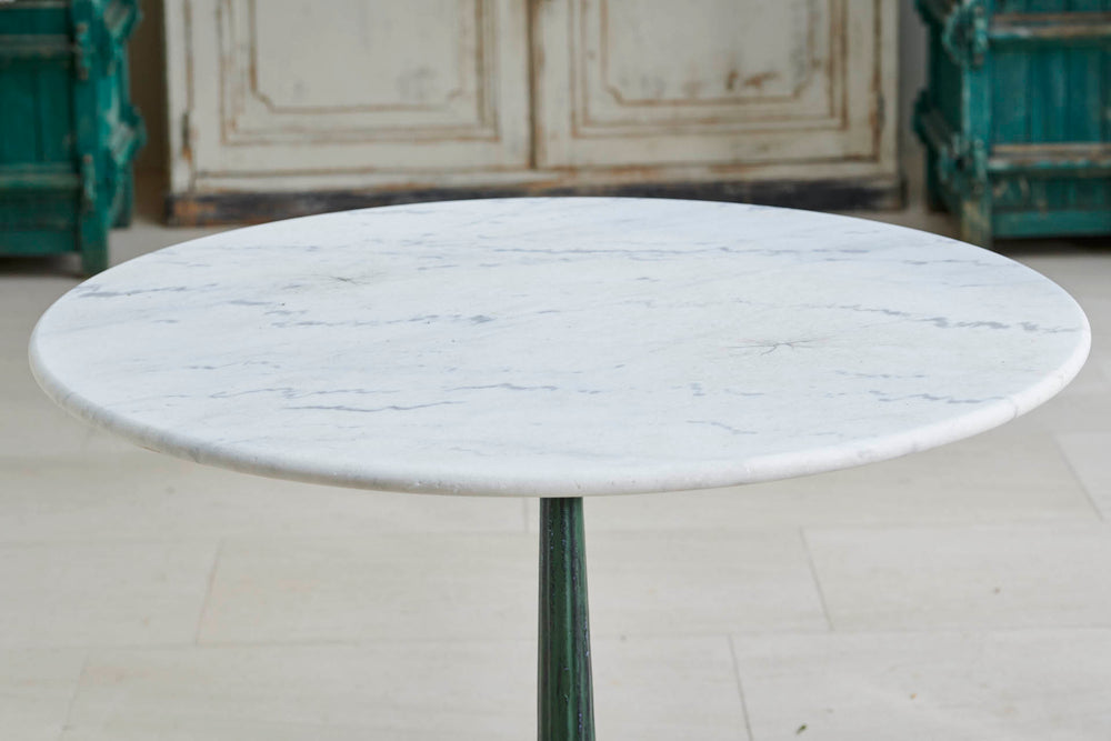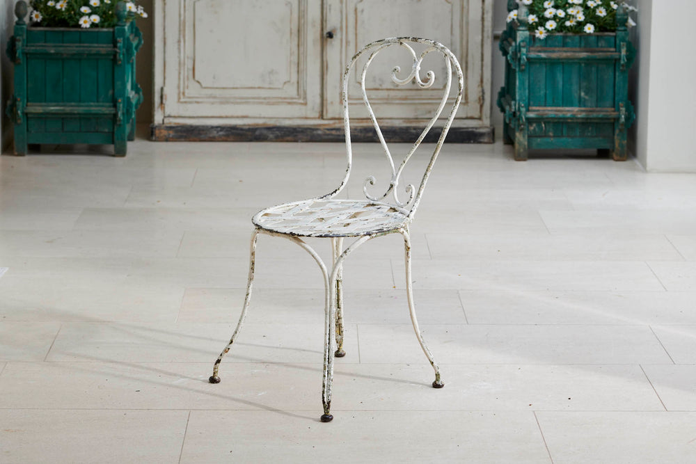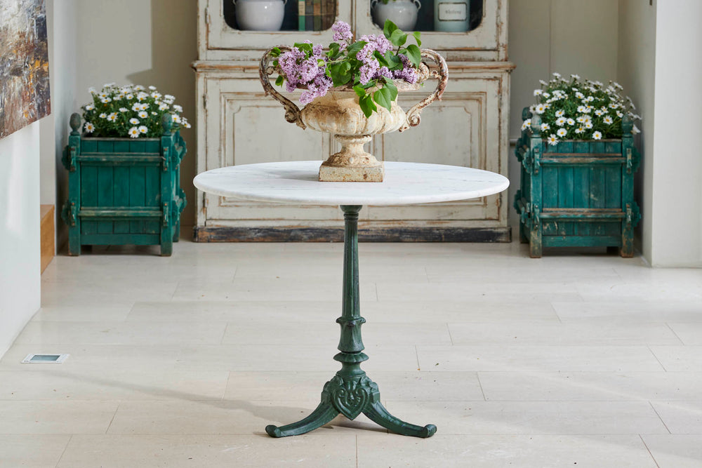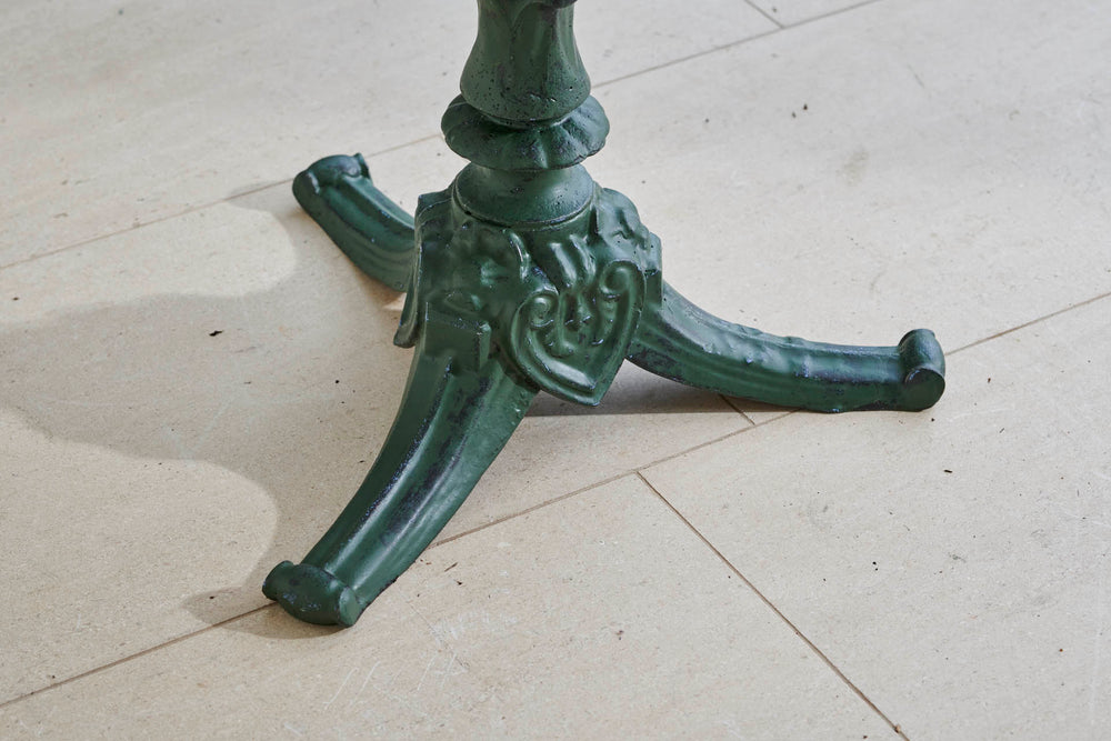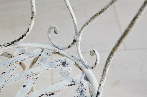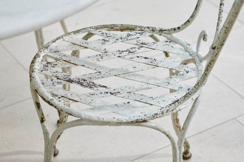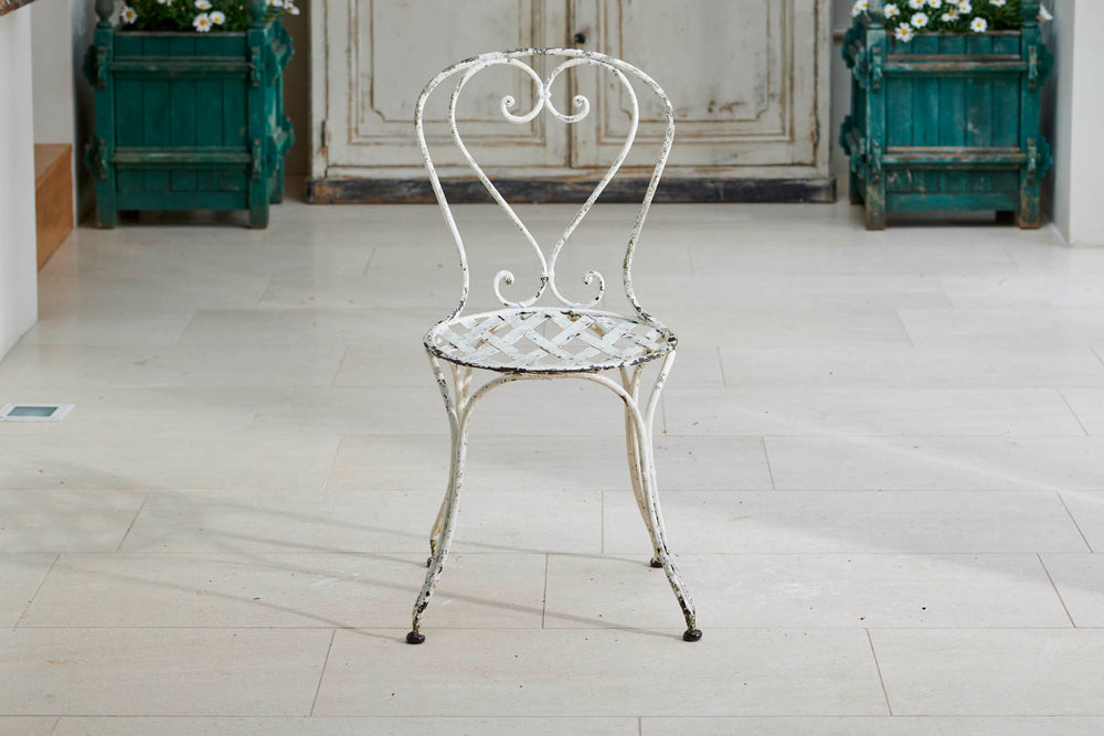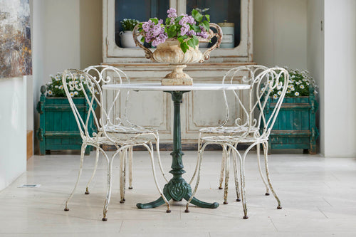 A round garden table and four chairs from the early 1900s. The table comes complete with its original marble which sits on an attractive cast iron base. The chairs are in the classic French design with round slatted seats and heart-shaped backs and little lead feet. An ideal set for summer dining with family and freinds.