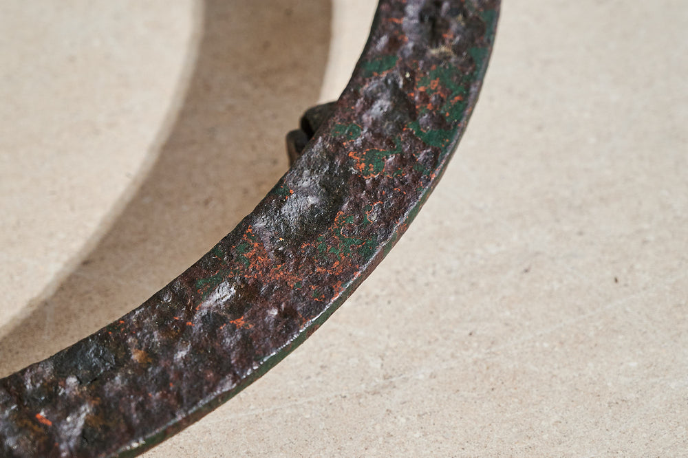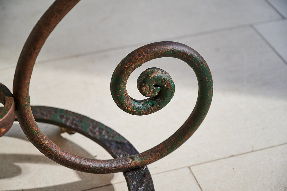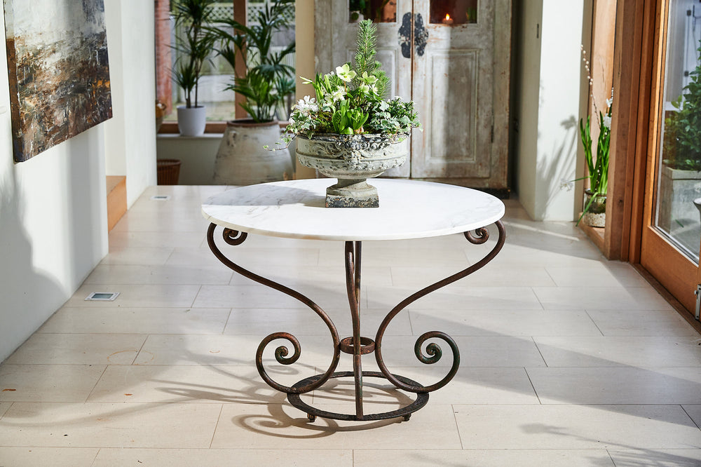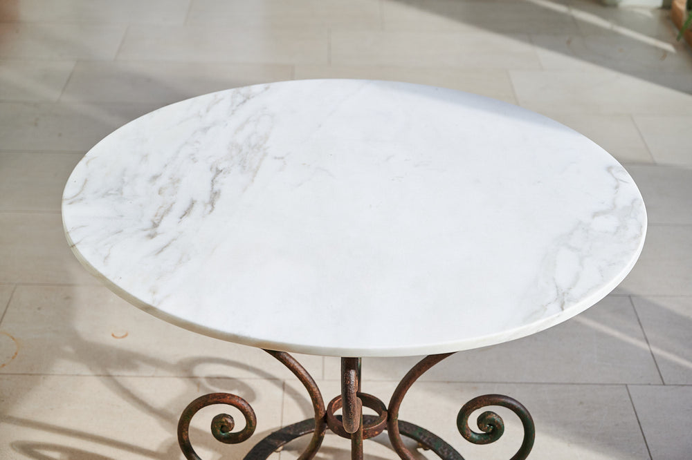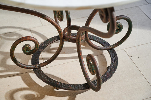 A really special table that was used in the 19th century in a patisserie to present bread and cakes. Still, on its original working wheels, the fact this table is round is incredibly rare. The wrought iron frame is in good condition however the original marble top had perished and has been replaced with new. The table has many potential uses in and out of the home however at 73cm it is the perfect height for dining and would easily seat four.