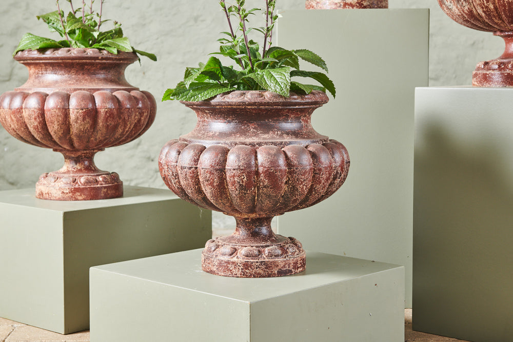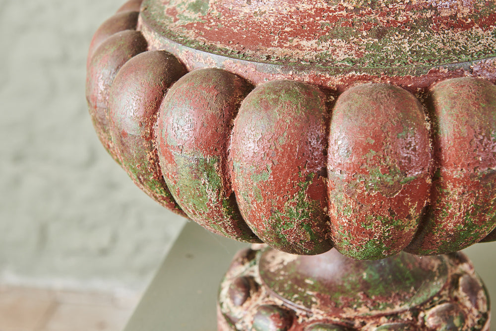 A pair of large Alfred Corneau à Charleville cast iron urns made in France in the mid 19th century. They are characterised by both their dramatic convex shape and a fantastic painted patina which has taken on a leathery look. They would be a terrific focal point along a long garden wall.
