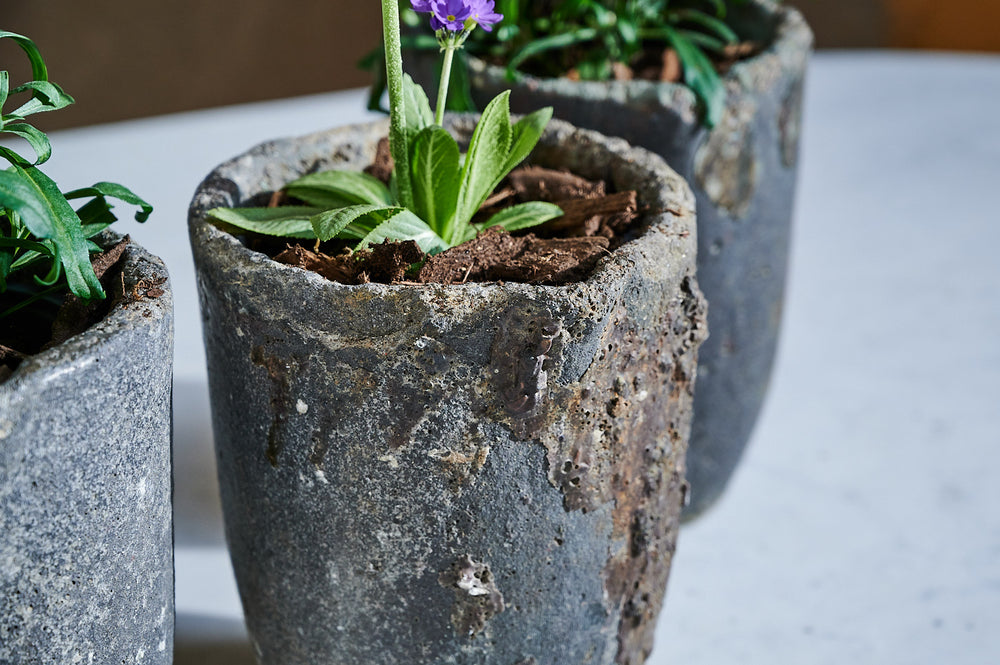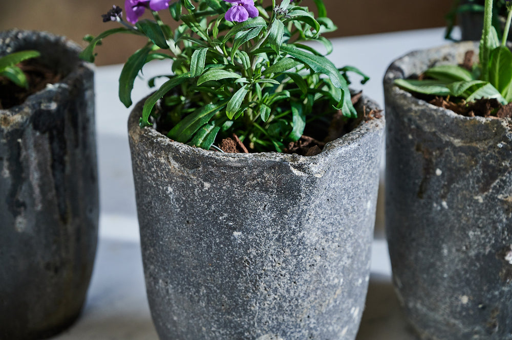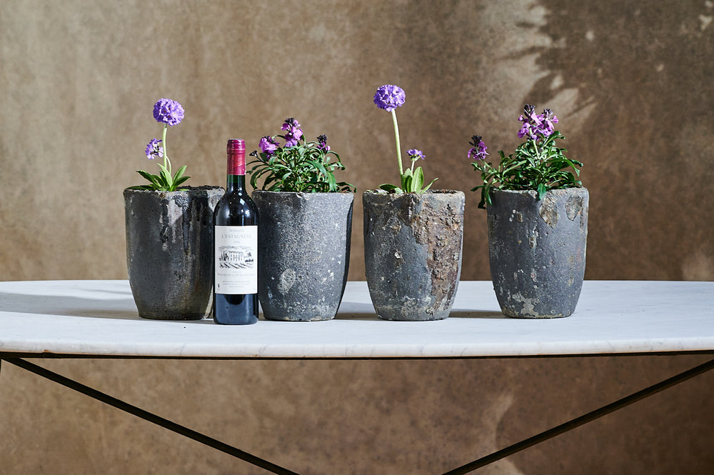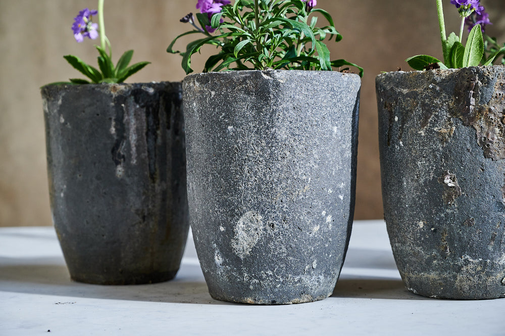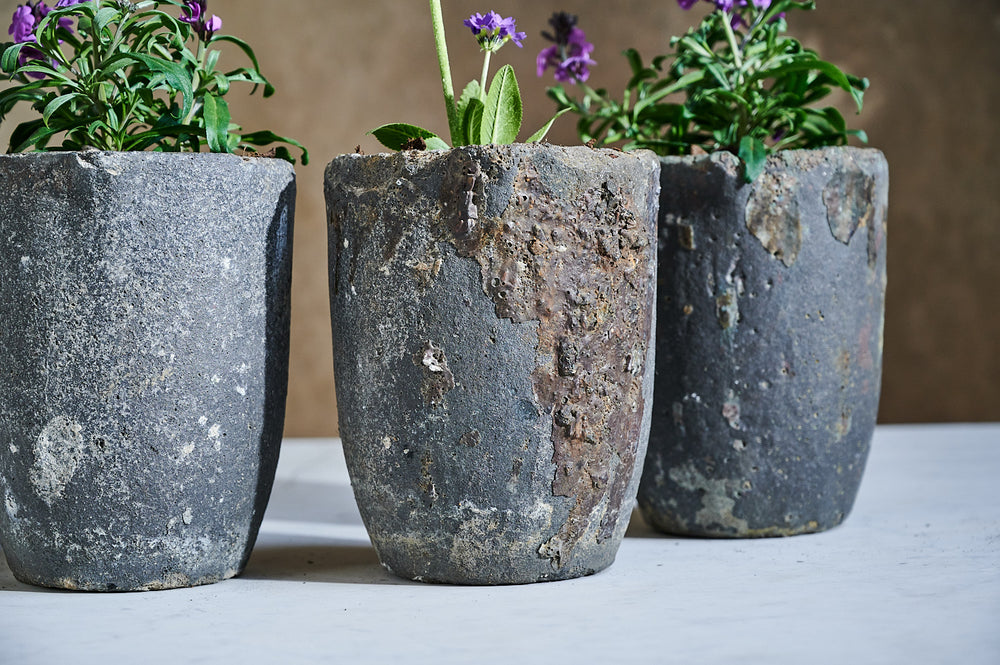 This set of small foundry pots is made of lava stone. Small versions of these pots were often used for melting down precious metals. They are incredibly strong and durable and make unique and unusual planters both inside and out.