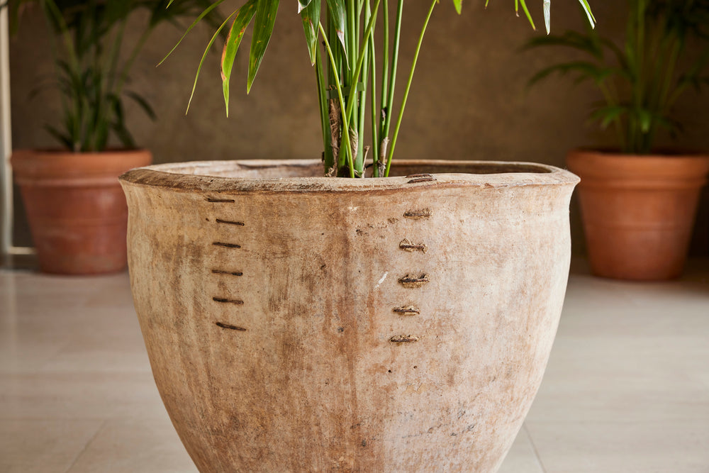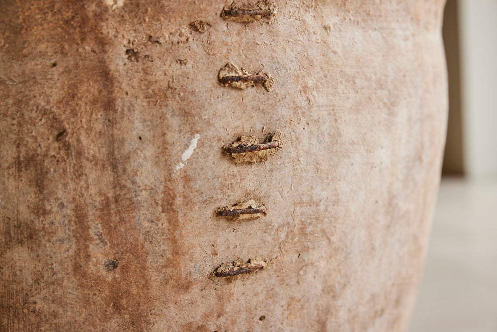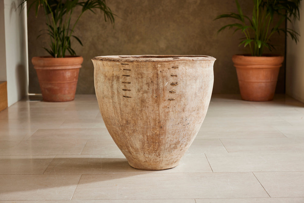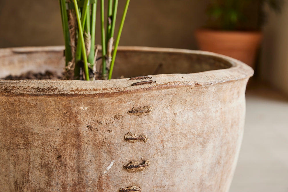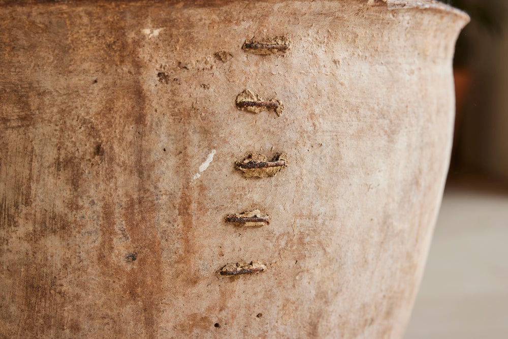 The old staple repair, which we think adds huge character to this pot, is structurally stable and does not stop it from being used as a planter.