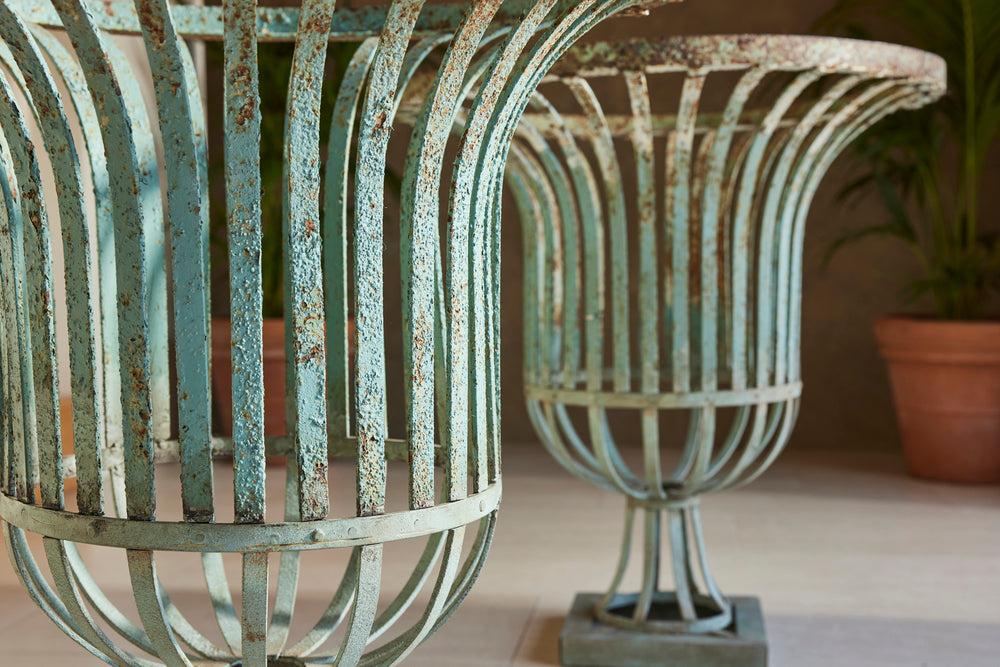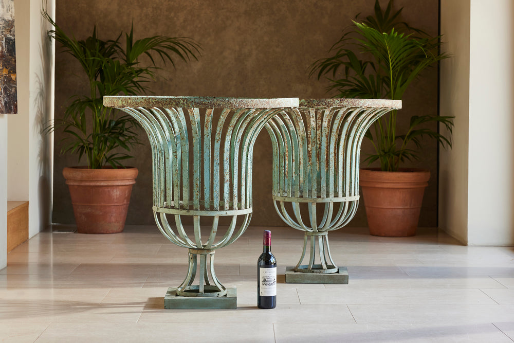 The plinths on both urns have been restored and painted to match the original turquoise paint.