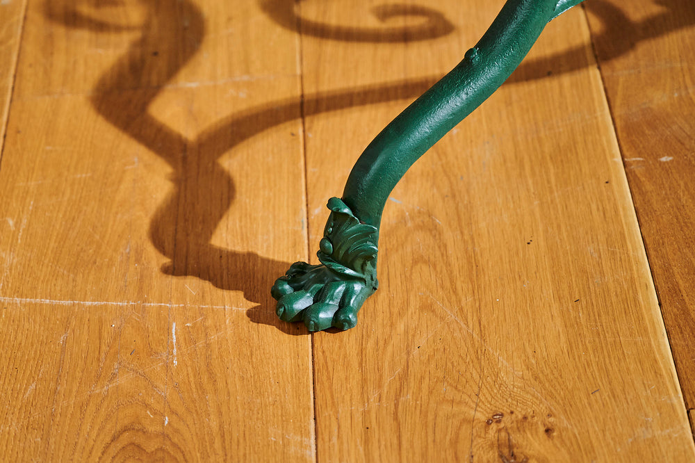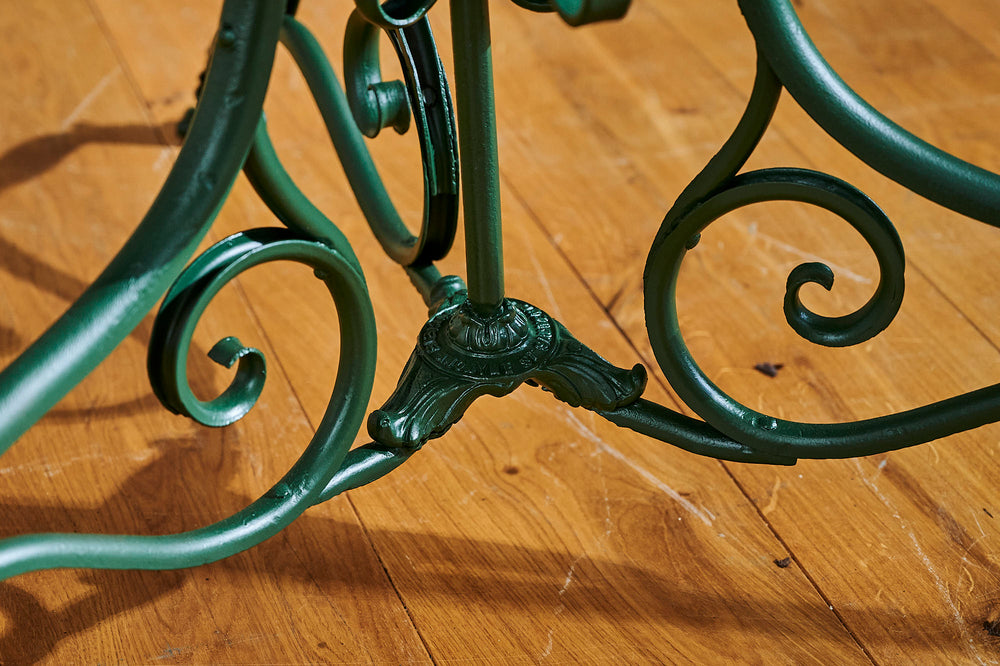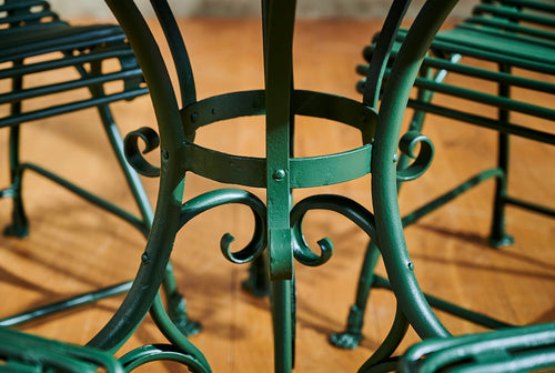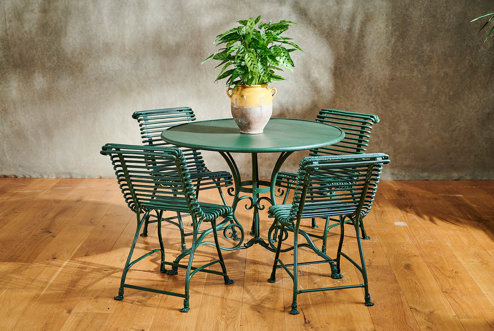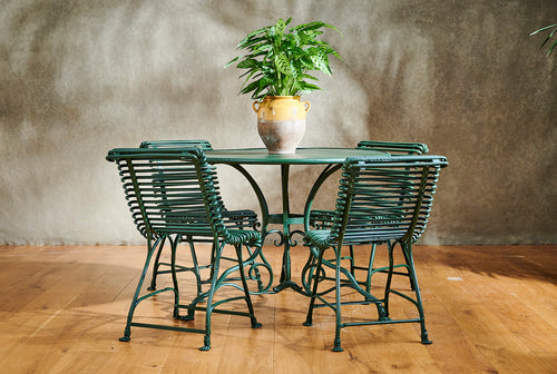 This is a wonderfully handsome set of Arras garden furniture. The four full backed chairs and the table all have the distinctive "lion's claw" feet, a feature of Arras furniture of the 19th century. Arras garden furniture was intended for a high-end Parisian market in the late 19th century and it's this quality that has made it both so collectable and durable today. This increasingly rare dining set is in very good condition and would make a wonderful garden centrepiece.