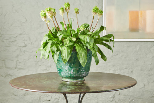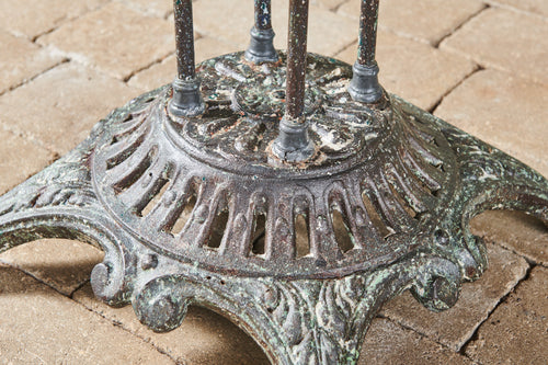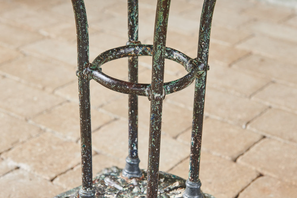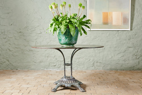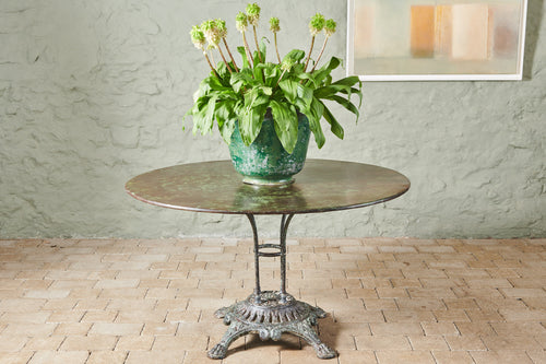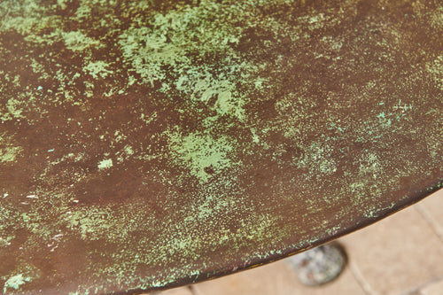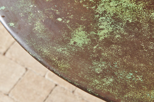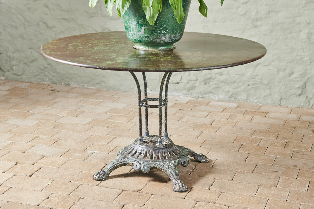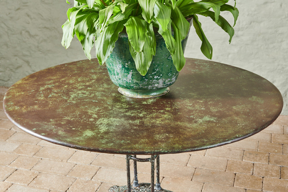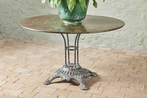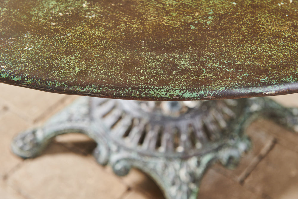 What is stunning about this table is the remarkable green patina that has been uncovered by removing all the loose and flaking paint from the top. It has an interesting and heavy cast iron base and is in very good condition. The whole table has been sealed with a high-performance coating to protect it from the elements. However, this very attractive table could also be used inside perhaps as a centre table in a hallway or as a dining table.