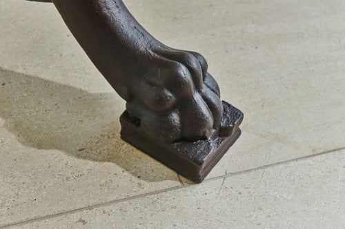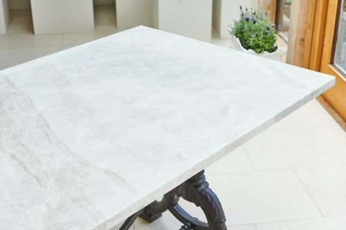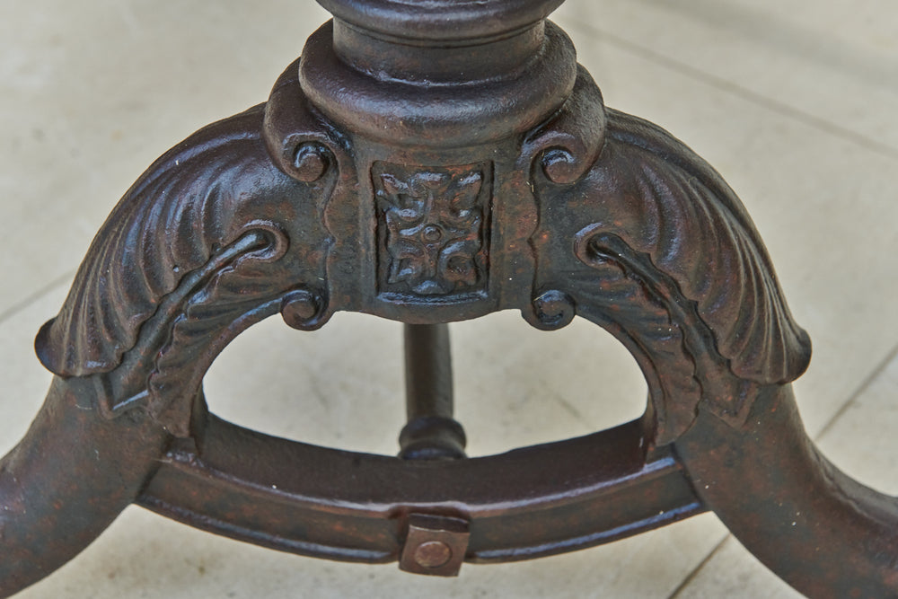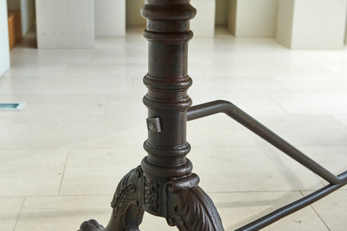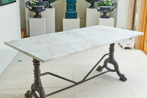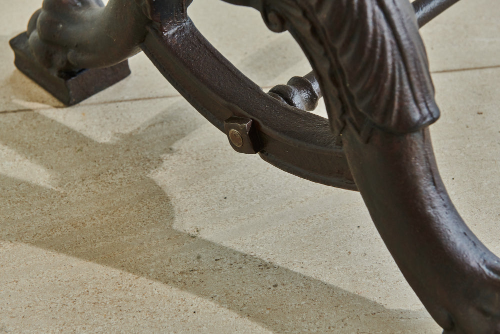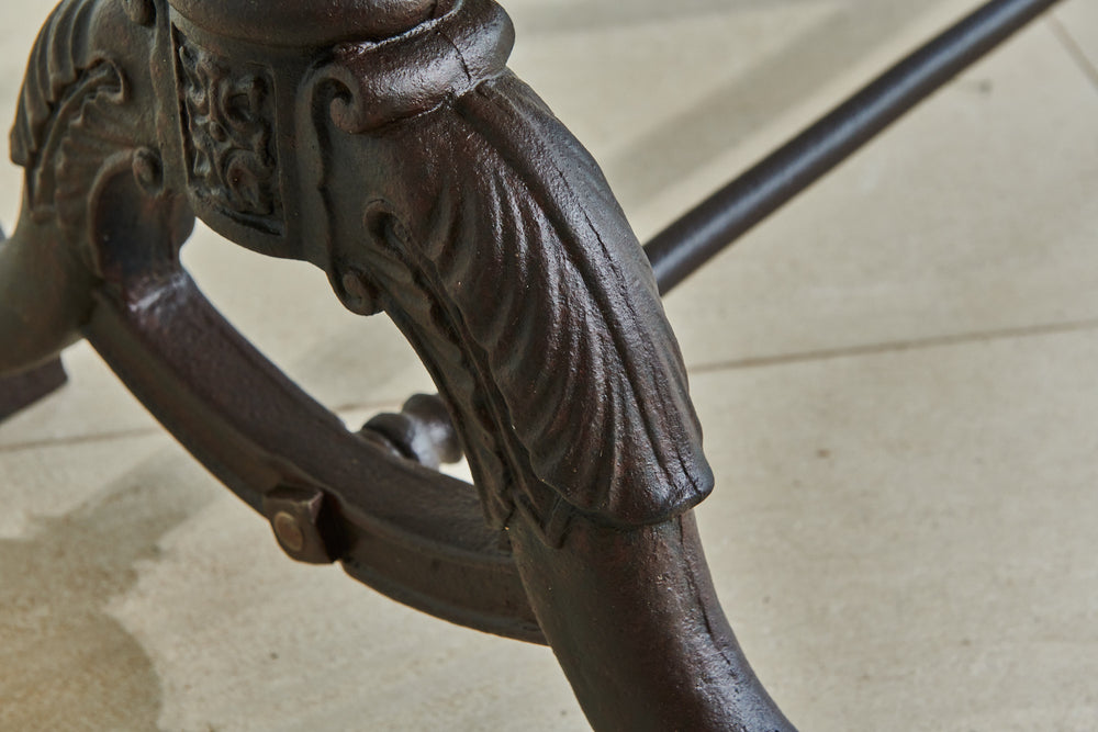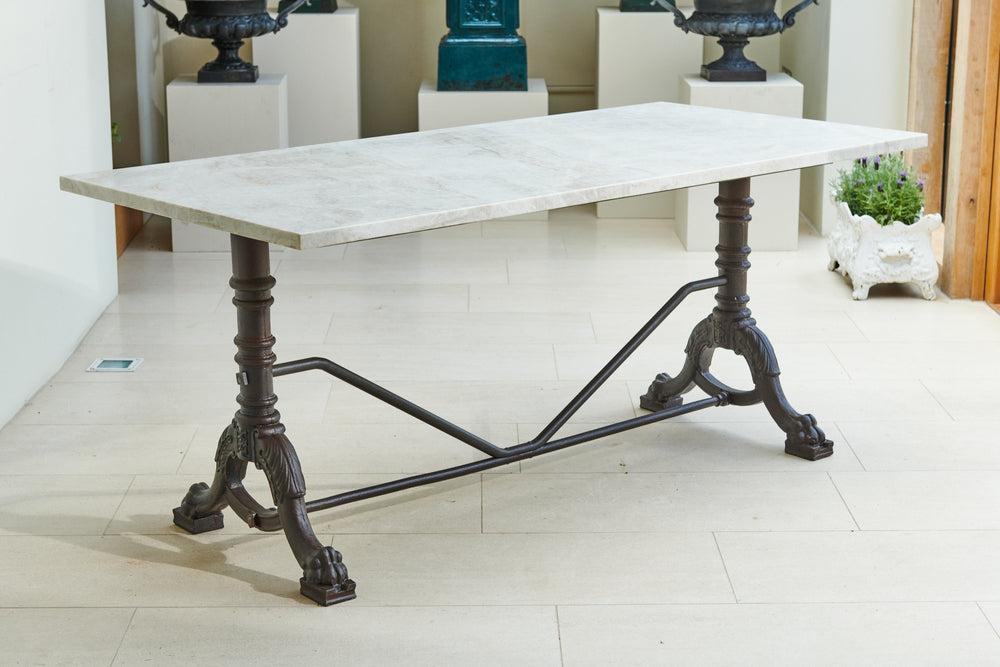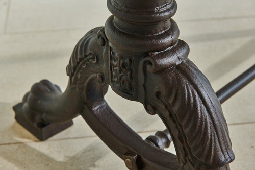 An attractive garden dining table that would easily seat 6 and 8 at a push. The table has a substantial cast iron base with classic lion claw feet upon which sits a 30mm thick marble slab. This very attractive marble top has a dark cream base with brown riven hues to match the table base. Chairs can be provided if required