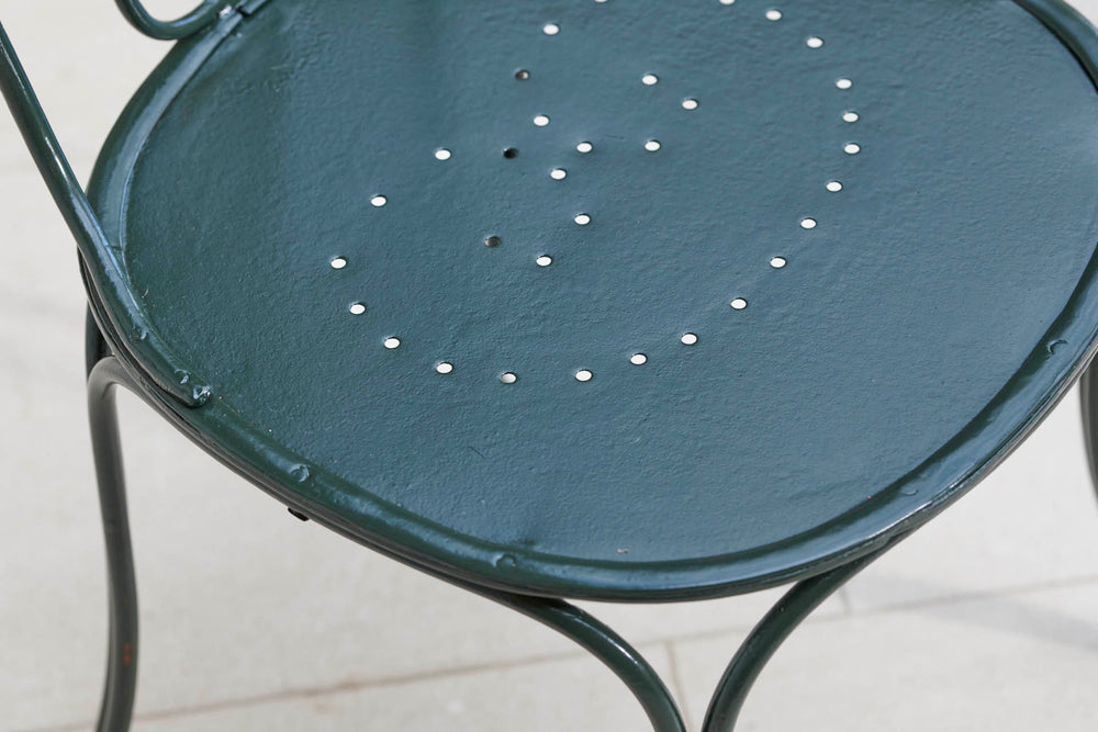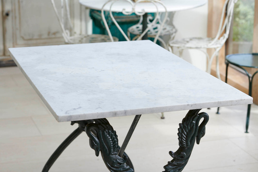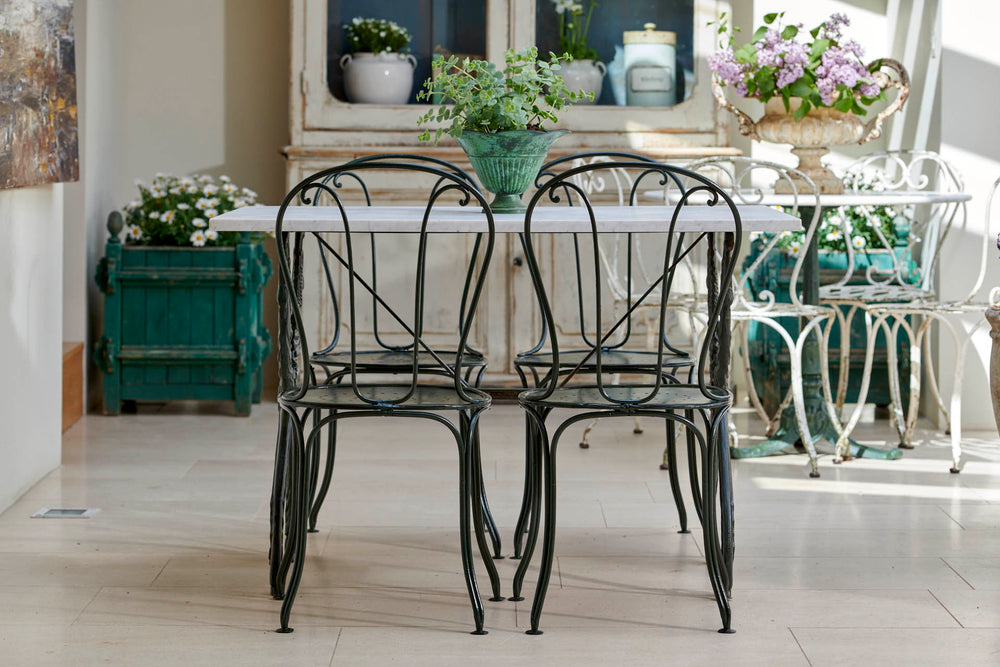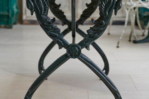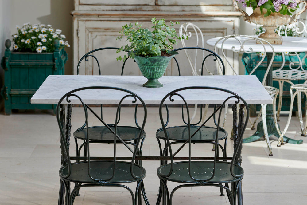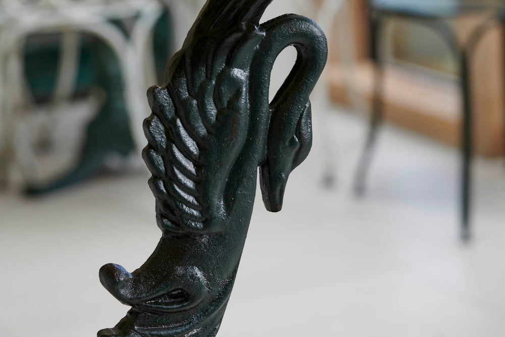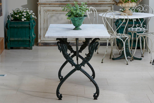 A marble top garden table with a cast iron base in its original dark green paint. The base includes an attractive swan neck design at each end. We have colour matched chairs from the same period to create a very attractive dining set that comfortably sits four people.