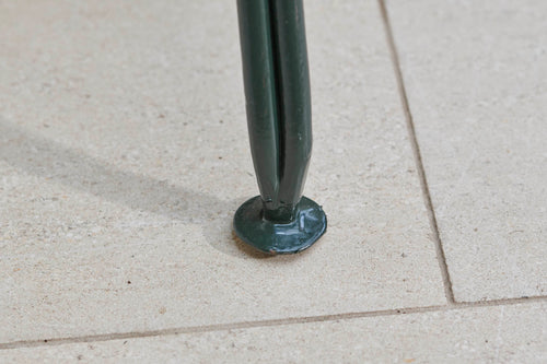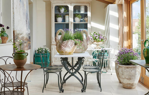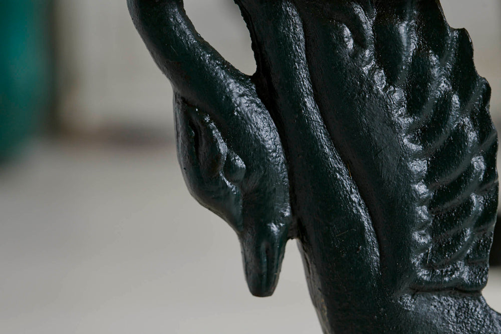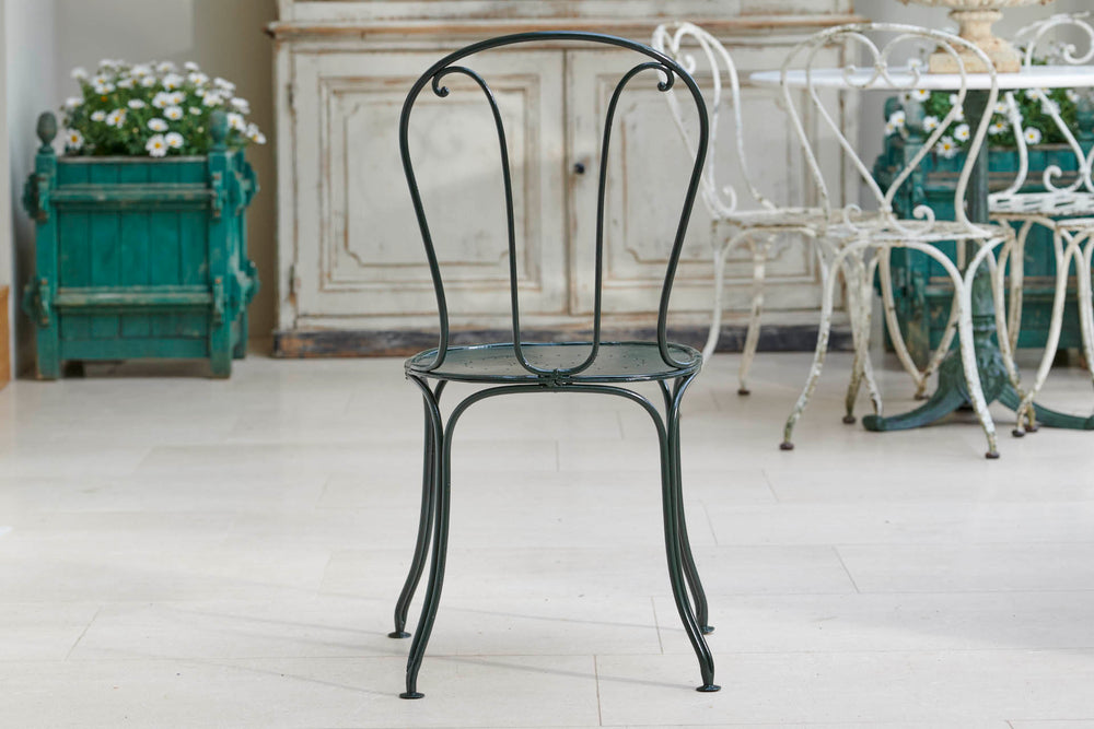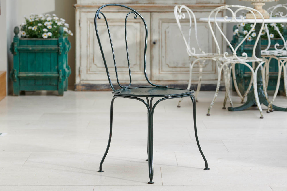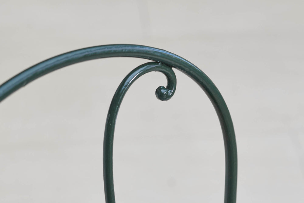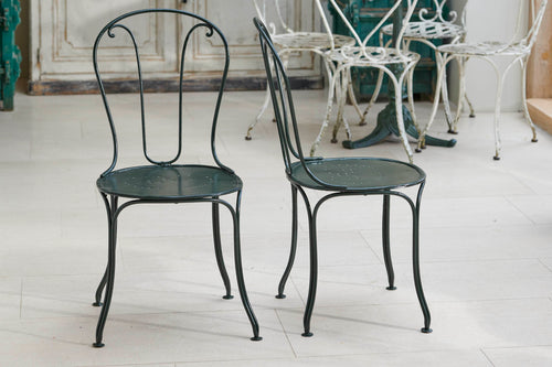 A marble top garden table with a cast iron base in its original dark green paint. The base includes an attractive swan neck design at each end. We have colour matched chairs from the same period to create a very attractive dining set that comfortably sits four people.