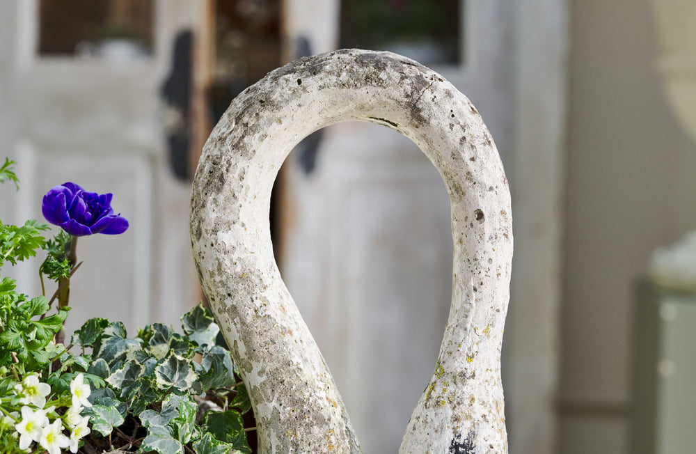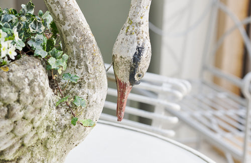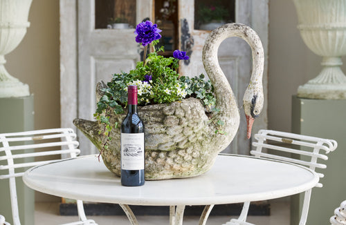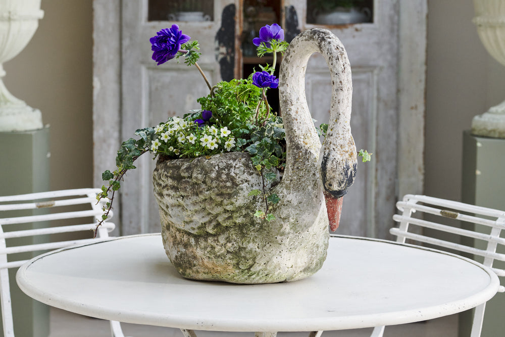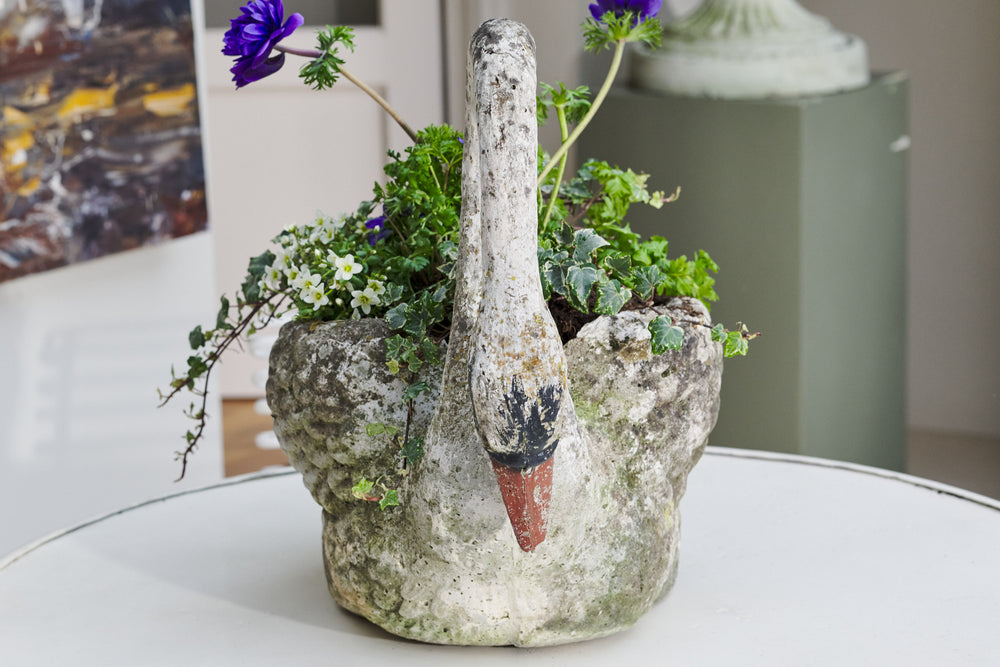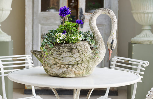 A charming swan planter from the 1930s. This swan has a beautifully curved neck and well-defined feather detail in the body. When filled with seasonal flowers this planter makes a lovely display.