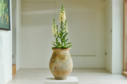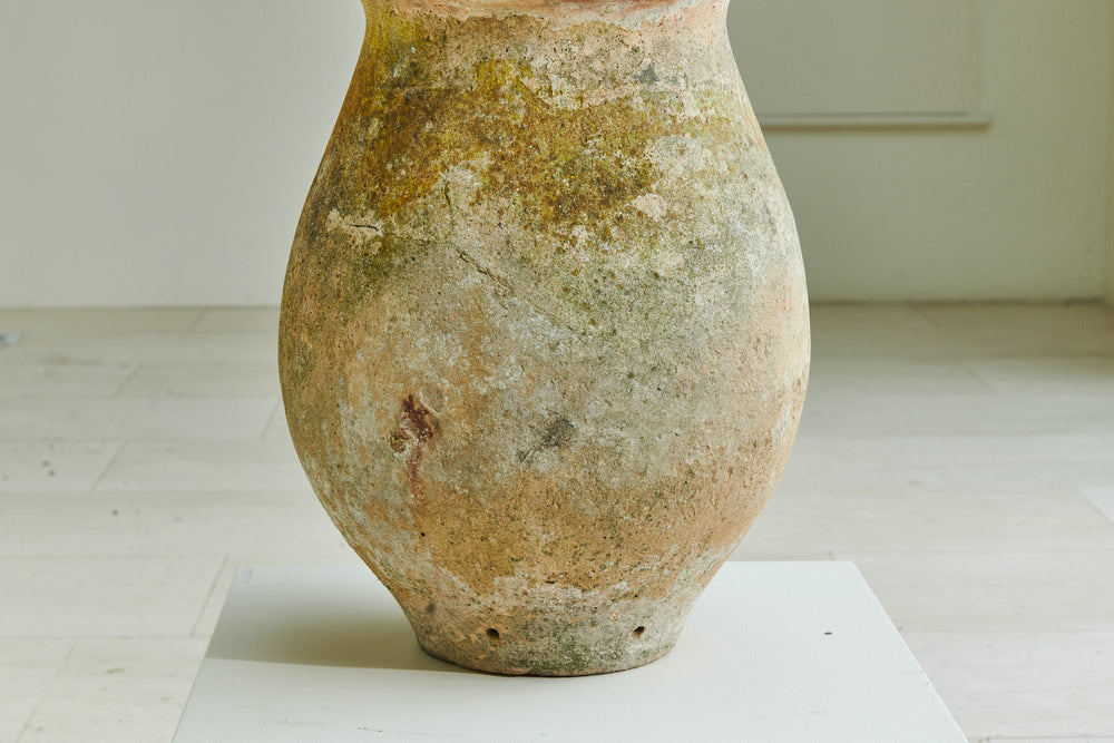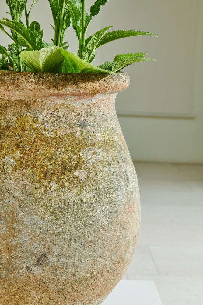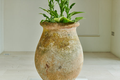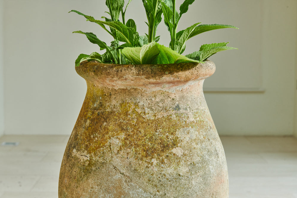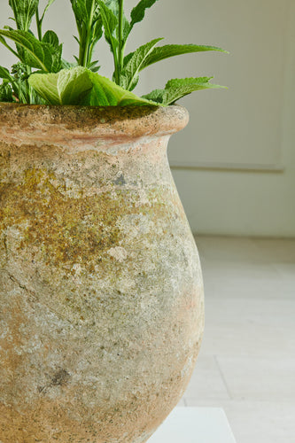 Our tall patina planter has a beautiful honeyed patina, made of terracotta and with drainage holes. It is almost Biot in shape but with no traces of paint.
