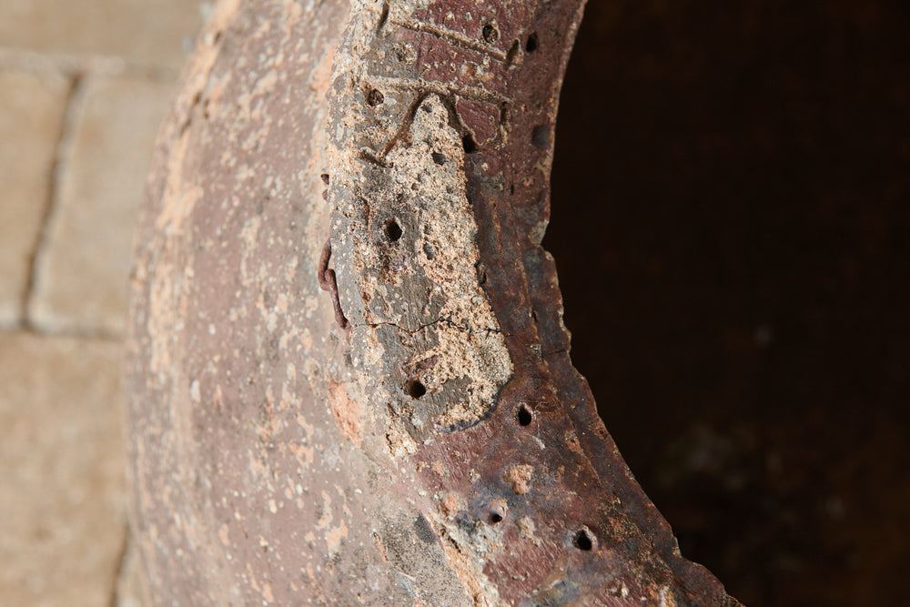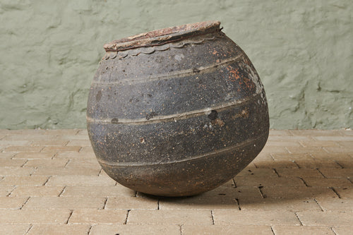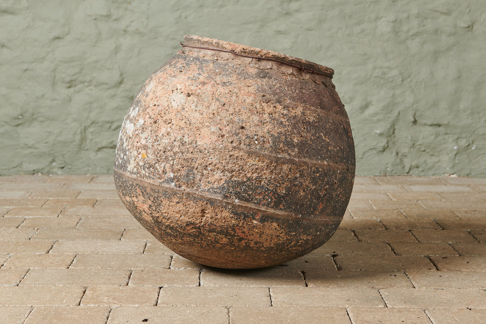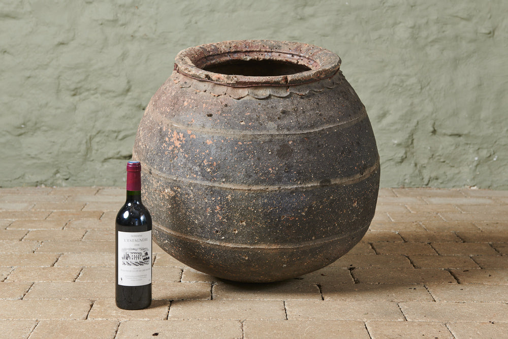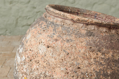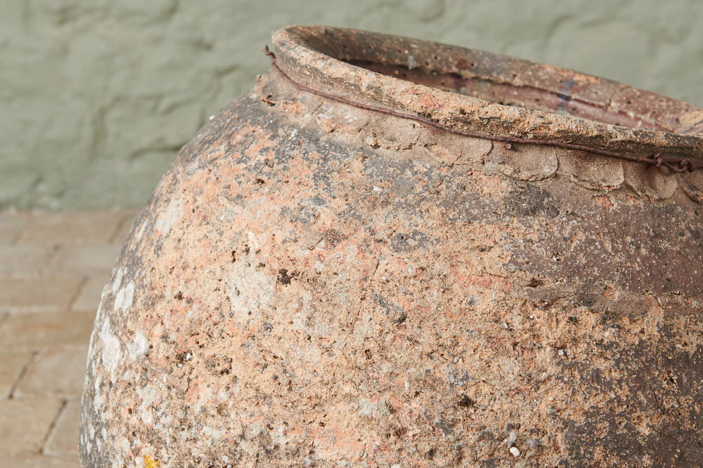 A 19th-century terracotta salt pot which would have originally been used to preserve food in the 19th century. We bought this as an attractive and quirky decorative pot which can be used inside or out. It has an attractive, weathered patina which is different on each side with some intricate decoration around the neck.