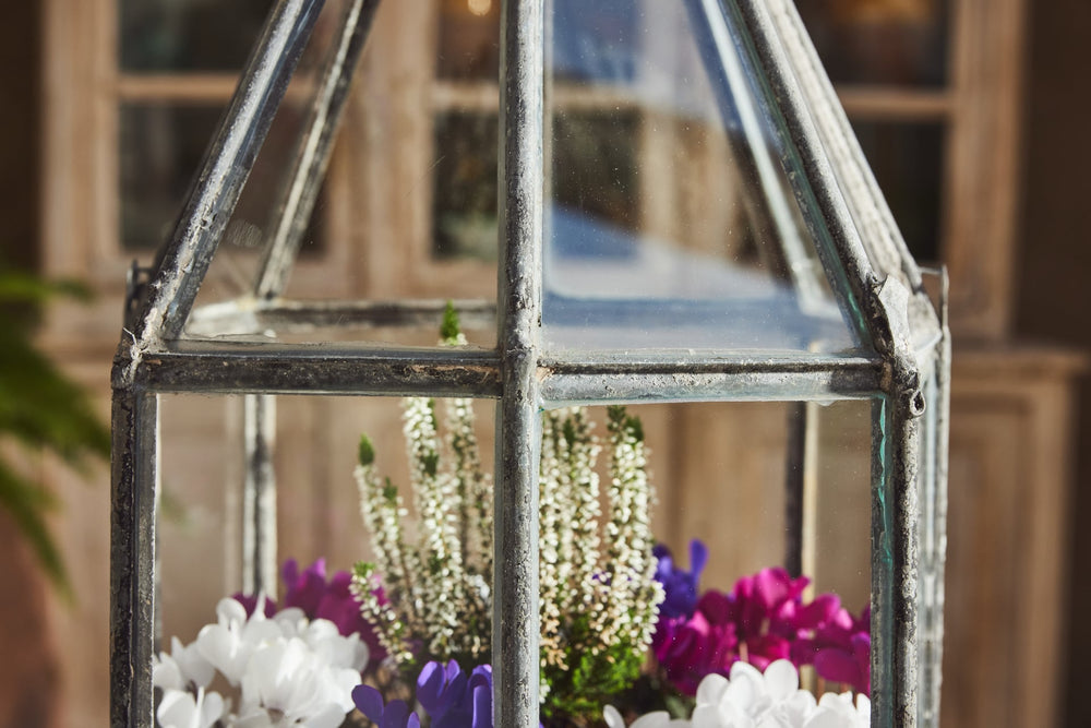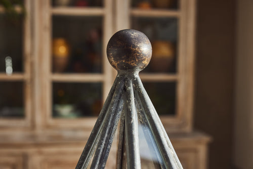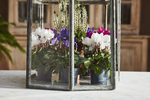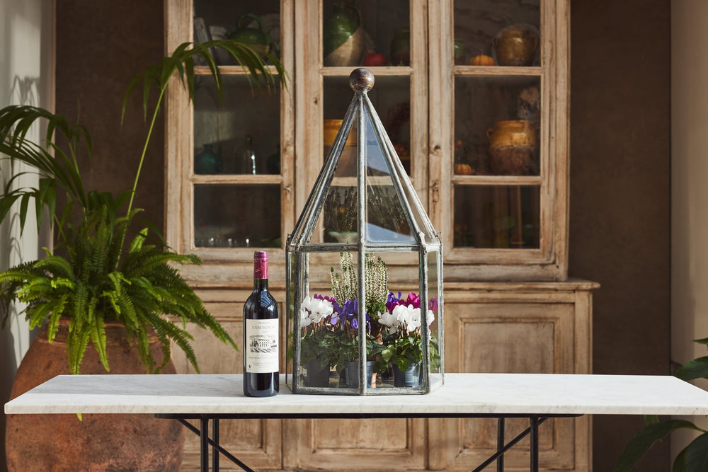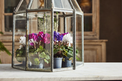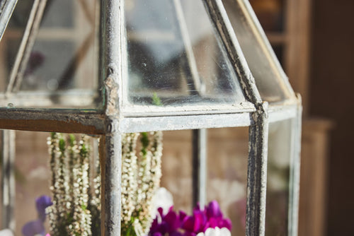 Six-sided mid-century terrarium in excellent condition, with original glass panels throughout and no cracks. The structure has a church-spire silhouette and is finished with a brass finial. One side is open for easy access, making it practical for planting, seasonal flower displays, or creating a small indoor garden. All original and a particularly characterful piece for year-round use.