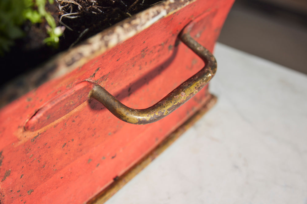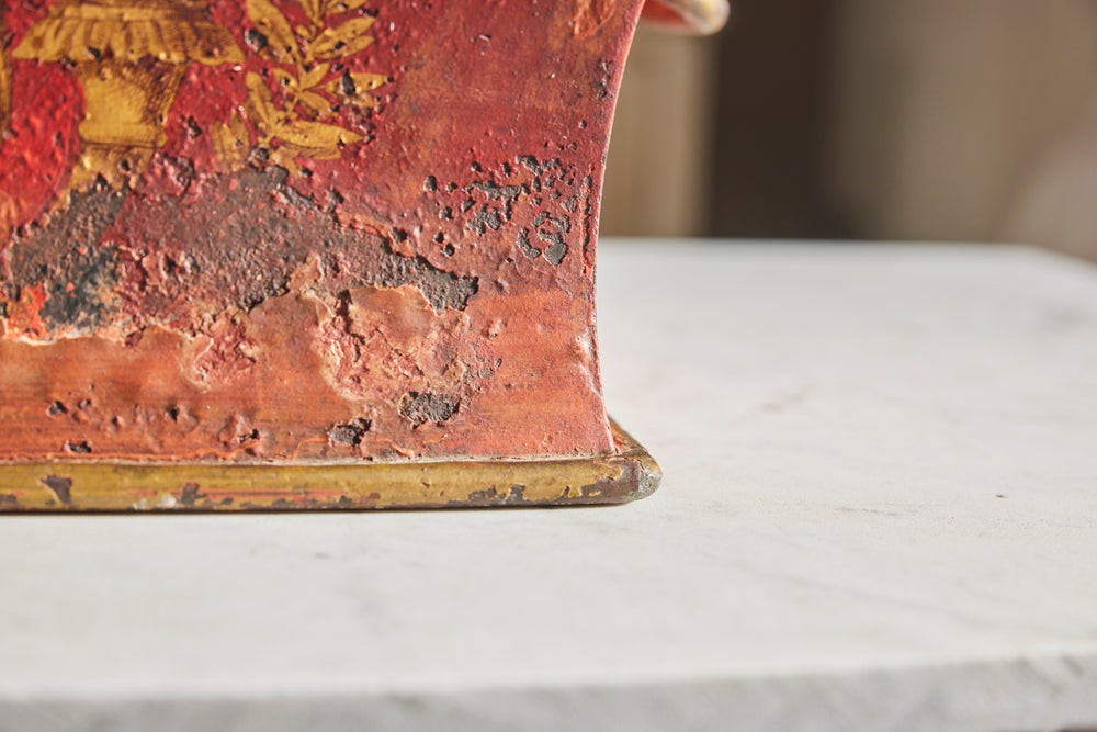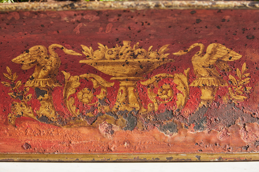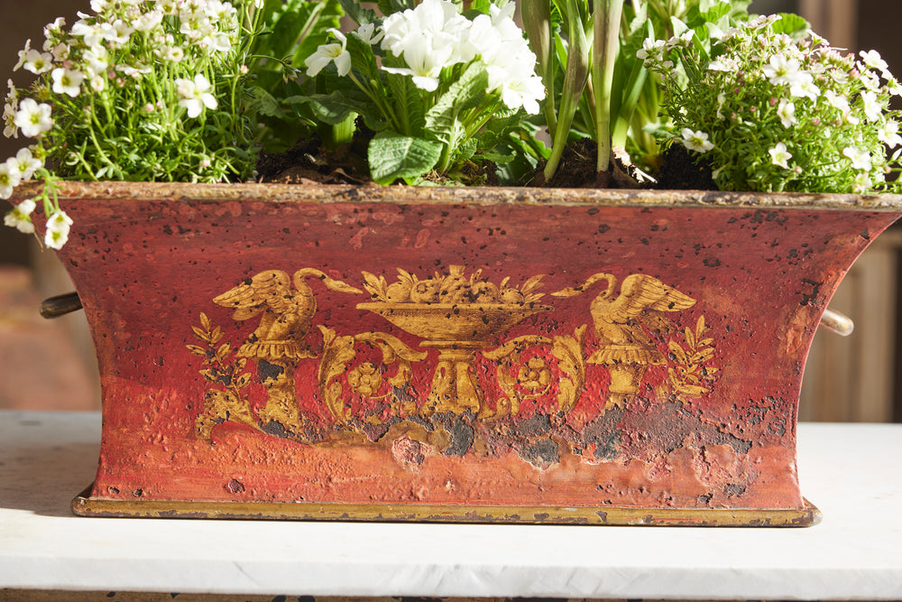 A late 19th-century toleware planter. Featuring a gracefully curved front with handles on either side, it has a straight, undecorated back, allowing it to sit flush against a wall. The rich red background is adorned with intricate gold leaf detailing, showcasing two regal swans flanking a platter of fruit amid delicate foliage. A striking and elegant piece, perfect for adding a touch of historic charm to any interior.