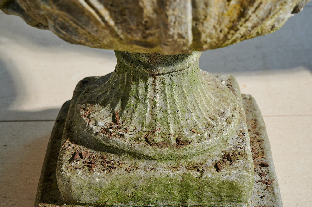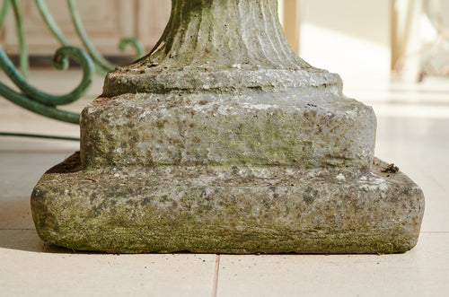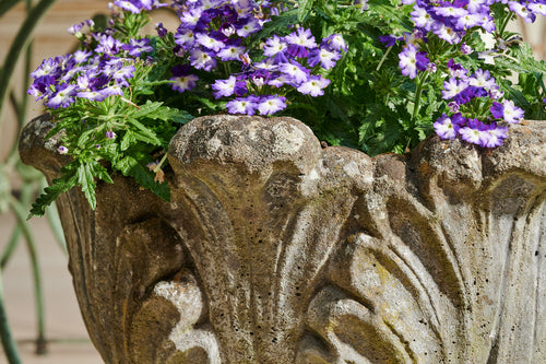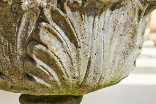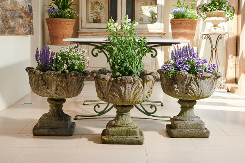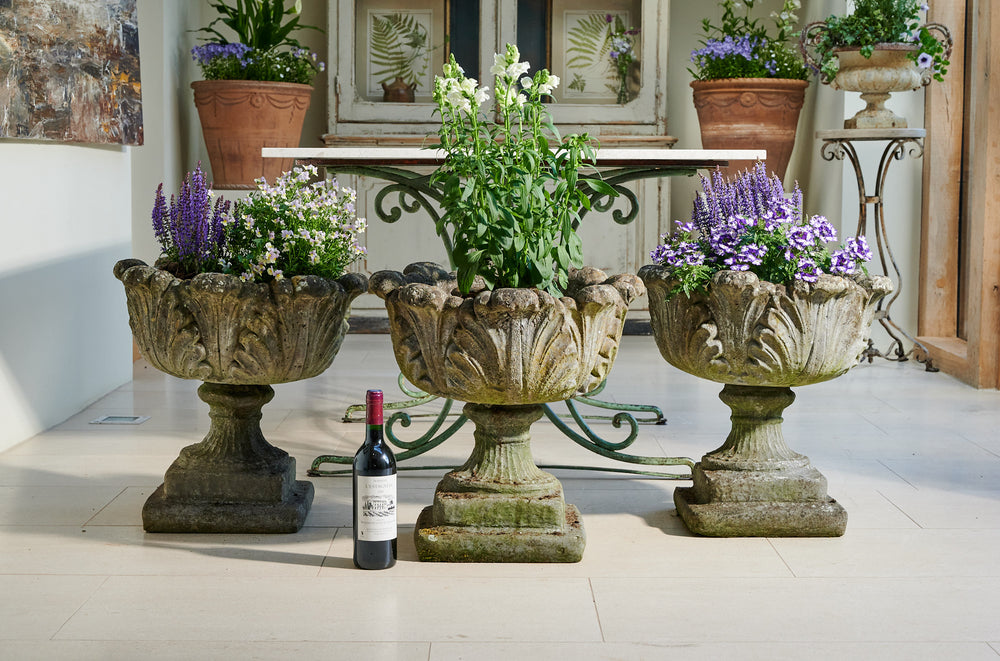 Made of cast stone this trio of planters decorated with acanthus leaves have a beautiful weathered patina. They are in two pieces making them easy to move and put in place.