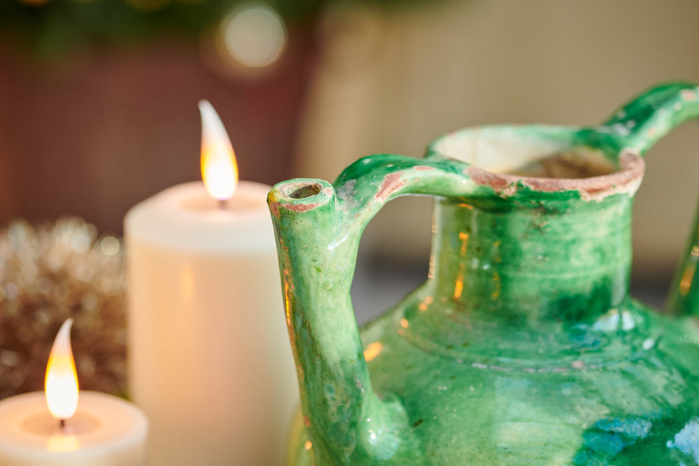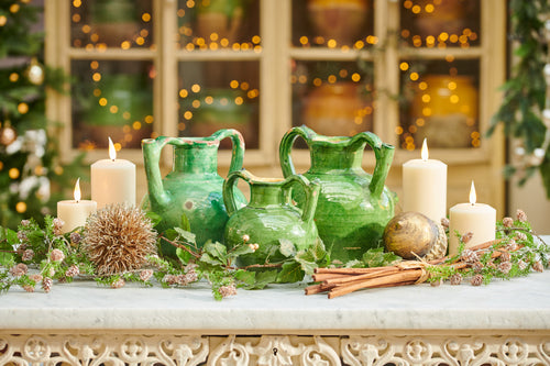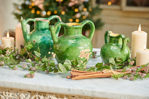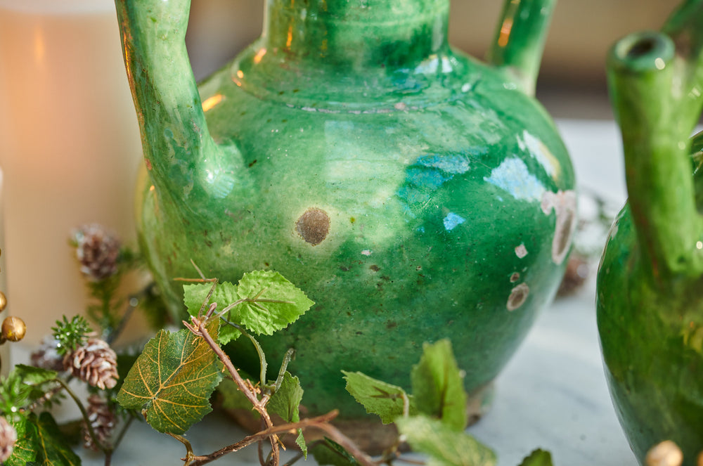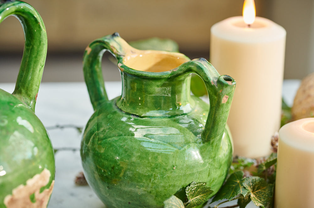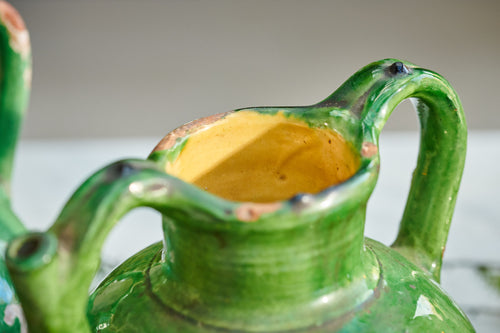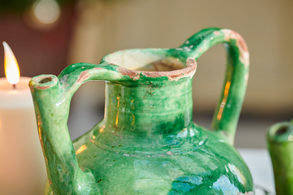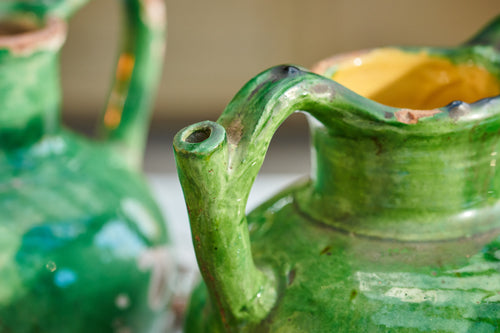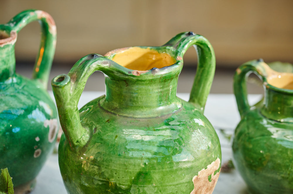 In a previous life, these Languedoc Roussillon Orjols would have been used for dispense olive oil. Our green glazed trio which is in very good condition considering age and use now make very attractive decorative items in the home.