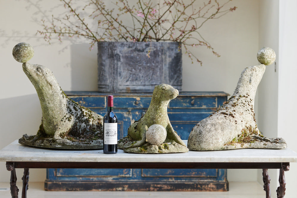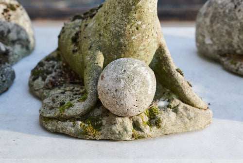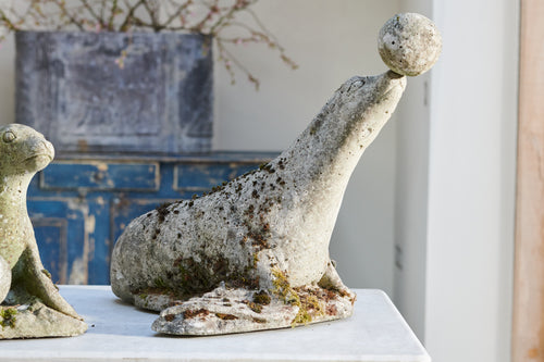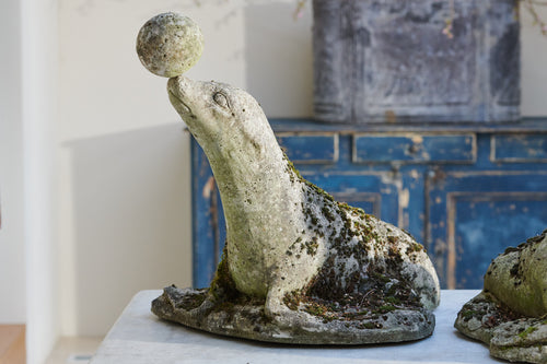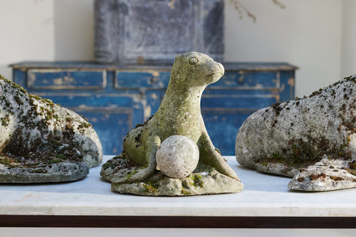 We believe these wonderful seals are completely original. Made from composite stone this characterful family are signed by the maker and date from around the 1930s. They are in untouched original condition and feature the adult seals balancing balls with a pup with a ball sitting next to him. These would look fabulous beside a pond or a swimming pool.