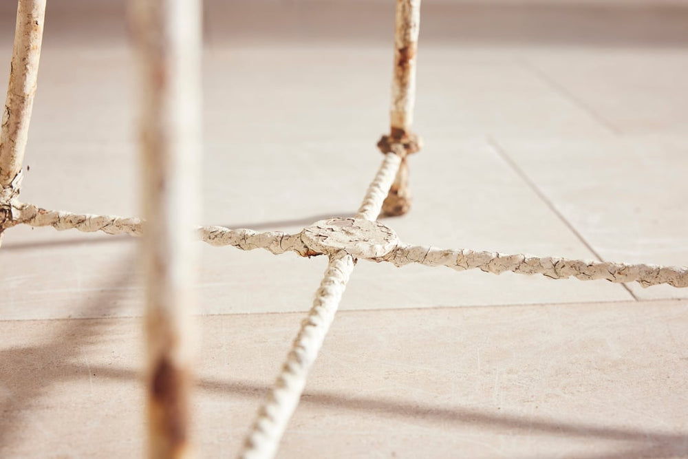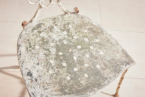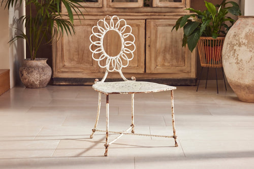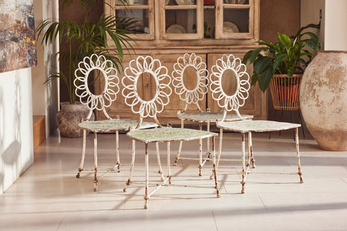 Each chair features a hand-forged wrought iron back in the shape of a daisy—playful, eye-catching, and completely unique. Unusually for the period, the seats are made from aluminium, adding an unexpected contrast in materials and texture.