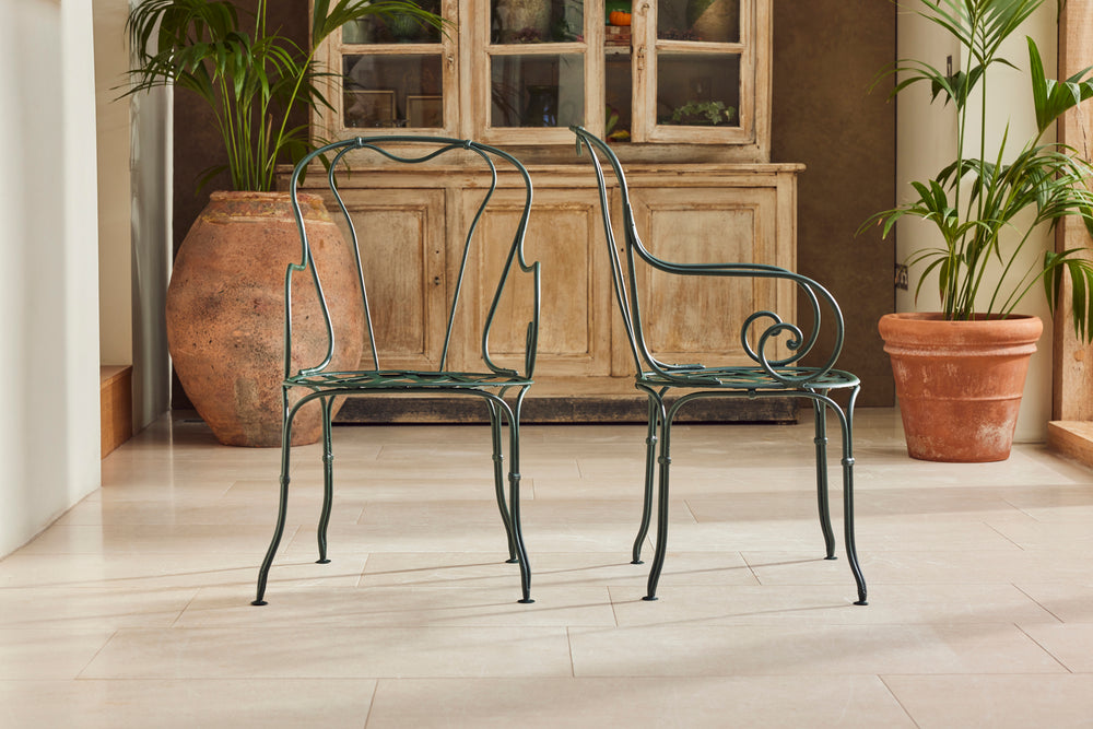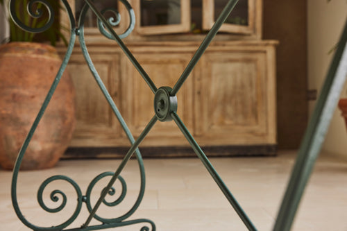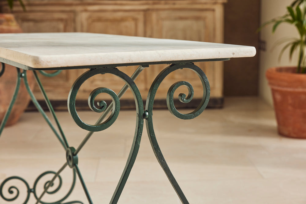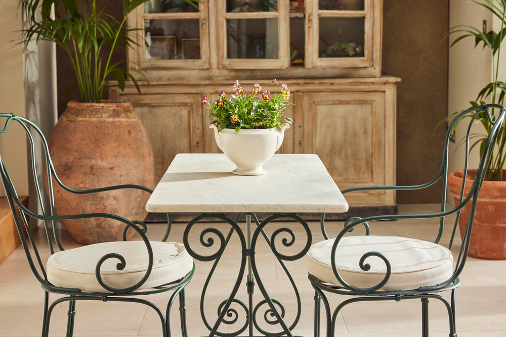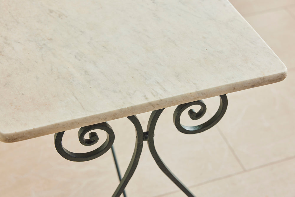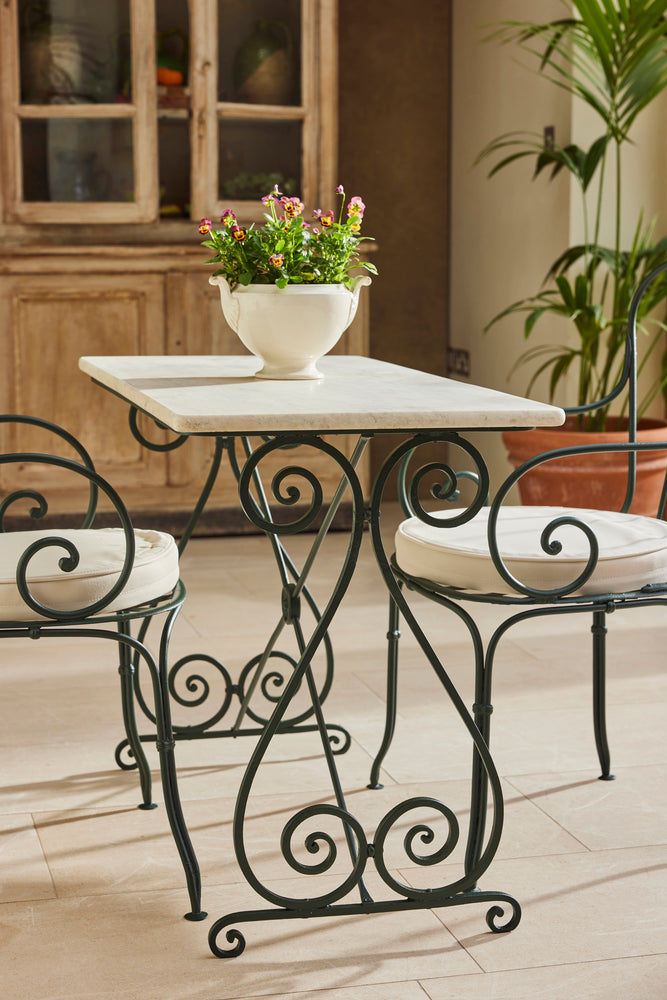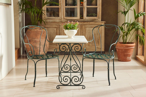 This charming marble top table and 2 arm chairs are perfect for dining a deux! The 1930’s table has beautiful scroll curves and a removable marble top. The good size armchairs complete with cushions make this a very comfortable dining set.
