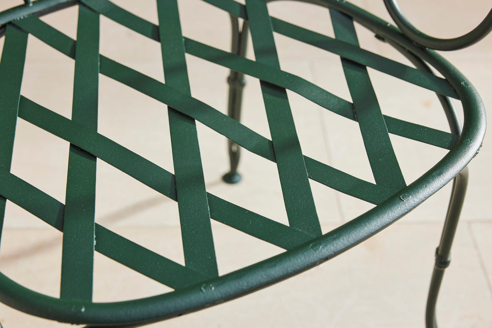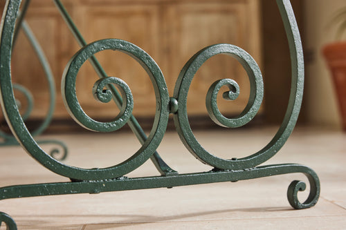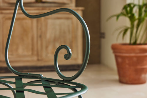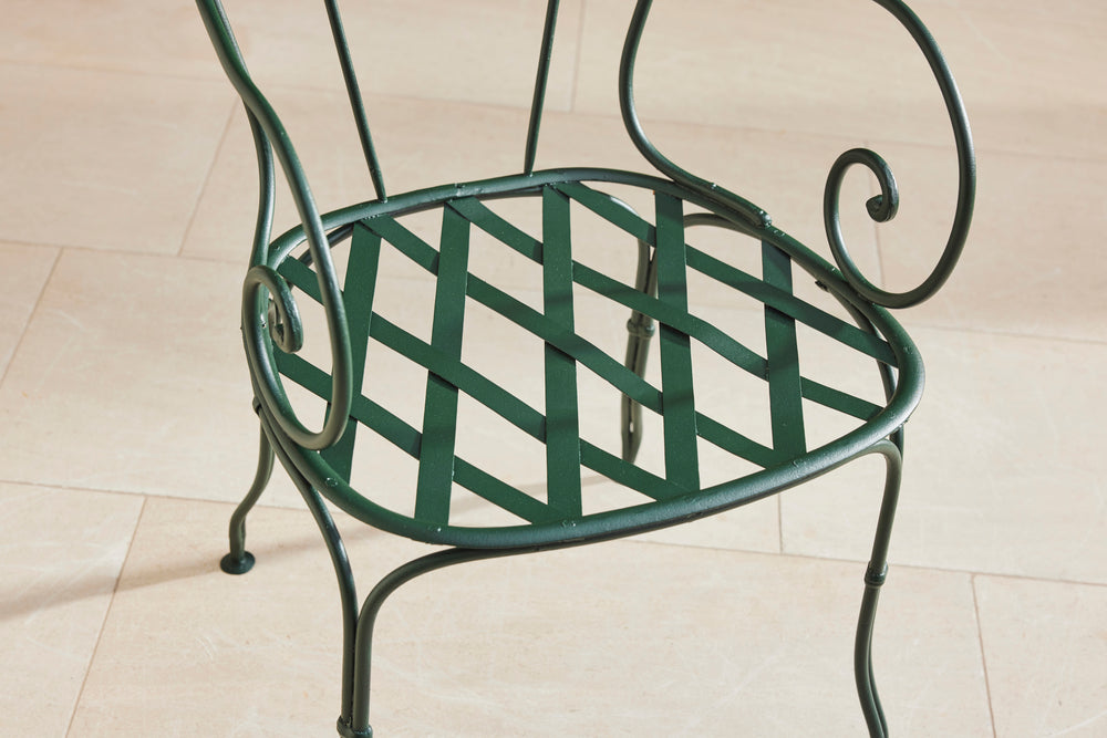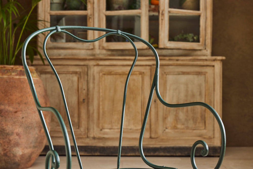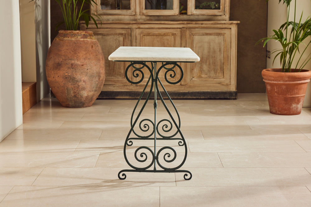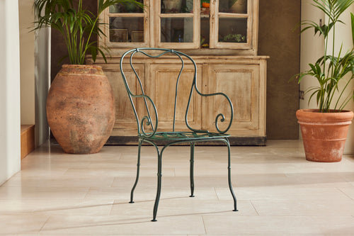 This charming marble top table and 2 arm chairs are perfect for dining a deux! The 1930’s table has beautiful scroll curves and a removable marble top. The good size armchairs complete with cushions make this a very comfortable dining set.