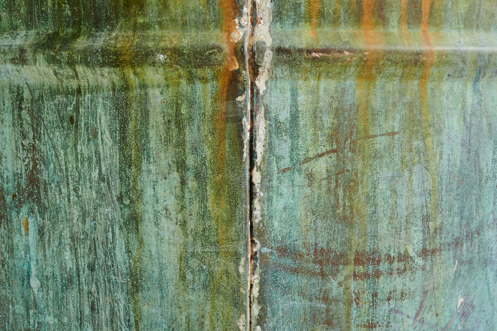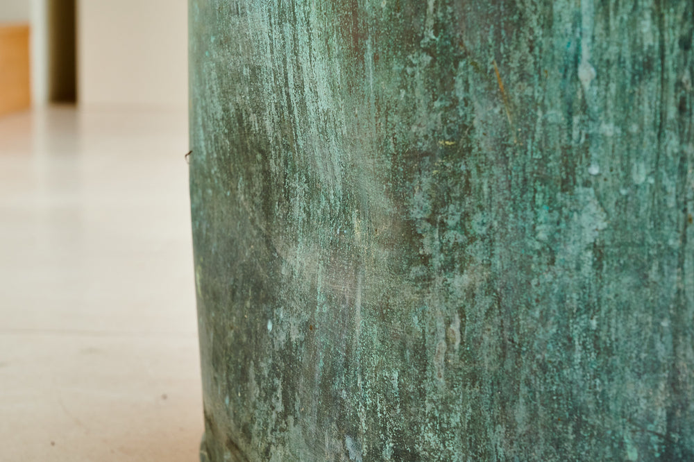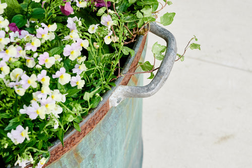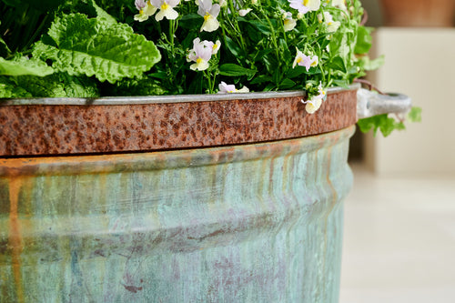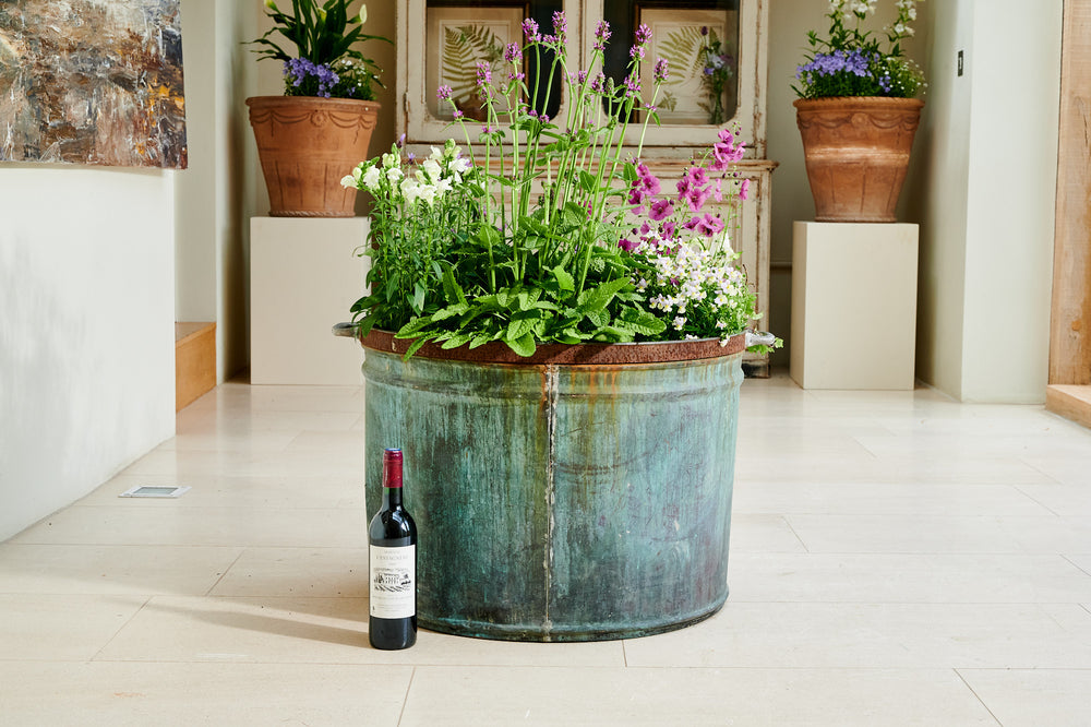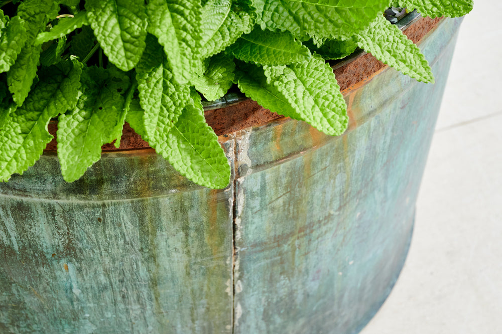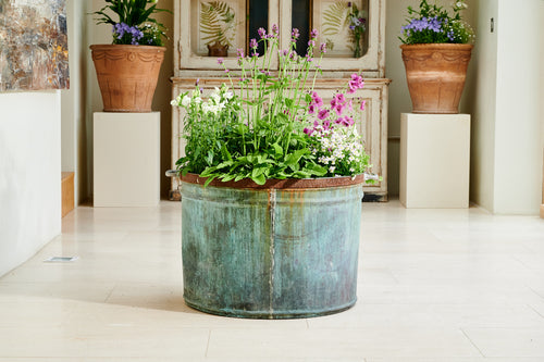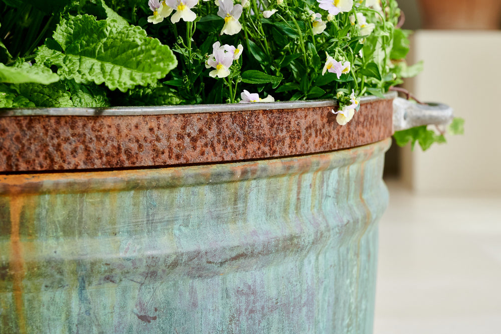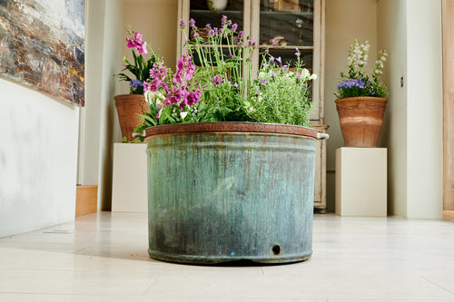 An attractive verdigris copper planter with a cast-iron rim and handles. This would make a very useful planter around the garden. It has a rough cut hole in one side for drainage.