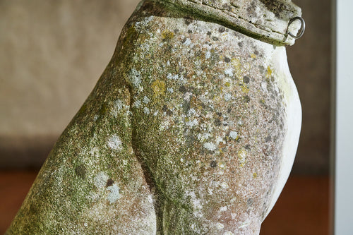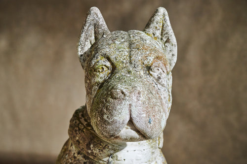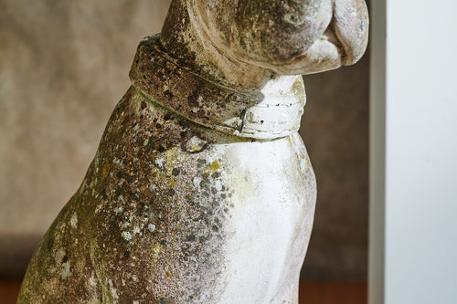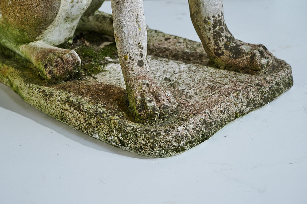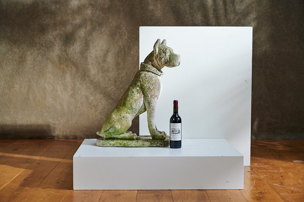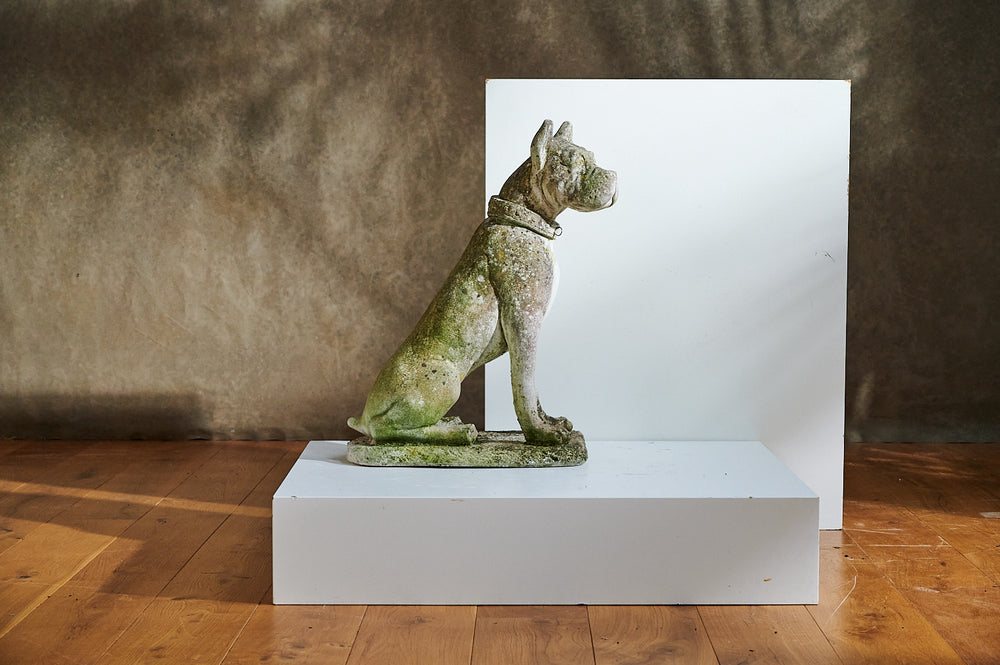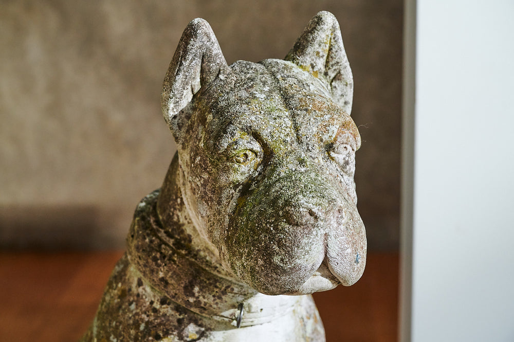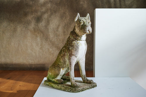 A lovely life-size composite stone dog from the mid 20th century. He has a great expression on his face and the mossy patina which would see him fit seamlessly into any mature garden. We think the design is probably based on a boxer.