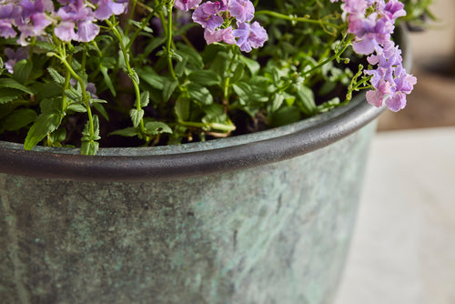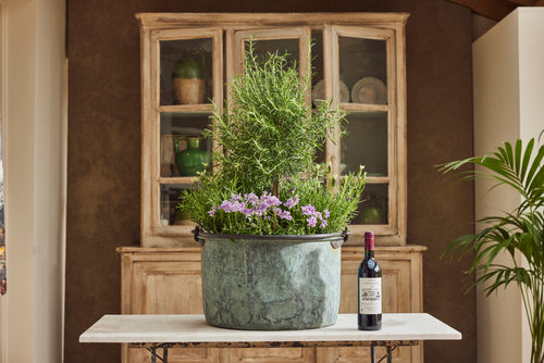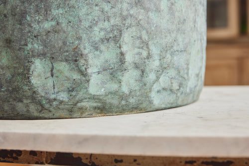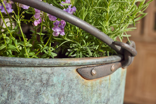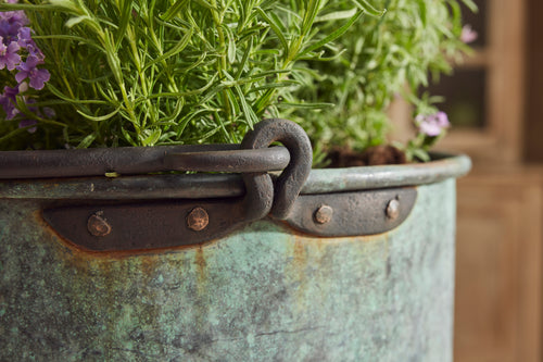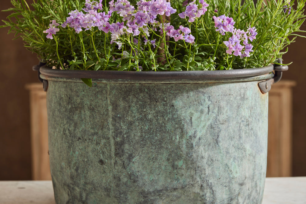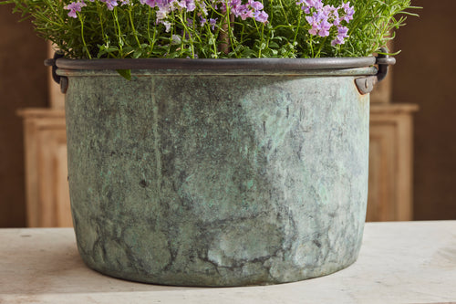 A 19th-century copper bucket which has developed a really attractive and natural verdigris patina. It has a cast iron handle and has the size to make a really nice planter in the garden or the home.