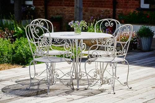 The circular mesh table and four carver chairs are finished in stylish white paint. The graceful curves of the chair backs and table and chair legs belie the robustness of this set. If you're looking for a set which is practical yet still has that elegant vintage vibe, this is the perfect garden dining set.