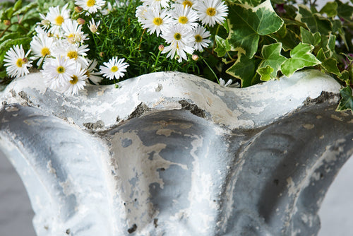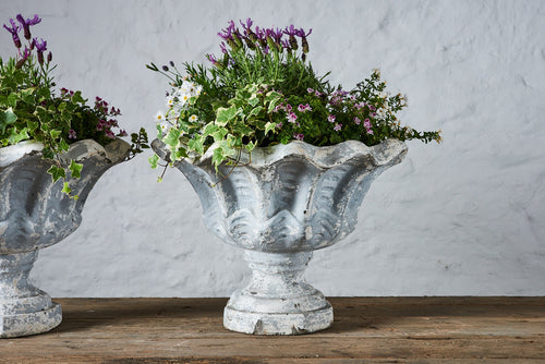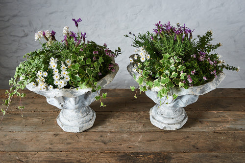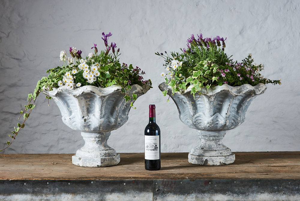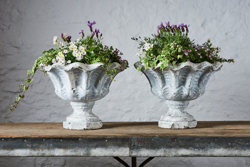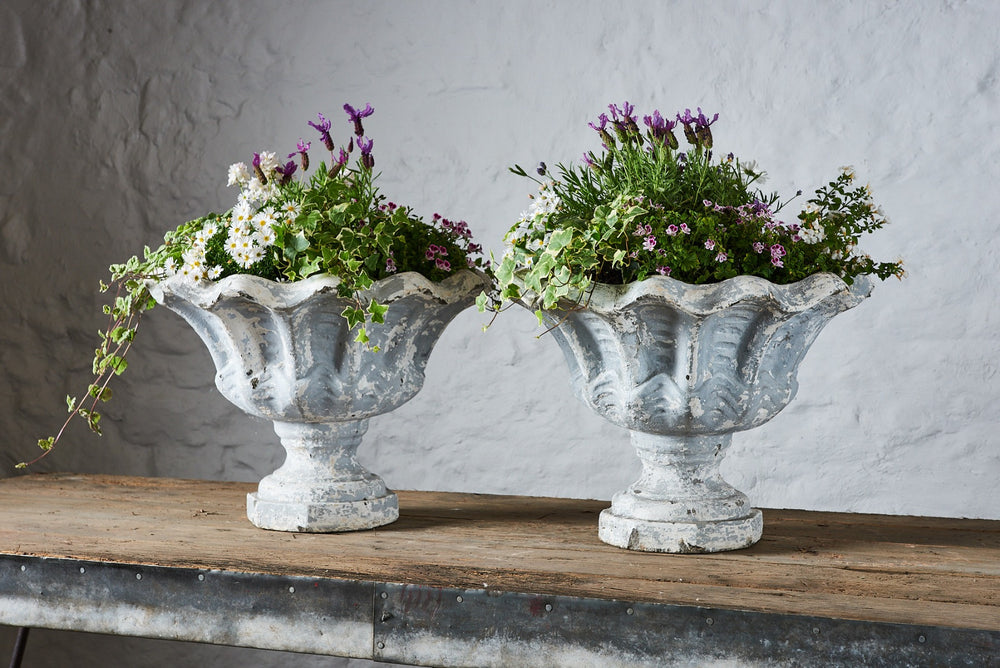 These vintage composite stone planters have a really lovely grey/white aged patina with curved edges in a leaf-like design. They are large enough(being over 0.5m wide) to enable the design of a very attractive seasonal planting scheme. They are in very good vintage condition and would fit seamlessly into a mature garden.
