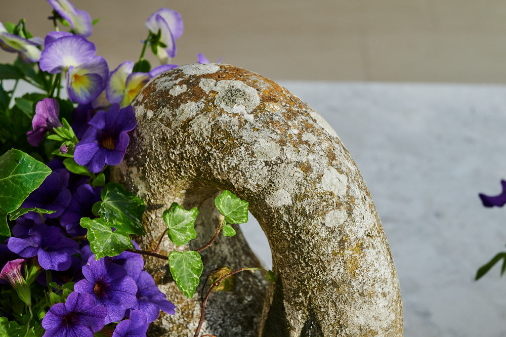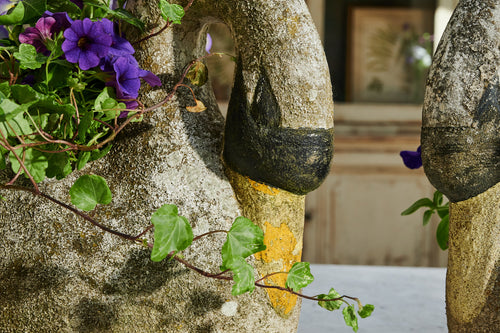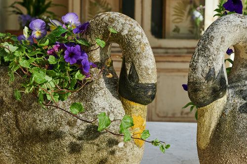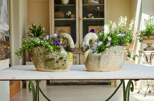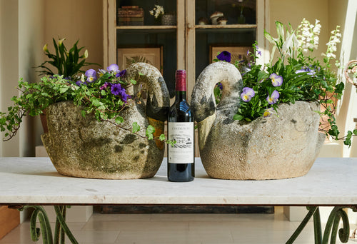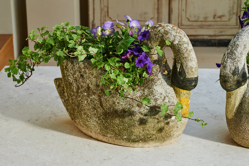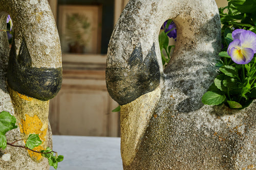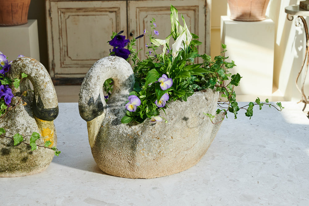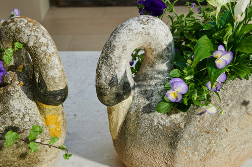 A pair of composite stone swan-shaped planters. There is something about the graceful shape of the swan that lends itself perfectly to planters. Swans are a popular shape for planters and look fabulous with a delicate, floral planting scheme. The patina on this pair of swans gives them a gorgeous, natural finish, and the painting on their faces and bills adds real character