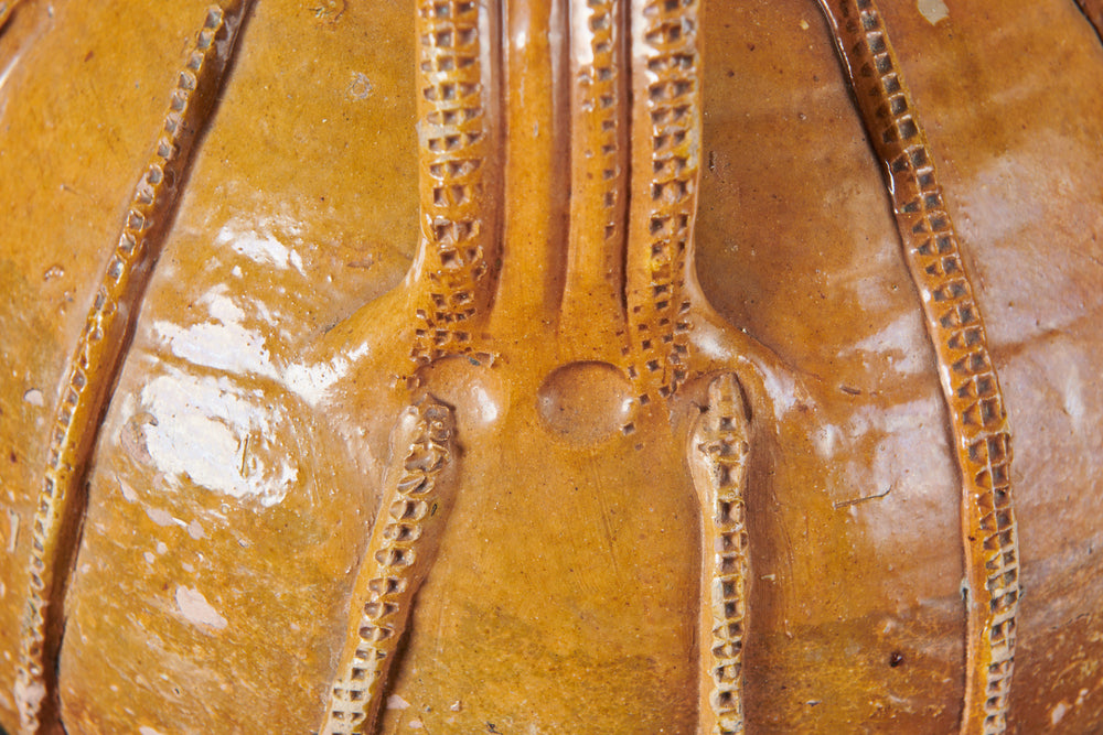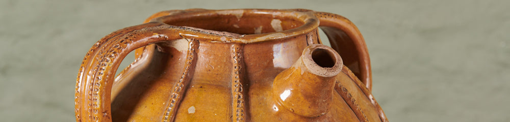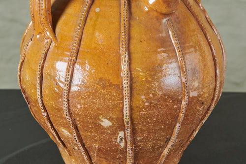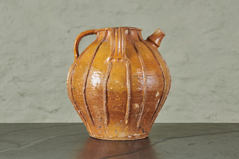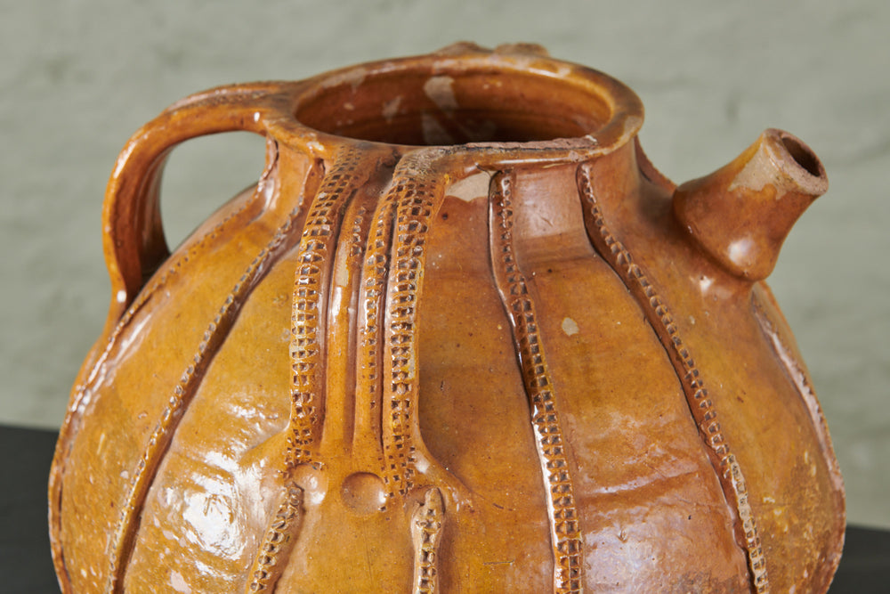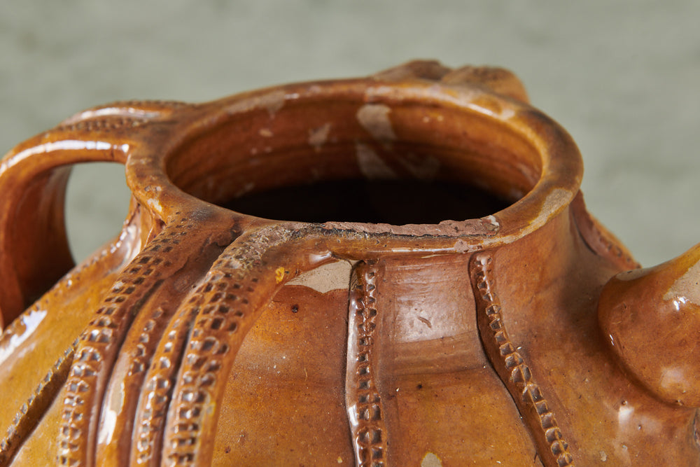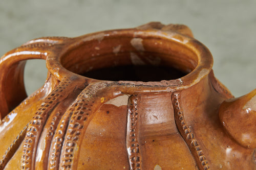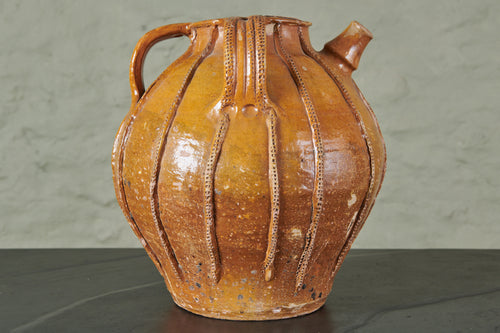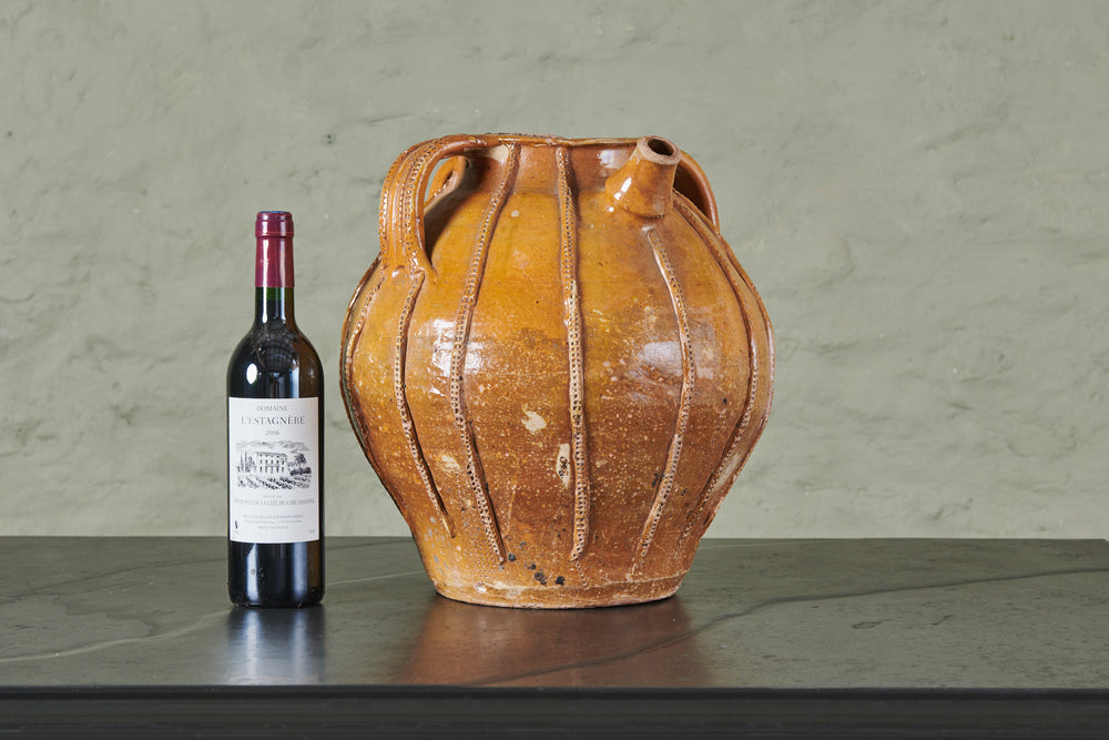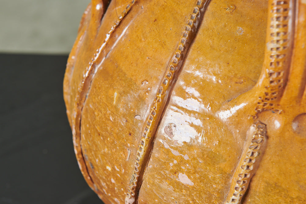 A really interesting terracotta jar that would have been used to store walnut oil. In the original untouched condition, it has developed a really attractive mustard coloured patina within the glaze. Would provide character to any shelf!