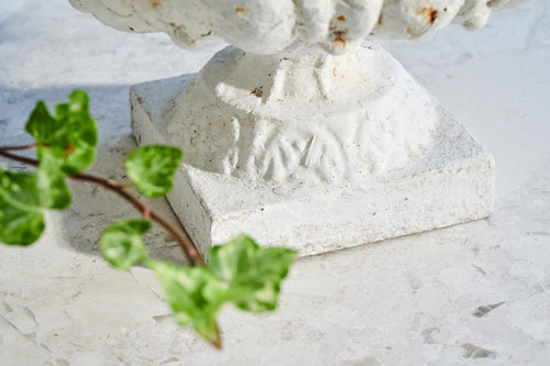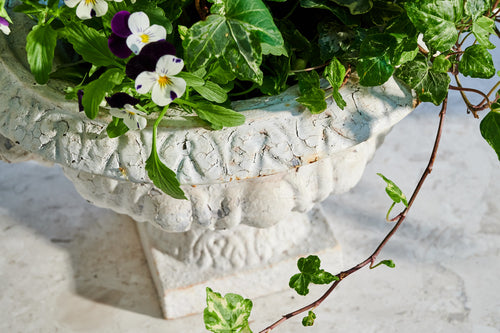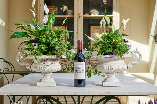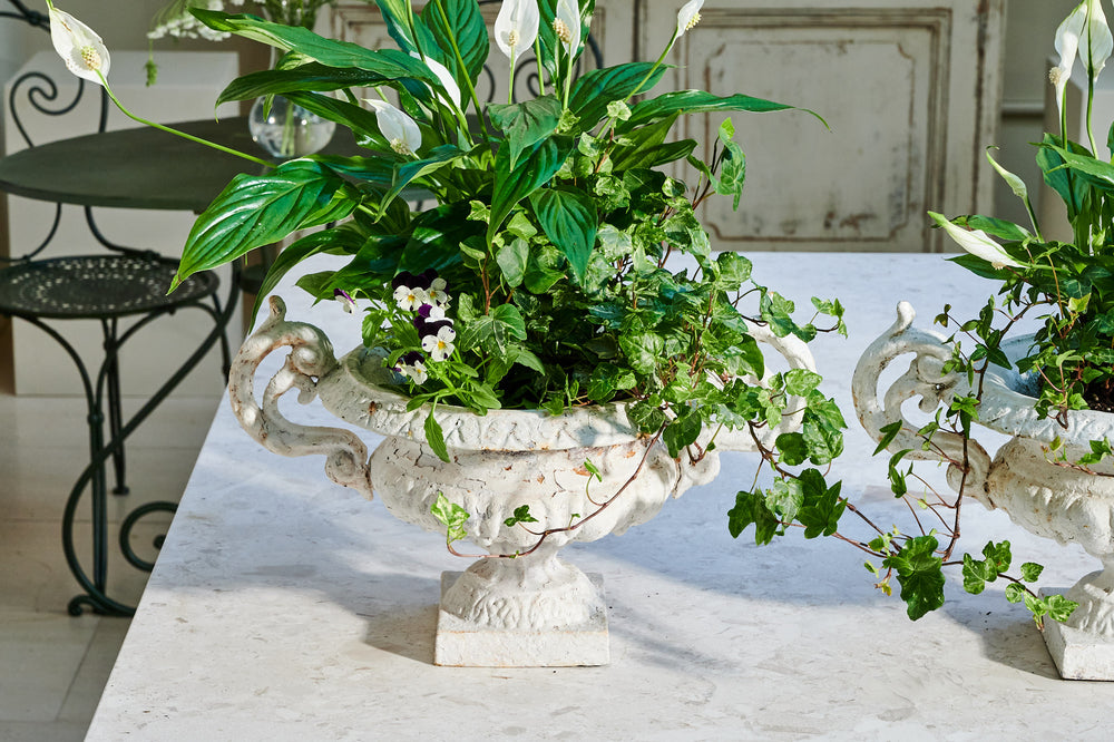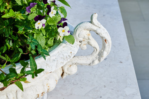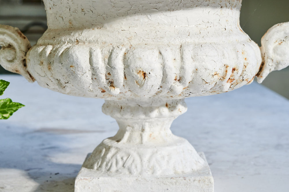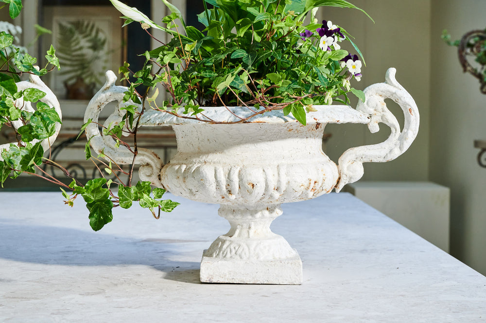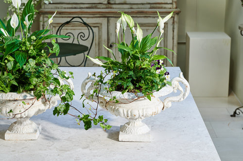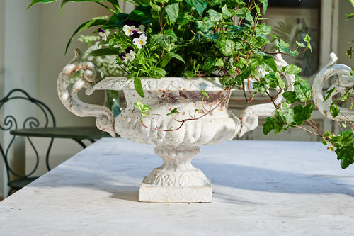 This small pair of 19th century cast iron urns would be suitable for use inside the home as well as in the garden. With dolphin styled handles and in their original paint they could be used for planting or just as decorative items in their own right.