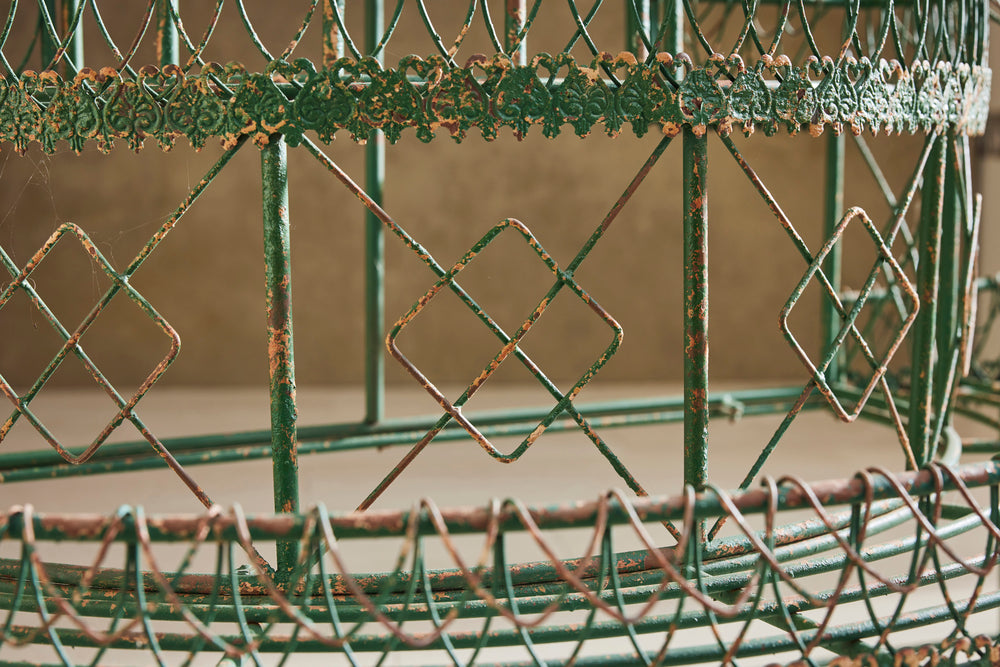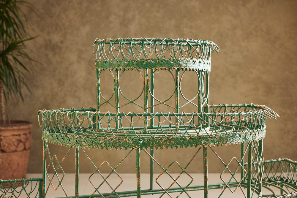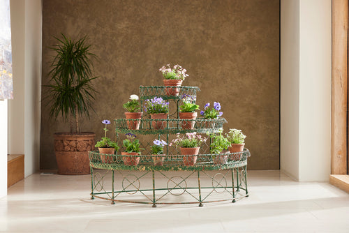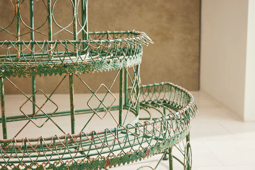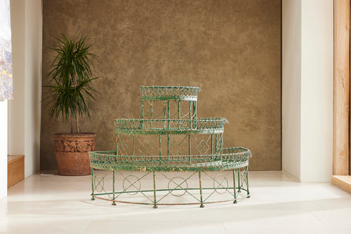 We couldn't resist this beautiful 3 tier wire framed plant stand from the 19th century. Could be used both inside and out to create fantastic plant and flower displays throughout the year. In good condition, considering both age and use, the stand features a decorative metal frieze on each tier.
