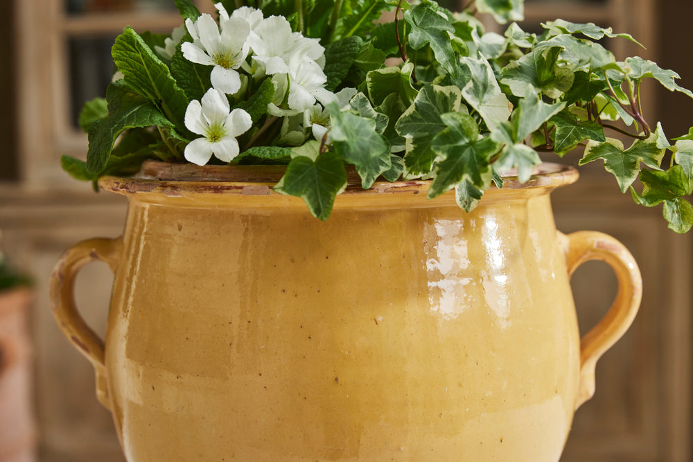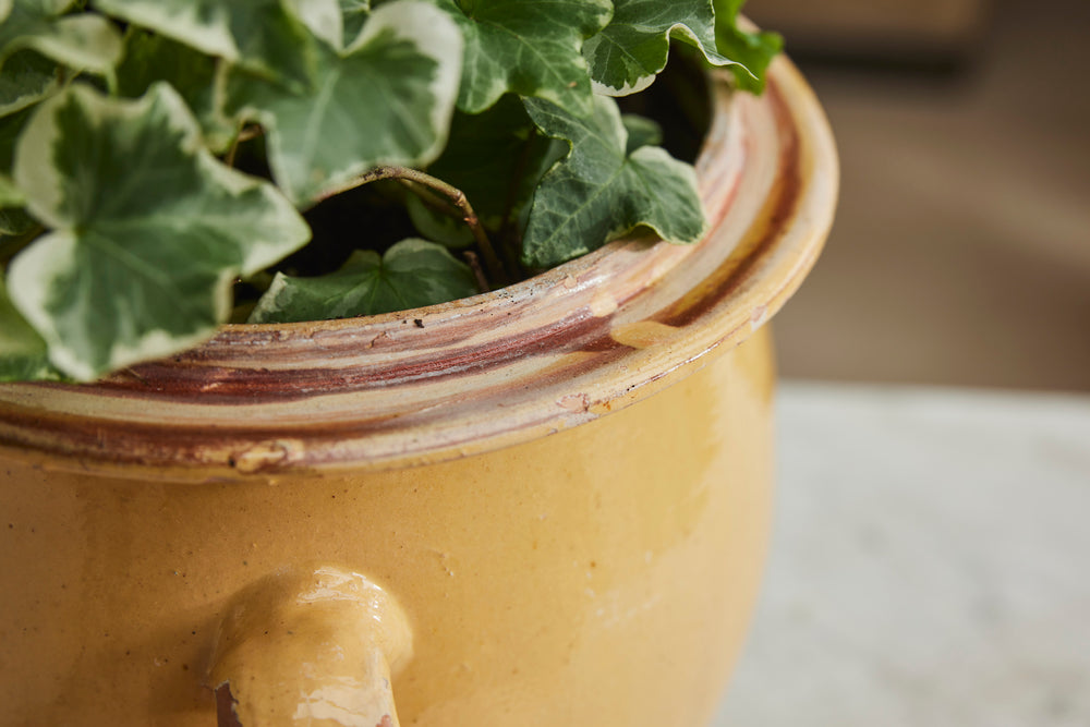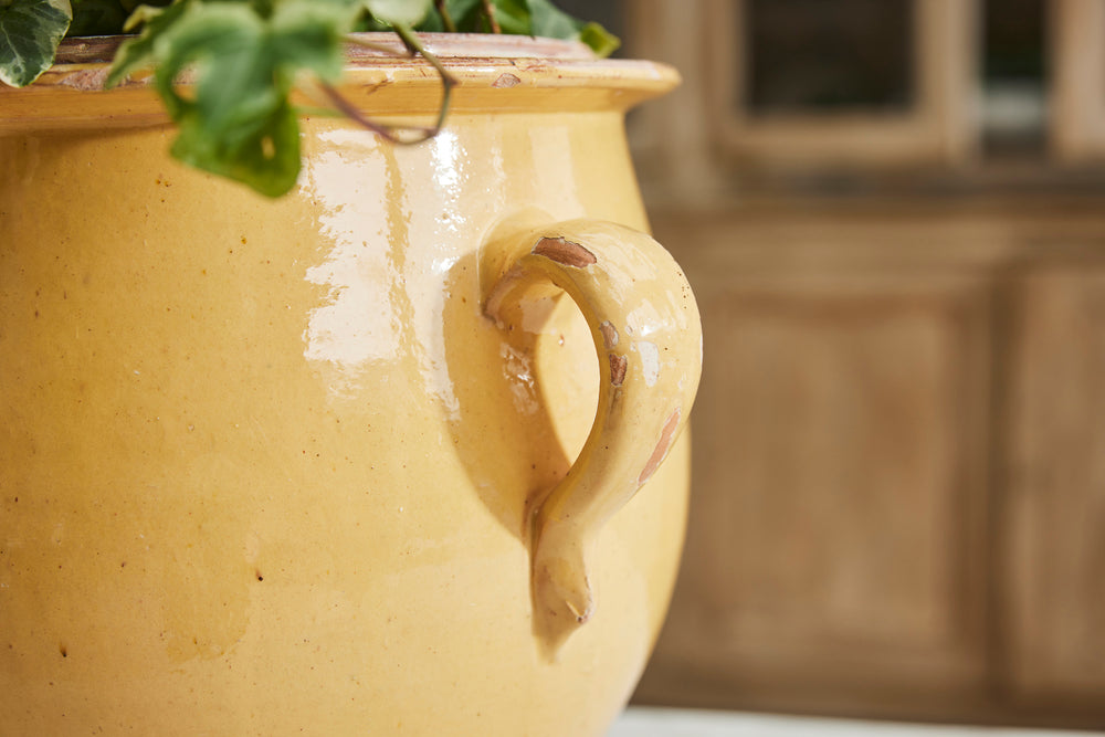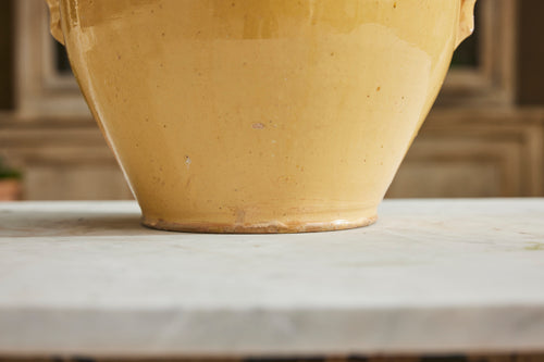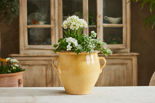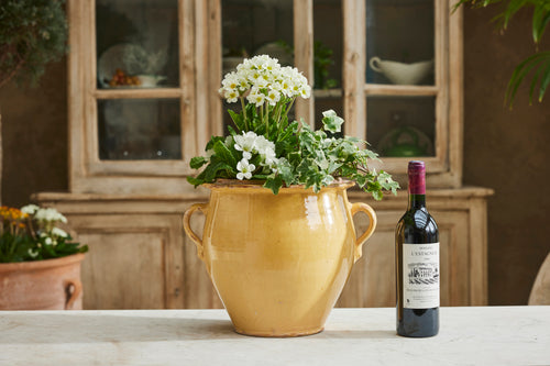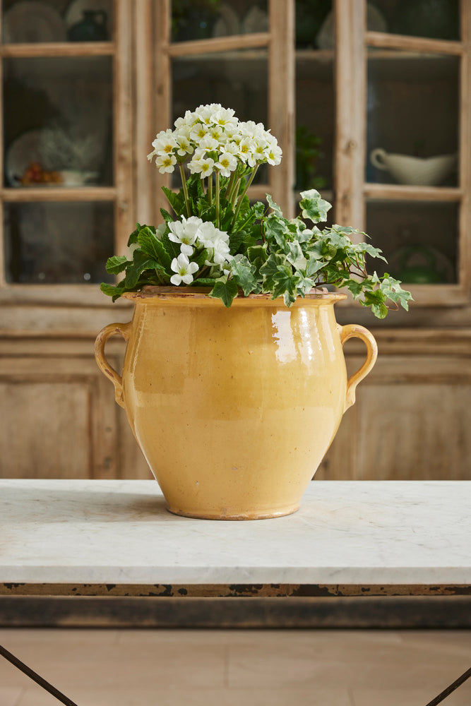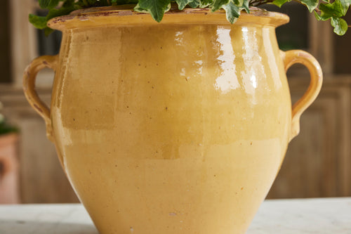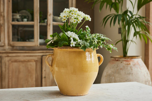 This early 20th-century terracotta pot, finished in a rich yellow glaze, originally came with a lid and was used for food storage. We chose it for its potential as a striking vase or planter—perfect for fresh blooms or seasonal plants. A distinctive decorative piece that adds warmth and character to any space.