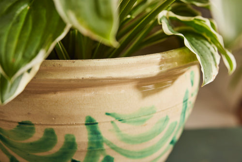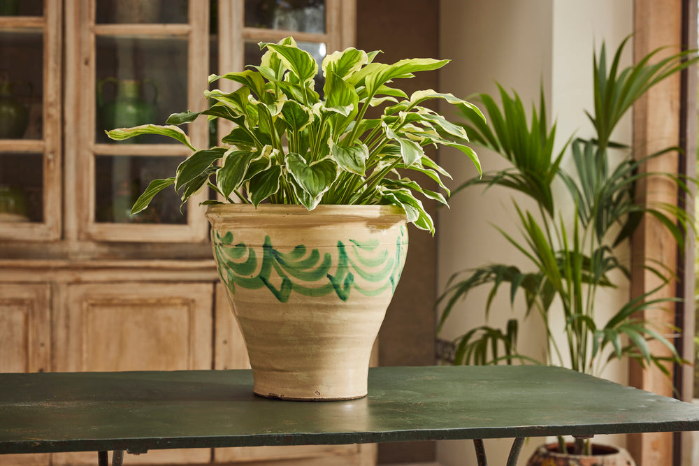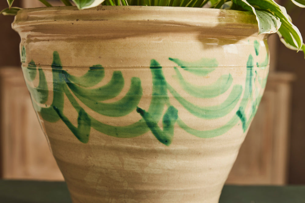 This pot has a cheerful sunny yellow glaze with an attractive green design around the upper body. it is perfect for house plants and is inclusive of all important drainage hole.