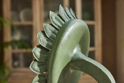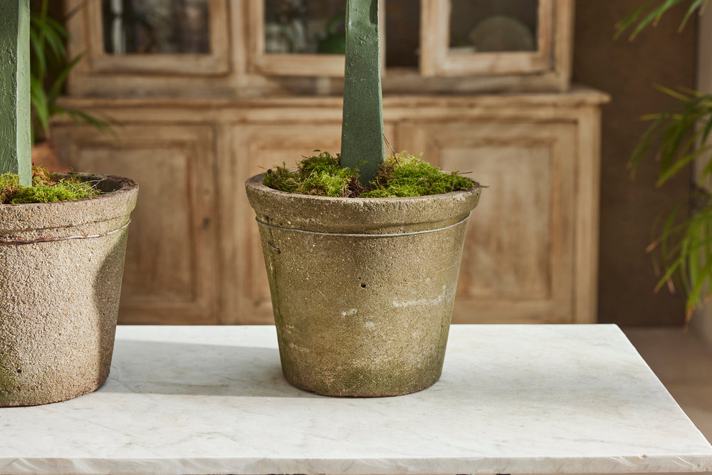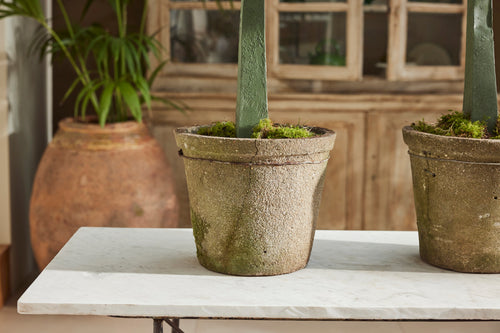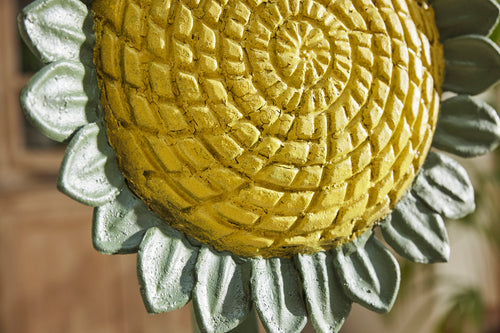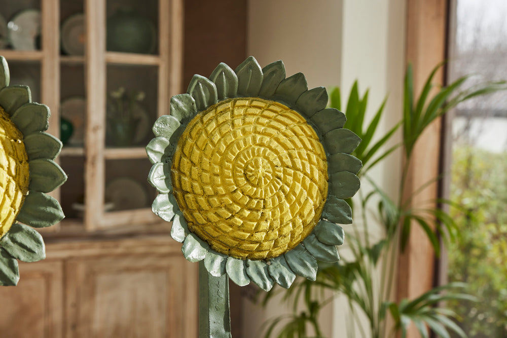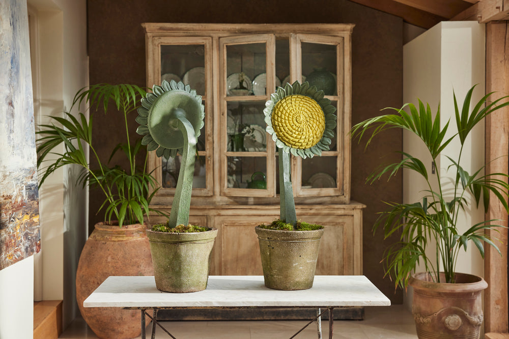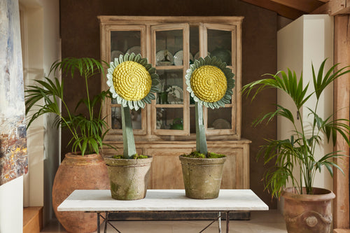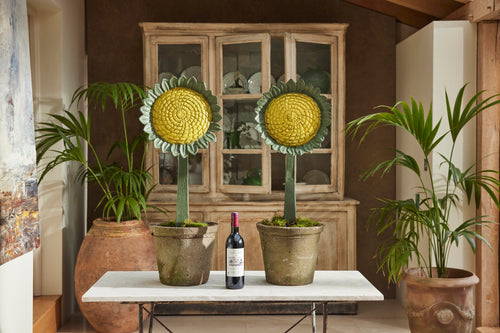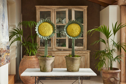 These highly decorative sunflowers would make a fun and striking addition to any garden, bringing a unique and playful touch to your outdoor space. They are securely fixed into two vintage concrete pots, adding to their character and stability. The stems and flower heads are crafted from painted zinc, while the leaves are made from lead, showcasing a mix of textures and materials. This handmade pair is in very good condition having been lightly restored. They would add a cheerful brightness to any garden, no matter the season.