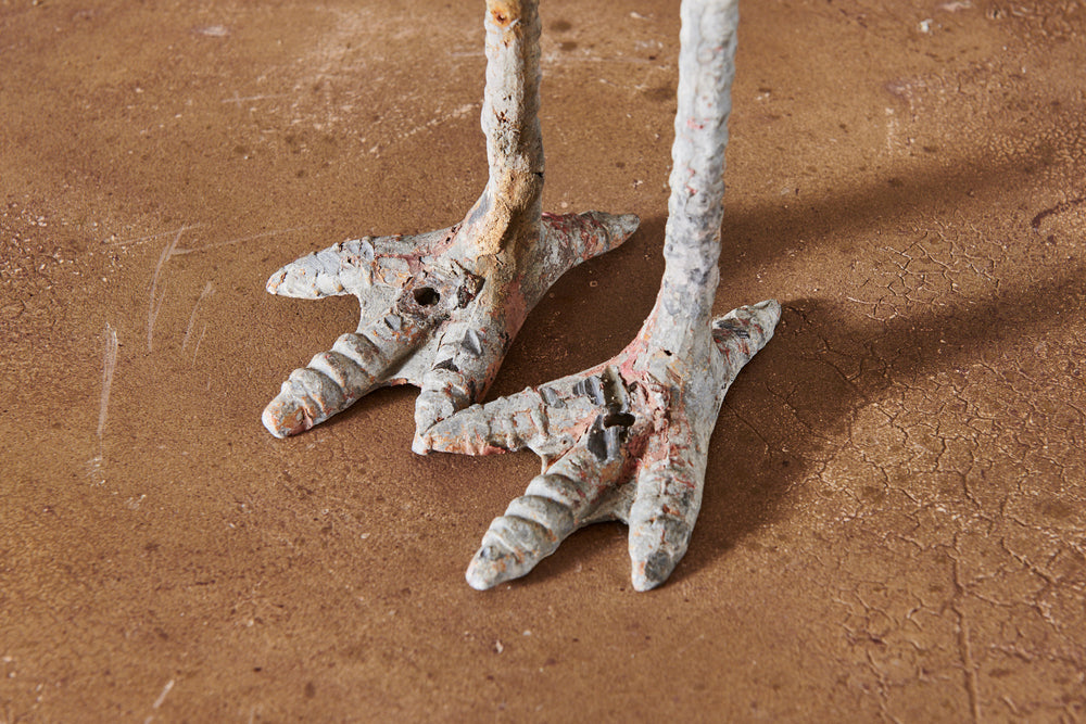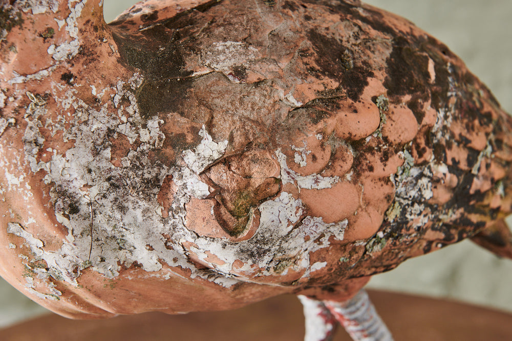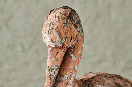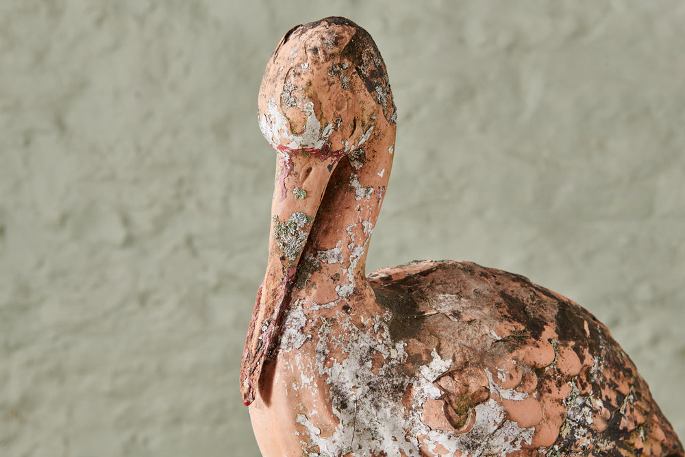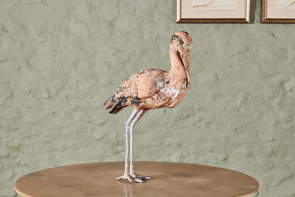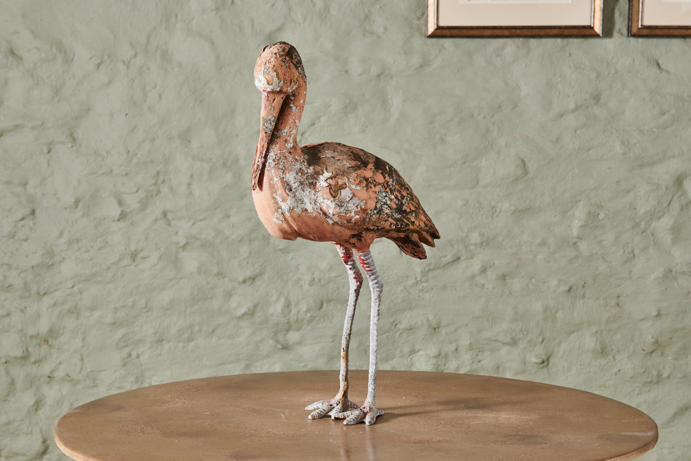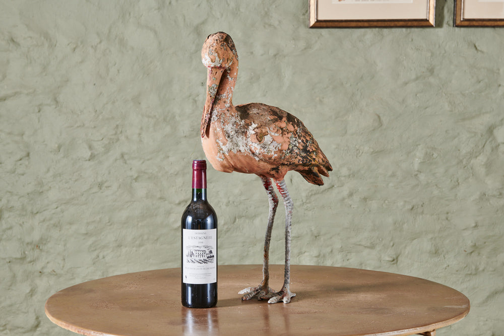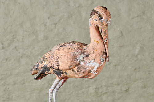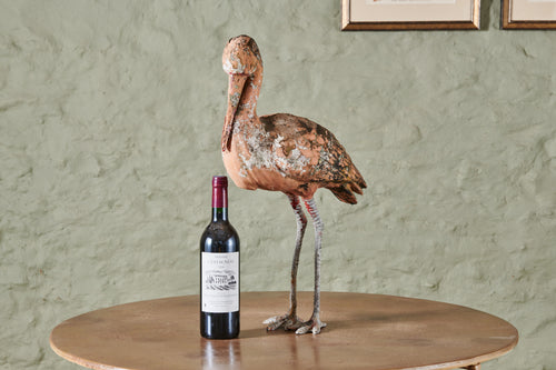 A rare garden stork made from zinc and painted in various different colours over the years. With weathering, this bird has developed an attractive plumage like patina and would like very attractive nestled in the undergrowth or besides a pond.